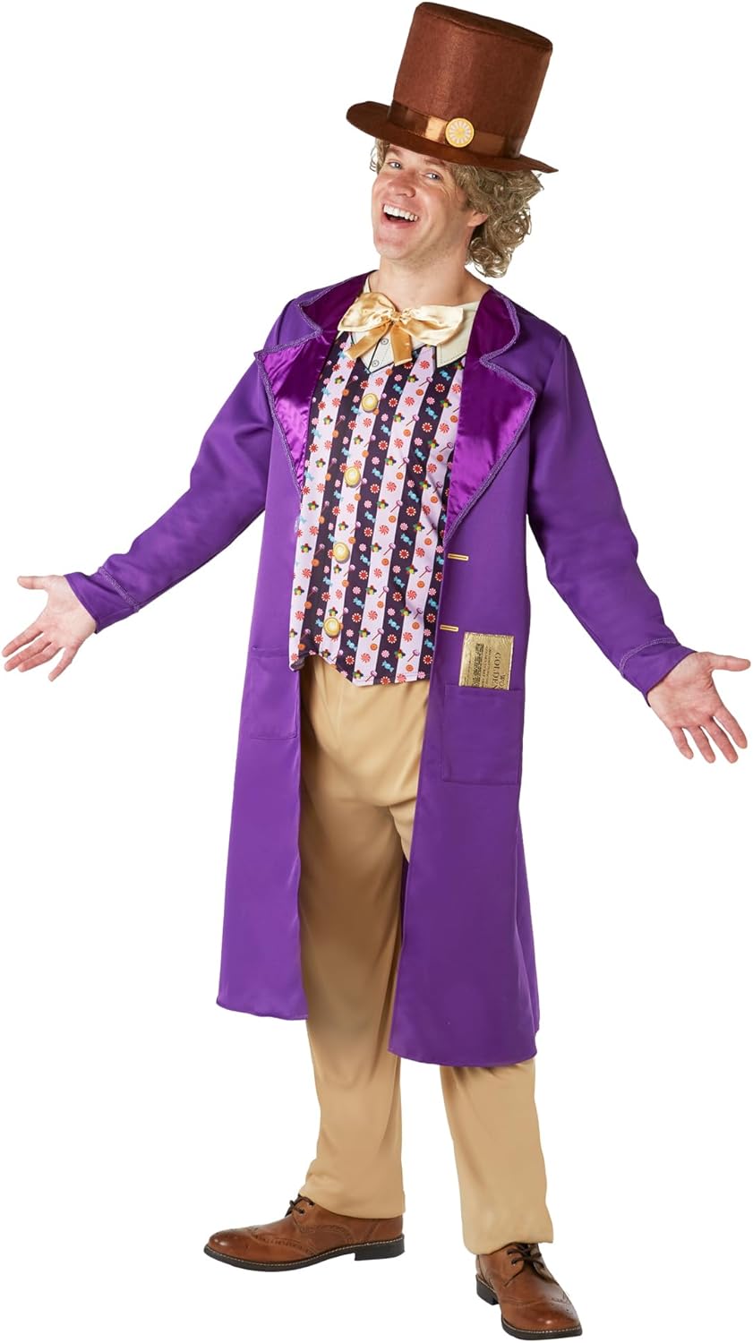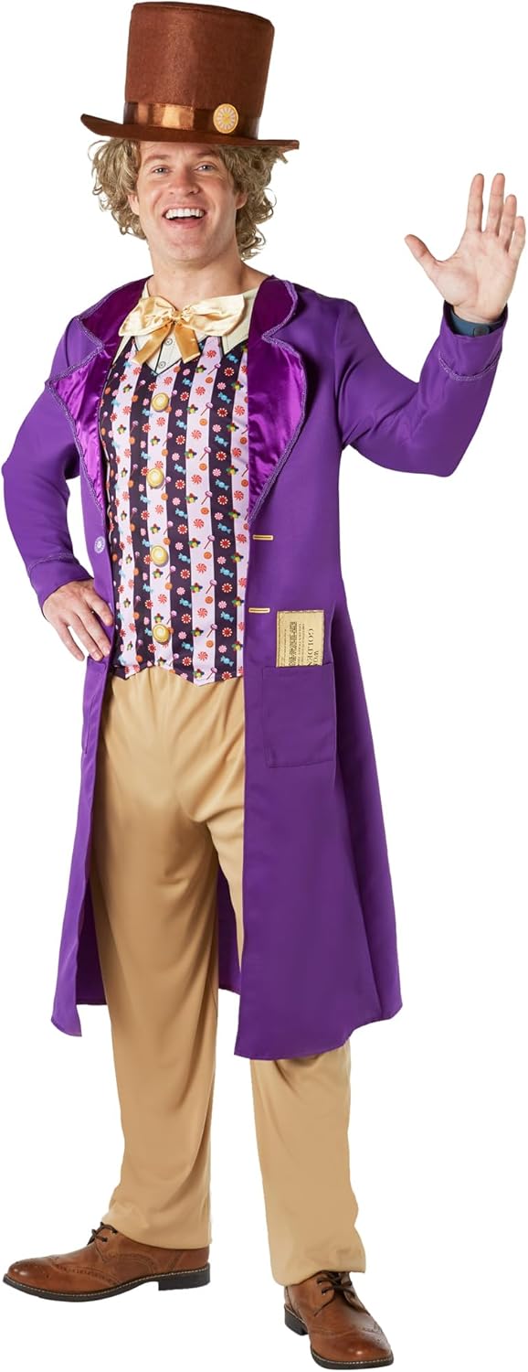 Costume ufficiale Charlie e la fabbrica di cioccolato per adulti, taglia standard/media Include - giacca con gilet attaccato, papillon, biglietto d'oro e cappello a cilindro. Prodotto con licenza ufficiale Rubie's testato secondo tutte le normative europee richieste Prodotto progettato negli Stati Uniti, tenere lontano dal fuoco Vestito ideale per feste a tema, Halloween e Giornata mondiale del libro