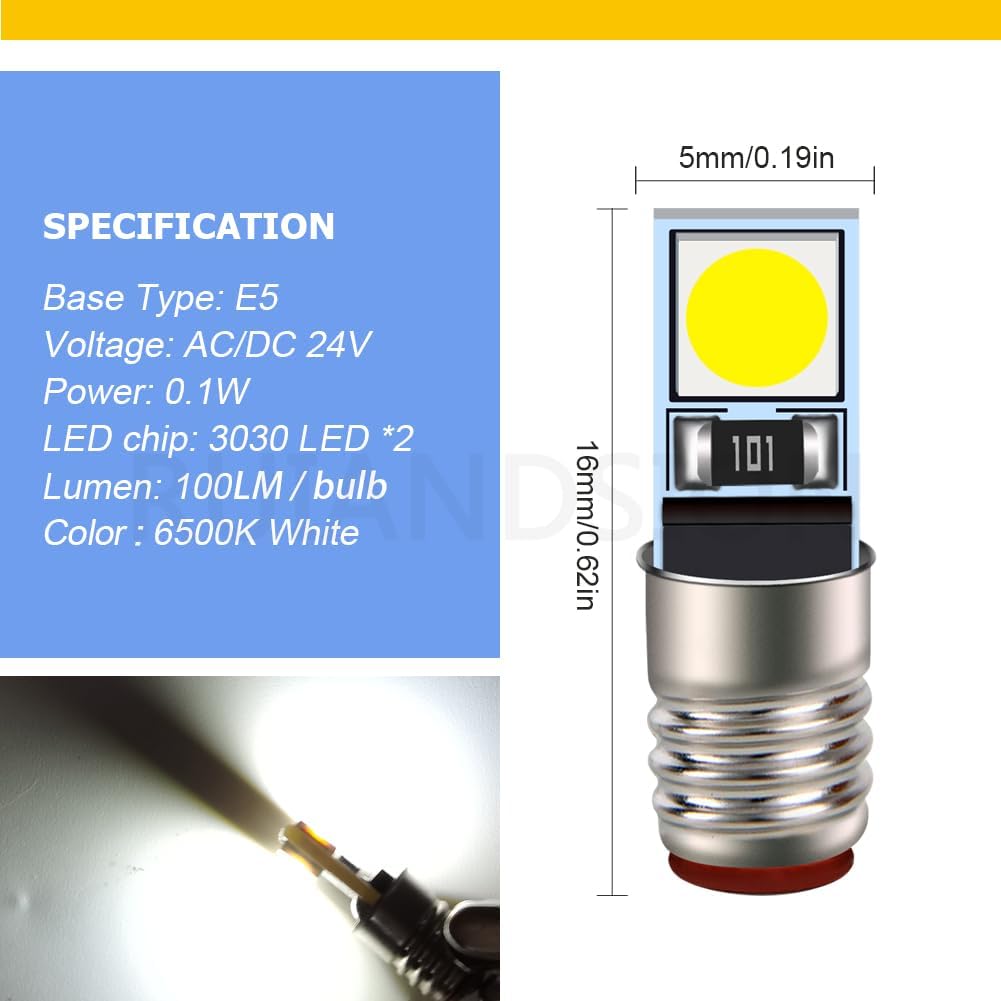【Applicazione】Questa lampadina LED E5 è utile nelle seguenti aree: layout di modelli di treni e architettura, layout di stazioni ferroviarie, modelli di automobili, modelli per progetti scolastici e pannelli ferroviari, progetti di costruzione, lampioni in case delle bambole in miniatura, teste di treni, vagoni merci e illuminazione di lettini per bambini, ecc. 【Modello】E5 E5.5; Colore: bianco 6500K. Lumen: 100LM Tensione: AC/DC24V, chip 3030 *2 【Facile Installazione】 Sostituire la lampadina svitando quella vecchia e inserendo la nuova lampadina LED. 【Vantaggi】 Rispetto alle lampadine tradizionali, le lampadine LED hanno una durata più lunga, con il chip LED che dura fino a 50.000 ore, producono meno calore, consumano meno energia e sono più comode da usare. 【Garanzia】Garanzia Ruiandsion per 1 anno dalla data di acquisto. Tipo di garanzia: Scambio o sostituzione.