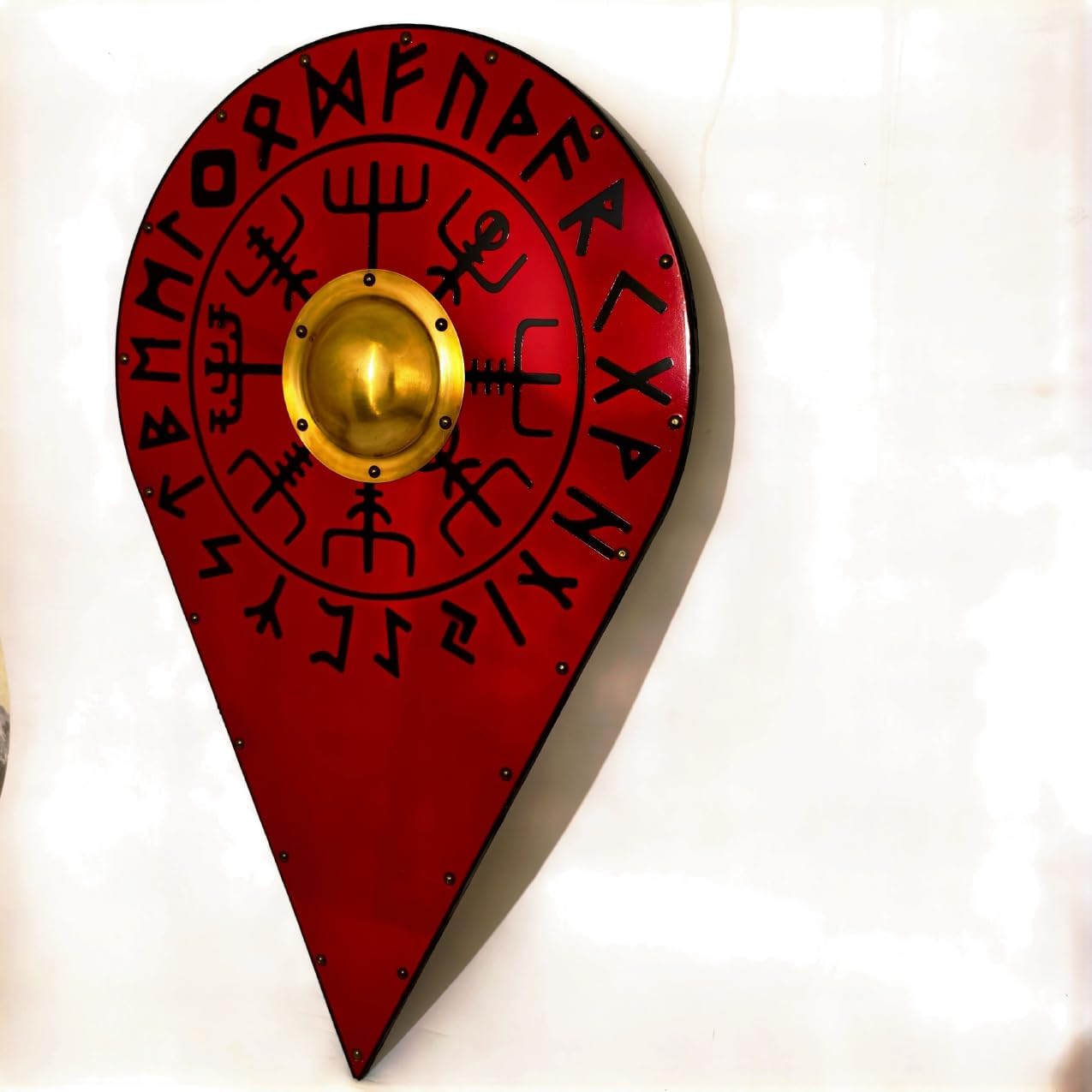 Runa vichinga Ragnar Lothbrok Elmo di Awe Aegishjalmur Norrena Red Wooden Enorme scudo aquilone Ideale per giochi di ruolo dal vivo (live action role playing), bambini, cosplay, Halloween, travestimenti, oggetti di scena teatrali e rievocazioni storiche. Regalo unico per collezionisti medievali: scudo vichingo può essere utilizzato anche in produzioni teatrali, feste di Halloween, feste in costume, giochi di vestire e molto altro ancora. Lo scudo sarebbe perfetto per il Festival del Rinascimento nella tua zona, alcune risse nel cortile tra amici, eventi LARP o rievocazioni storiche. Dai vita al tuo tema medievale, costume o produzione con questo squisito articolo realizzato a mano e rifinito La sua struttura leggera ti assicura di poterlo impugnare con facilità durante le tue epiche battaglie. Con il suo design indossato da battaglia, questo scudo ti farà sentire come un vero guerriero. Dimensioni: 91 x 61 cm Materiale: legno