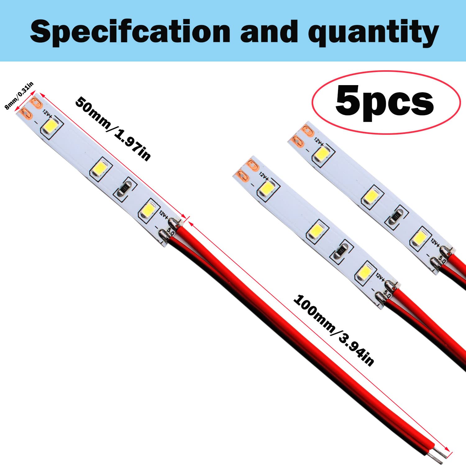 【Dimensione:】50*8mm Materiale striscia: Soft.Sorgente luminosa: LED SMD bianco 3528, resistore serie 1000ohm incorporato. 【Tensione】 CC 12 - 18 V. Corrente operativa: 20 mA tipica, 30 mA massima. 【Caratteristiche】 Angolo del fascio: 120°. Colore luce: bianco, con cavo (lungo circa 10cm). 【Contenuto della confezione】 Luci da casa modello 3 LED da 5 pezzi con cavo. Solo per adulti (dai 14 anni in su). Non adatto ai bambini 【Molti usi】 Illuminazione domestica a 3 LED Illuminazione per modellismo a LED per l'illuminazione di modellini di case, piattaforme, tettoie, modellini di vagoni.