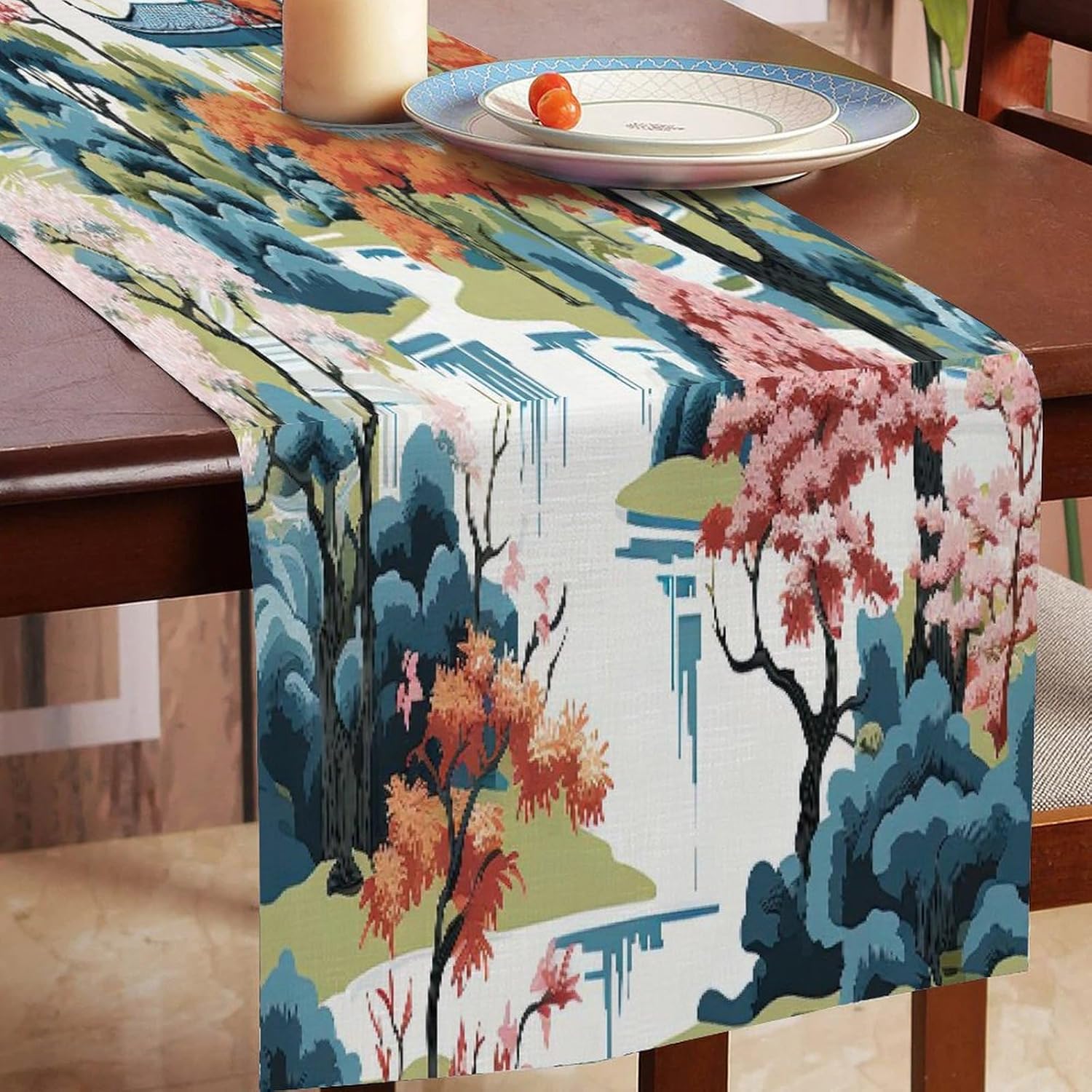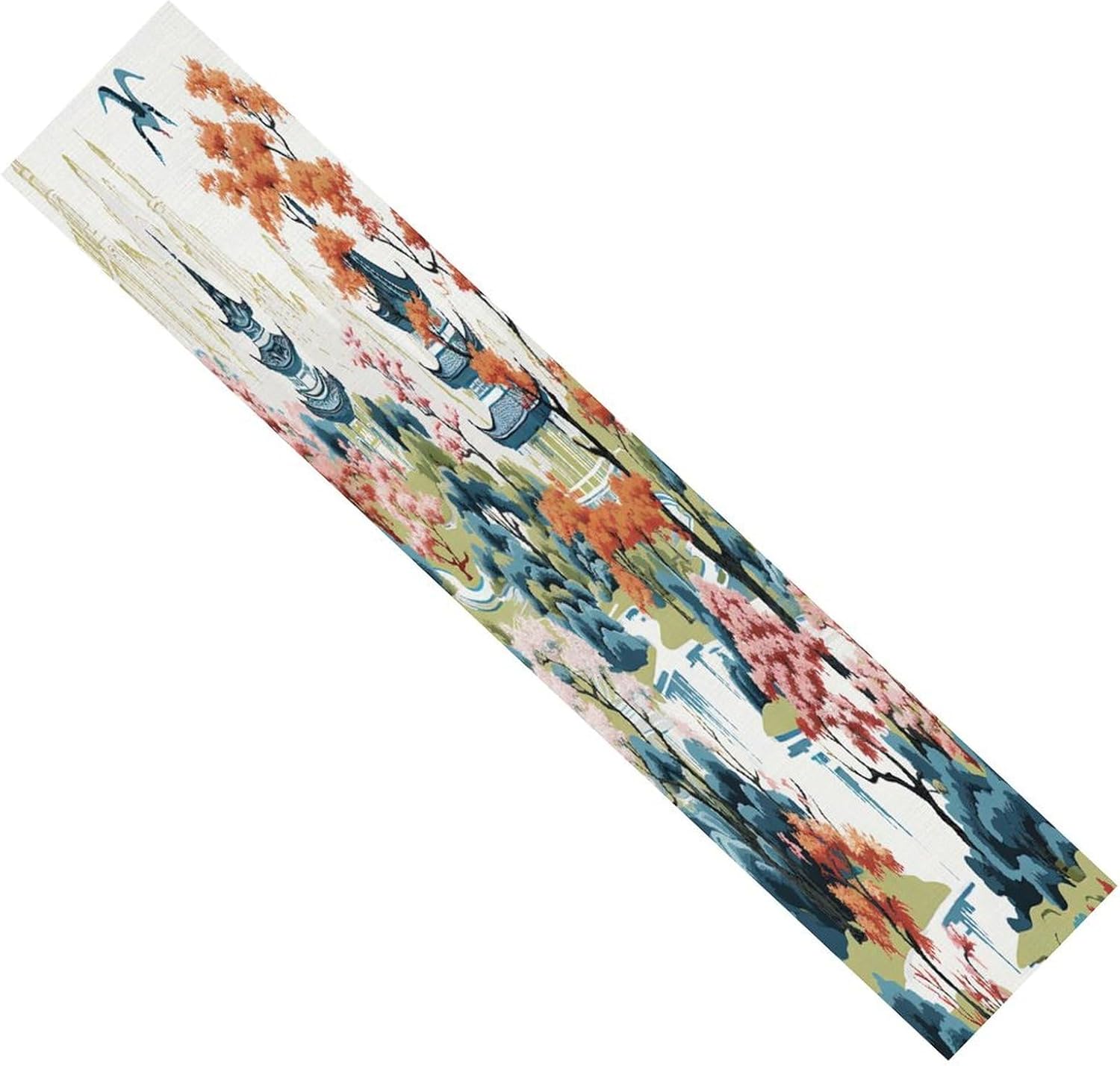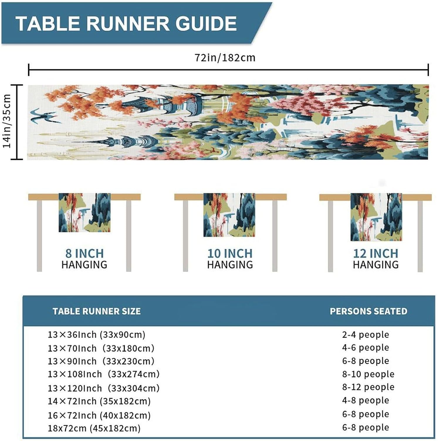 Runner da tavola asiatico Chinoiserie Pagoda Bianco Corallo Blu 14" x 72" Tappetino decorativo per cucina Sala da pranzo Feste Riunioni di famiglia Decorazione runner da tavola
