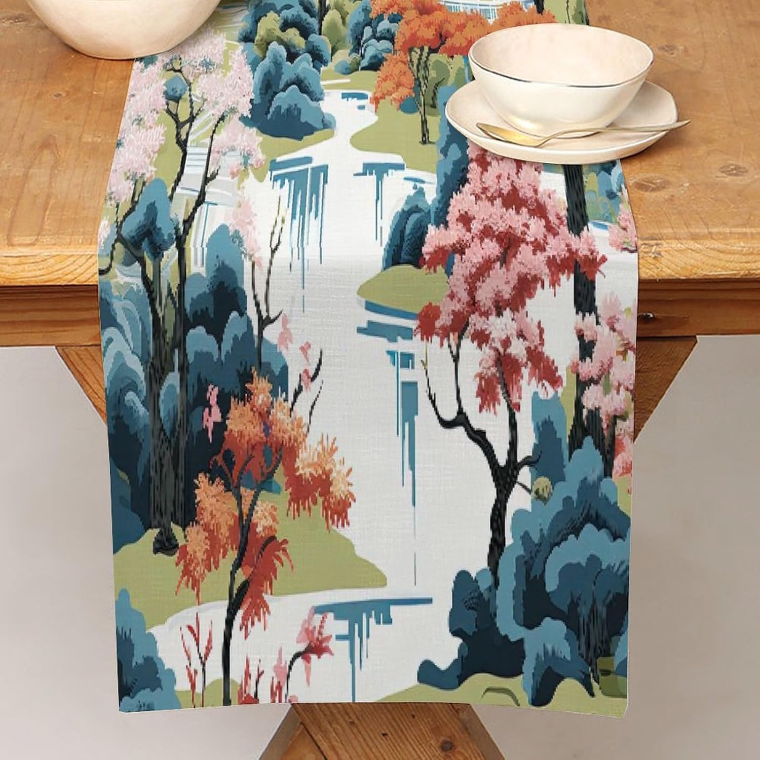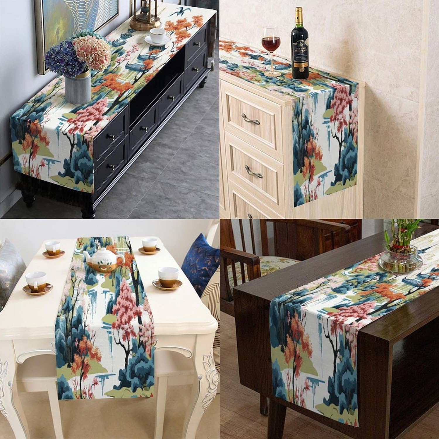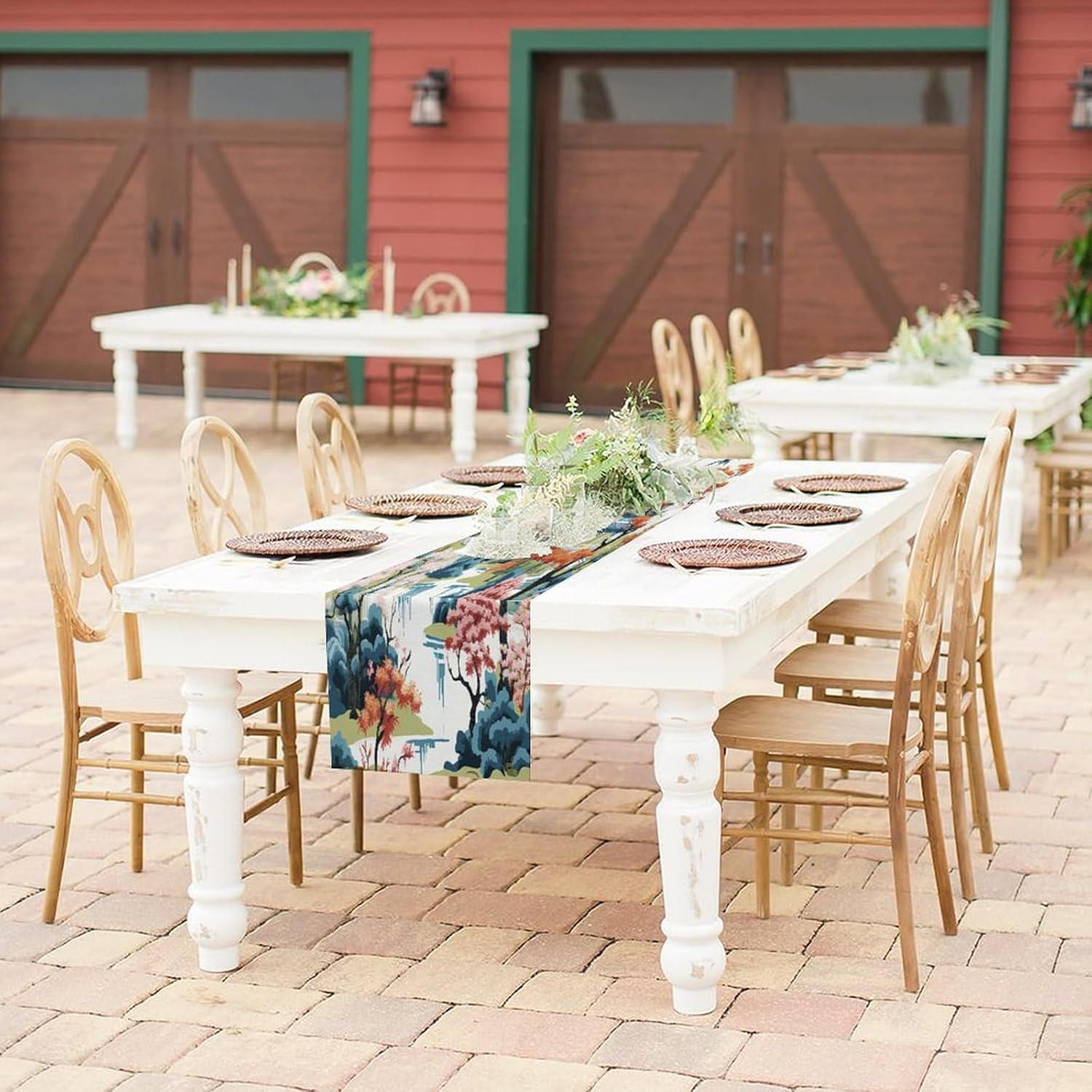 Runner da tavola asiatico Chinoiserie Pagoda Bianco Corallo Blu 14" x 72" Tappetino decorativo per cucina Sala da pranzo Feste Riunioni di famiglia Decorazione runner da tavola