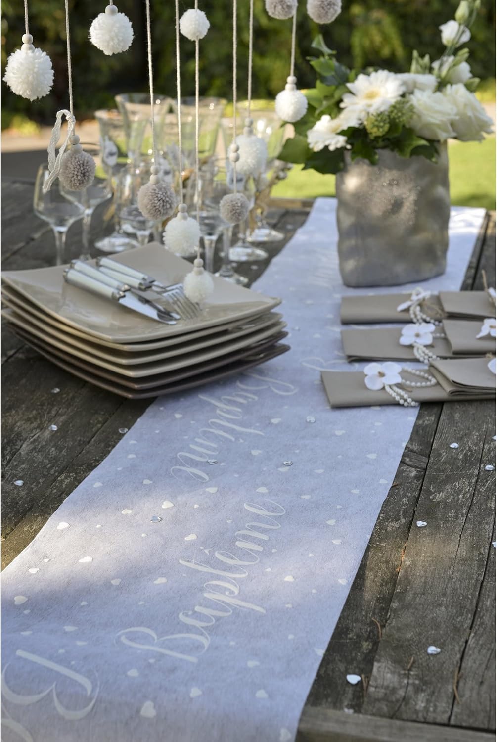 Runner da tavolo - Battesimo Questo runner da tavolo sarà l'ideale per completare la decorazione della tavola del battesimo. Basta srotolarlo per tutta la lunghezza del tavolo, ben centrato, e decorare con piccole decorazioni come confetti, ritagli, fiori freschi, candele o anche confetti. Il suo tessuto bianco è punteggiato di cuori argentati, lì si può leggere anche la scritta battesimo, rendendolo una decorazione che può essere utilizzata sia per i maschietti che per le femminucce. I vantaggi del prodotto: Design moderno ed elegante; Decorazione mista; Grande lunghezza. Dimensioni: lunghezza 5 metri e larghezza 30 centimetri. Vieni a scoprire tutti i nostri prodotti per un battesimo di successo cliccando qui.