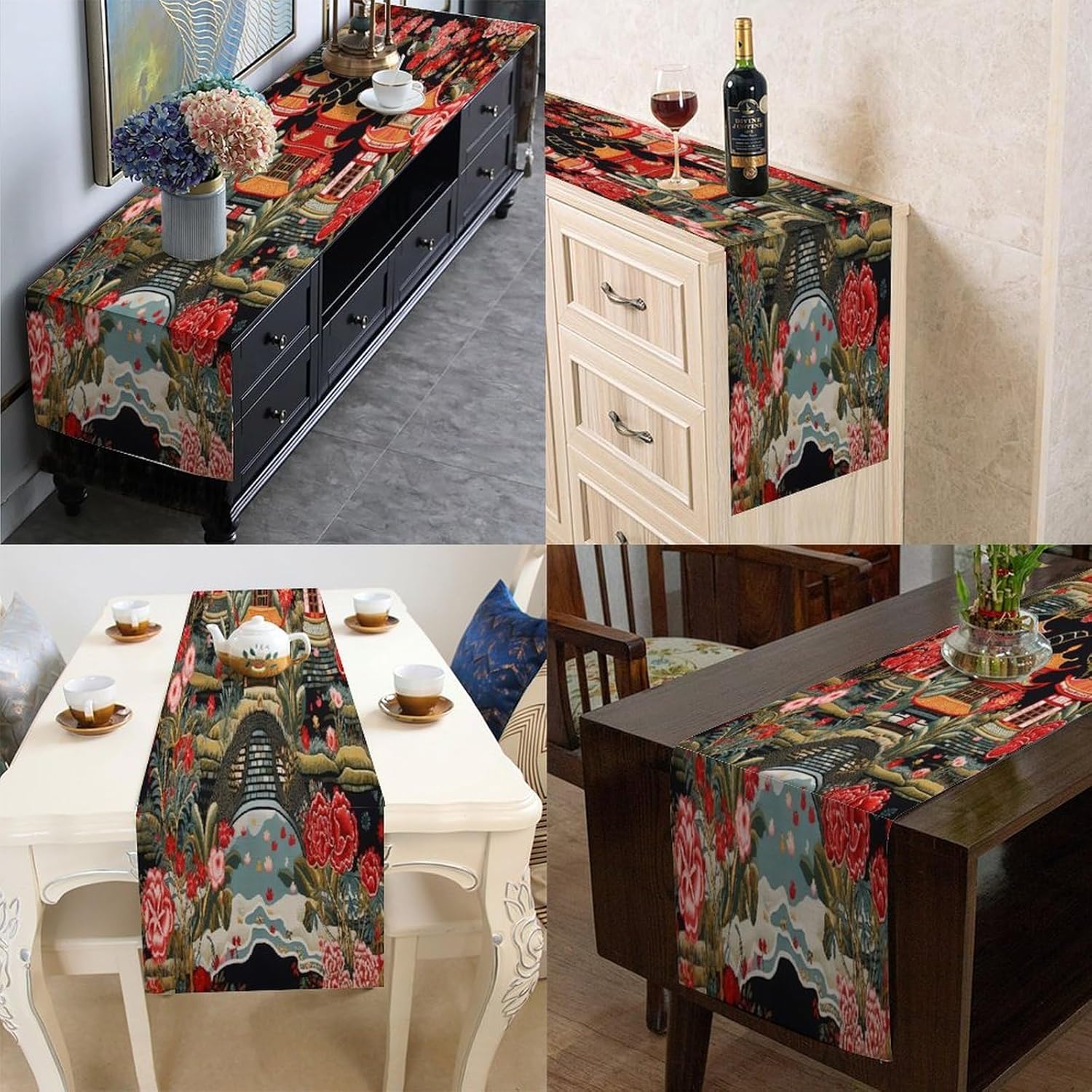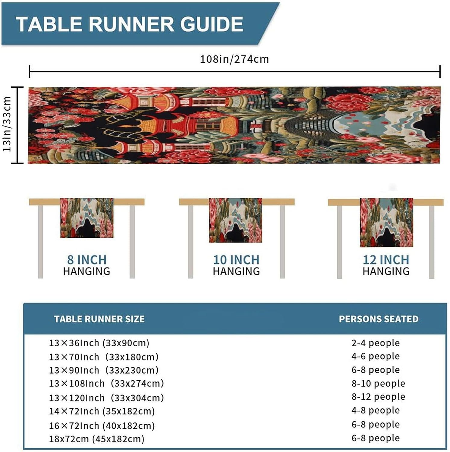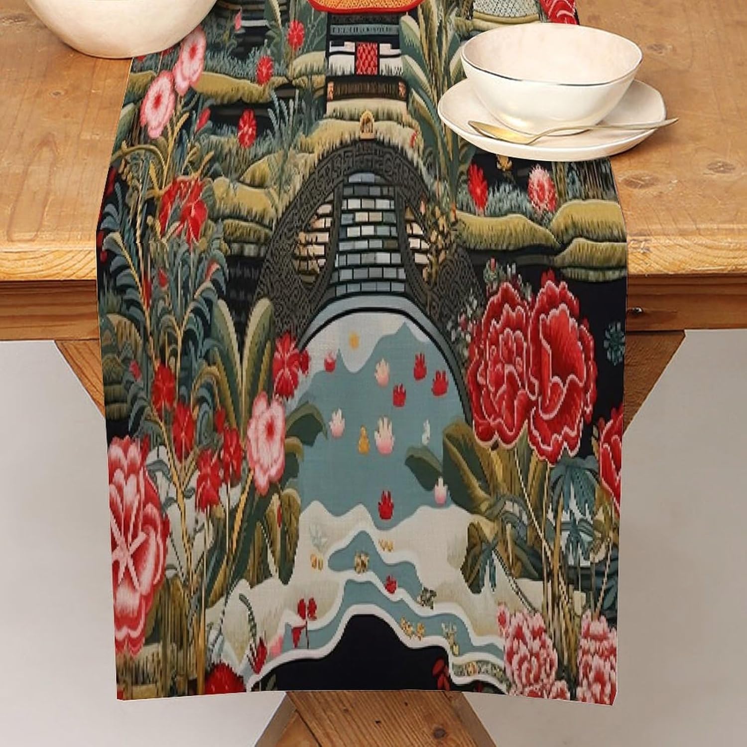 Runner da tavolo cinese Pagoda 13x108 pollici Tappetino decorativo da cucina Cucina Sala da pranzo Festa Riunione di famiglia Decorazione runner da tavola