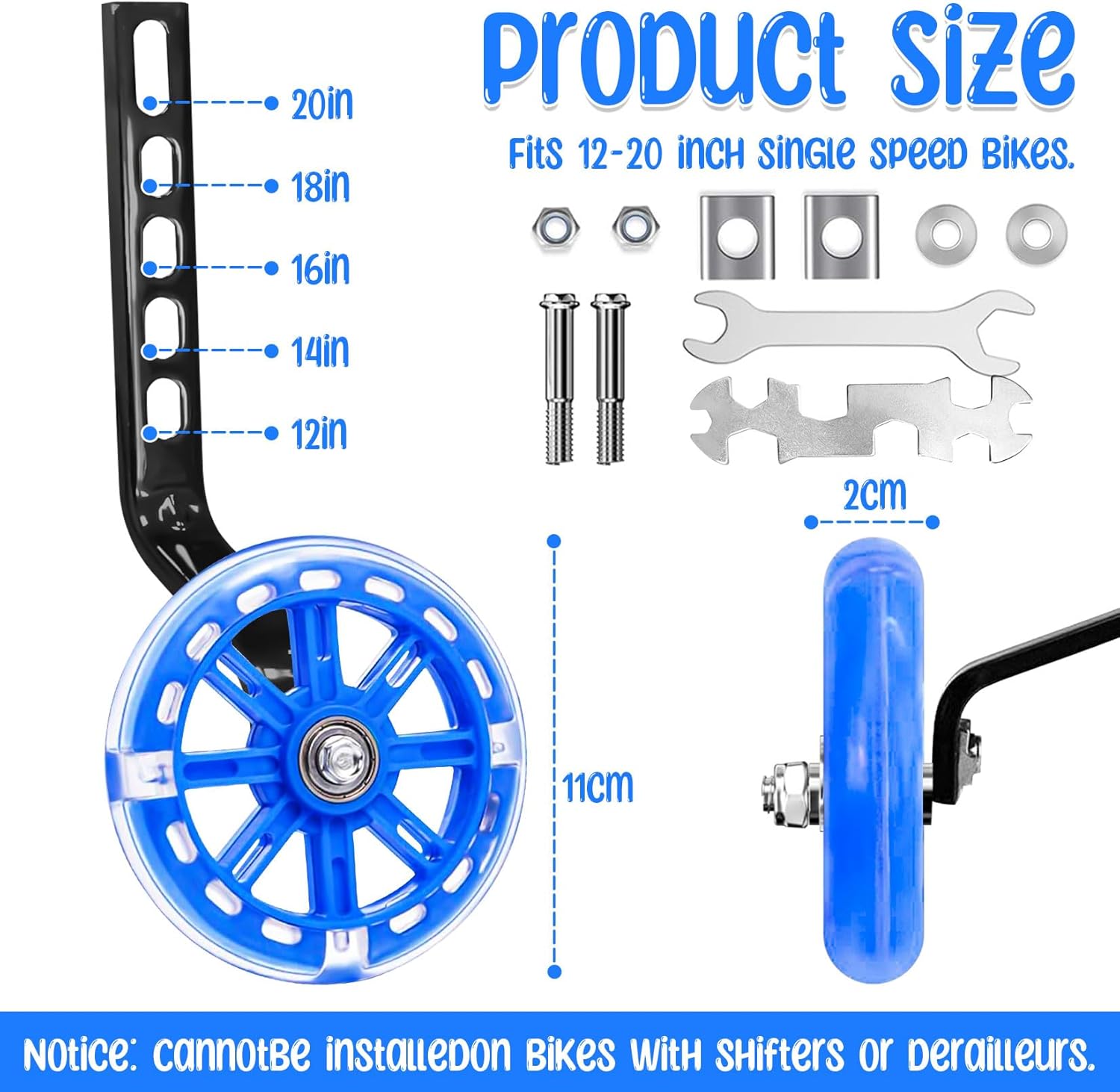 Kit ruota tastatrice economica: la nostra ruota tastatrice per biciclette per bambini contiene tutti gli strumenti di assemblaggio necessari, tra cui 2 ruote stabilizzatrici, 2 bracci di supporto verticali, 2 dadi di bloccaggio, 2 rondelle limite, 2 viti di fissaggio, 2 rondelle, 1 chiave regolabile e 1 chiave a tubo. Ciò rende il montaggio facile e veloce, così i bambini possono guidare in sicurezza. Silenzioso e di qualità premium: le nostre ruote da allenamento per bicicletta sono realizzate con supporti in gomma e metallo di alta qualità. Sono resistenti all'usura, antiscivolo e offrono una buona stabilità per un'esperienza di guida sicura. I cuscinetti in acciaio a doppio profilo garantiscono un uso regolare e duraturo e garantiscono un funzionamento silenzioso. Le ruote lampeggiano durante la guida, il che aumenta la sicurezza di notte o in ambienti bui e porta più divertimento ai tuoi bambini. Sicurezza e fiducia in se stessi: le nostre bici stabili per bambini sono progettate per i principianti. Aiutano i principianti a sviluppare un buon equilibrio sulla bicicletta e forniscono la sicurezza e la stabilità necessarie senza che i genitori debbano tenersi sulla sella posteriore. Così i bambini possono iniziare con sicurezza ed evitare cadute mentre vanno in bicicletta. Universale e regolabile: le ruote da allenamento universali si adattano a bici a velocità singola da 12/14/16/18/20 pollici con estremità della forcella orizzontale rivolta all'indietro, ma non adatte a persone con estremità della forcella semi-orizzontali o verticali. Non può essere installato su biciclette con deragliatori o trasmissioni. Adatto a ciclisti che pesano fino a 100 libbre. Per risparmiare tempo, controlla prima dell'acquisto se gli stabilizzatori sono adatti a te. Facile da montare. Passare il dado lungo attraverso la ruota di supporto e la barra di supporto, montare la rondella e il dado e serrarli. 2° Rimuovere il dado dell'asse posteriore dalla ruota della bicicletta, quindi montare il lato affilato del blocco di arresto sul telaio della bicicletta. 3. Scegliere la posizione corretta del foro sulla barra di supporto in base alle dimensioni della ruota della bicicletta. La ruota tastatrice dovrebbe trovarsi a circa 0,5 - 1 cm dal suolo.