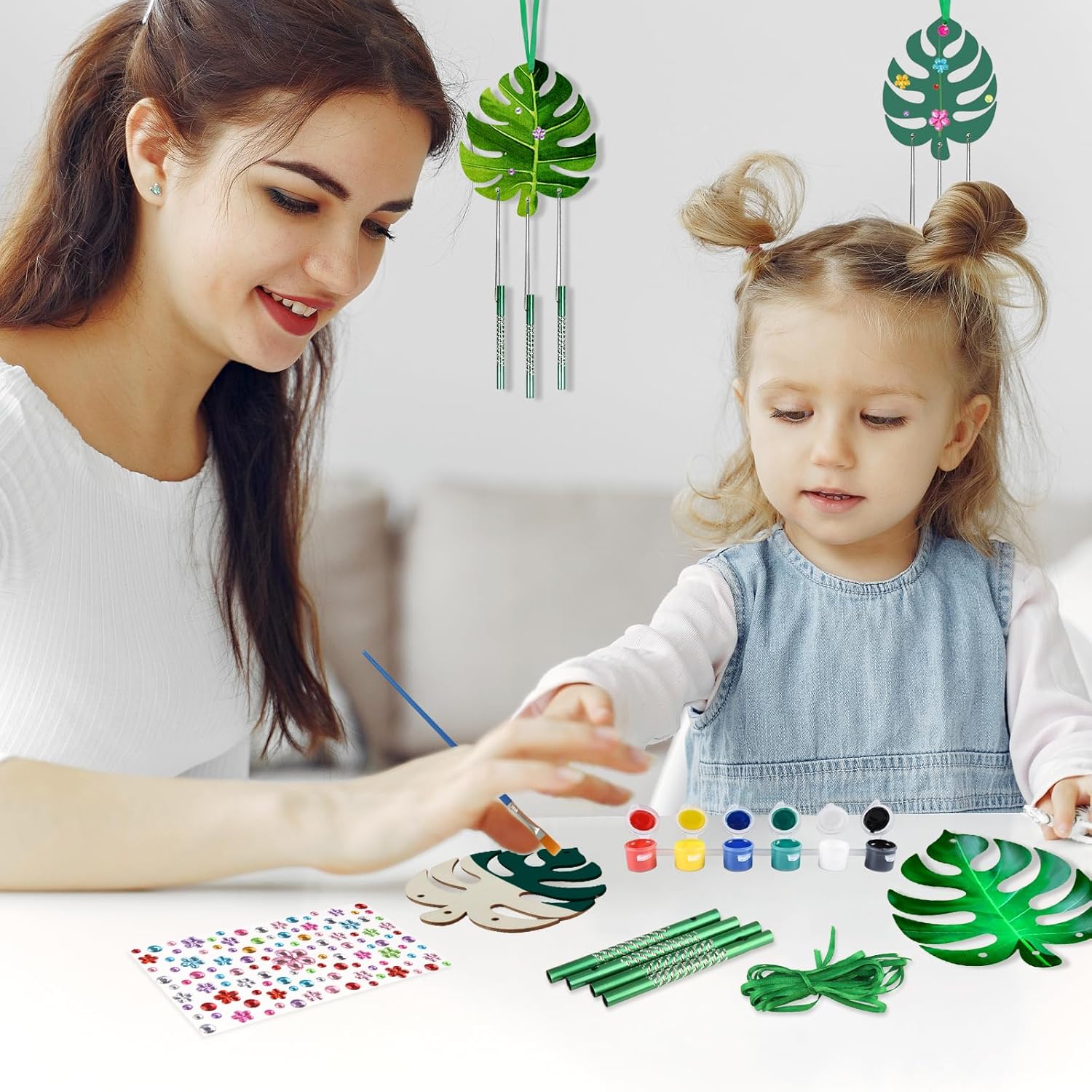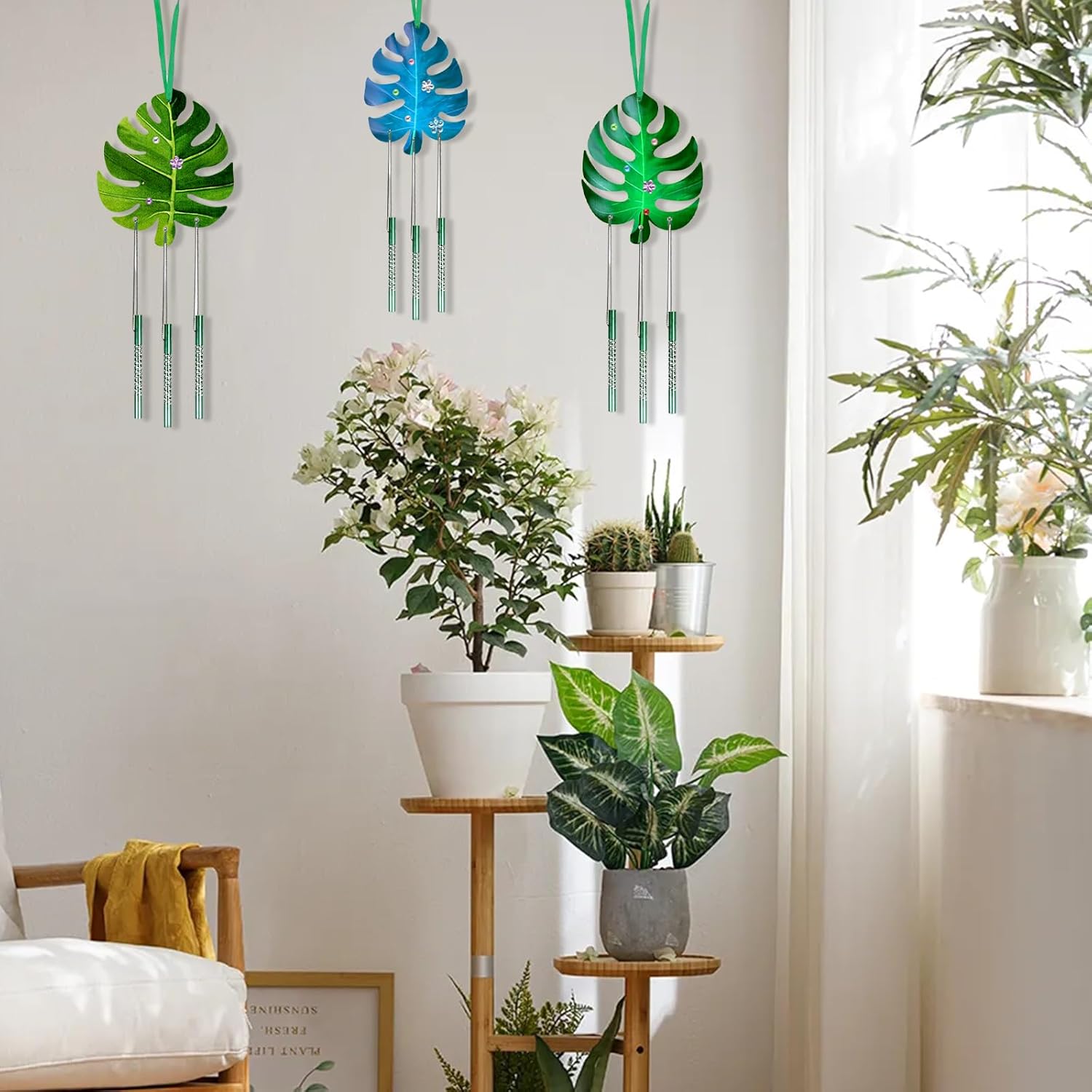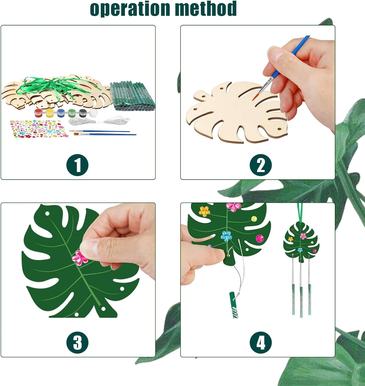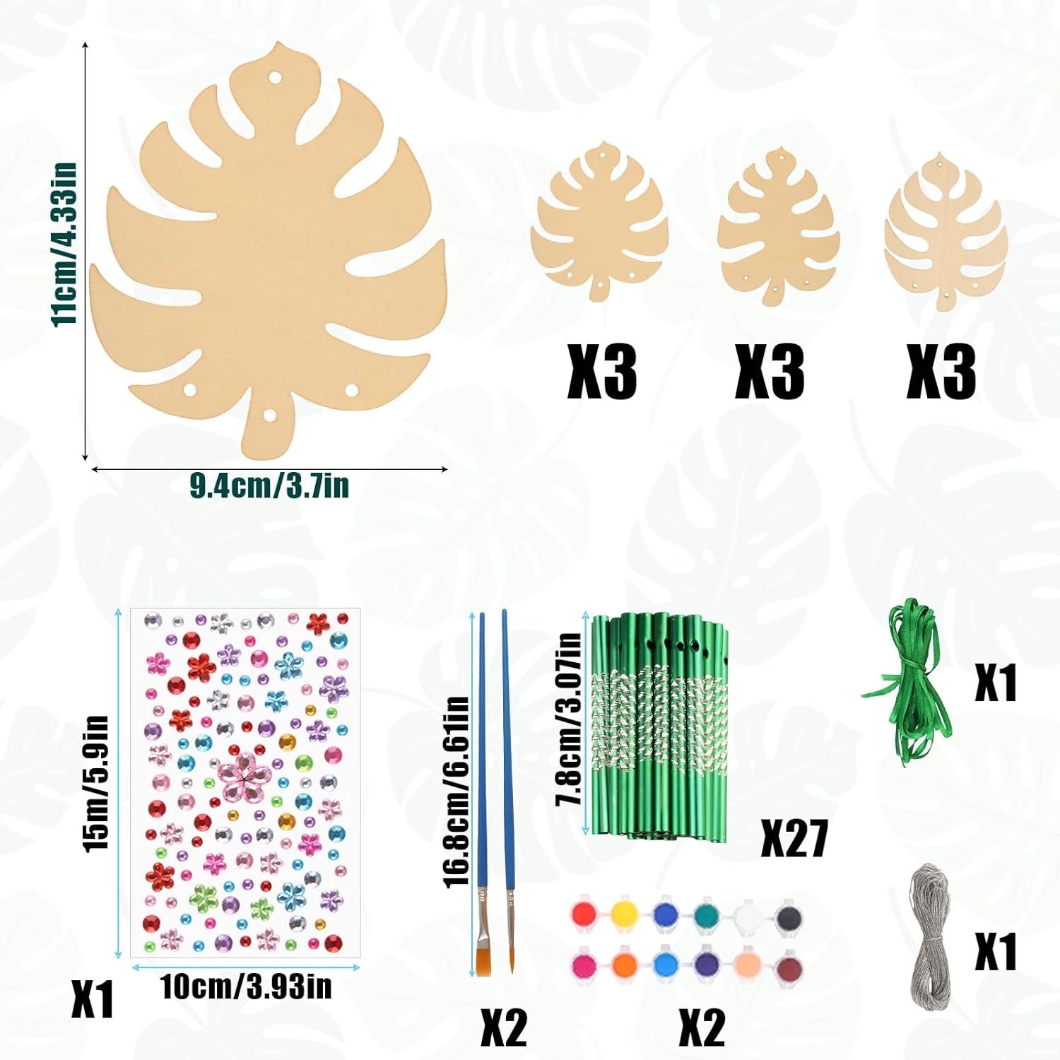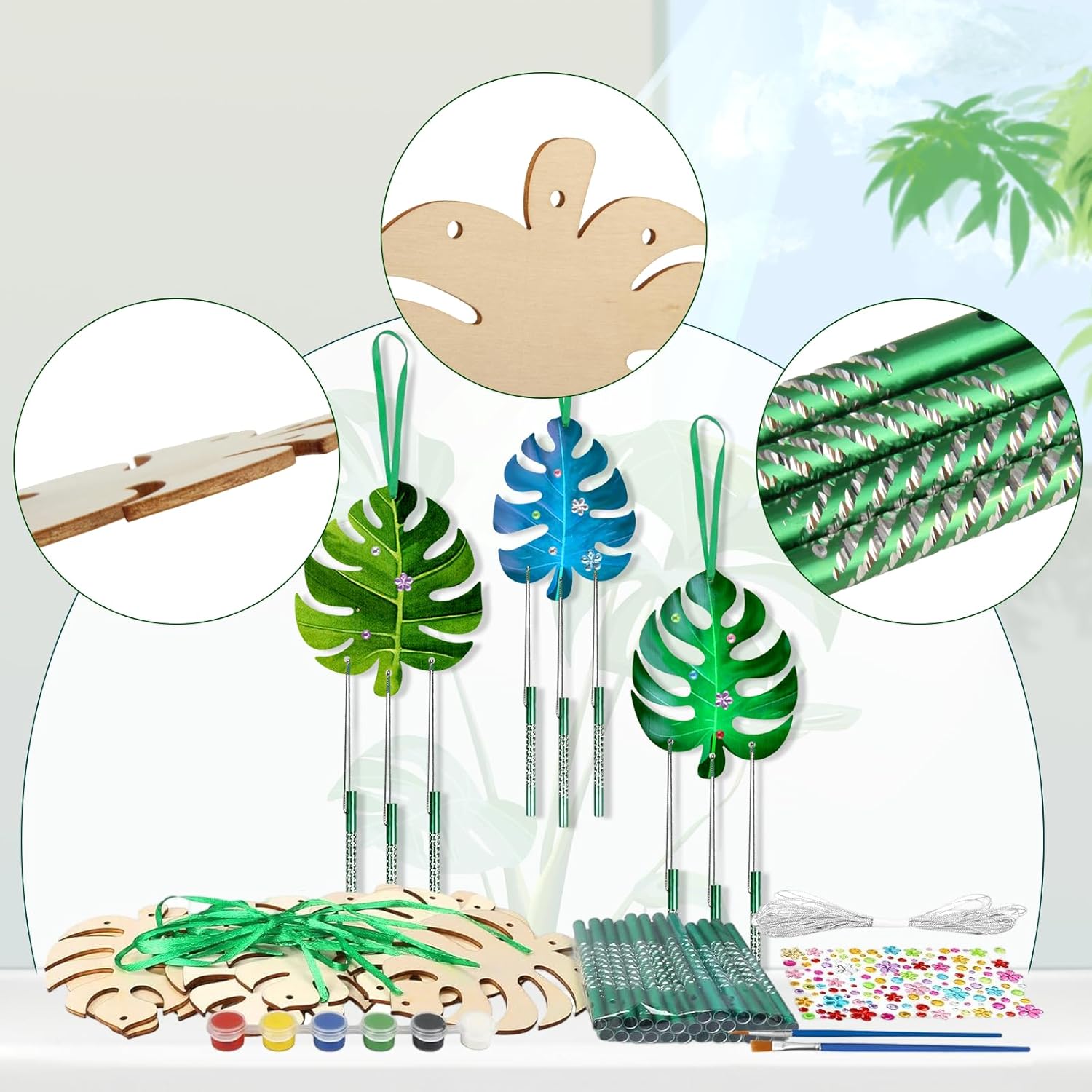 | Pièces incluses | 9 carillons à vent en feuilles Monstera, 27 tubes de carillon, 3 rubans verts, 1 corde argentée, 1 peinture acrylique, 2 pinceaux de peinture, 1 autocollant en strass |