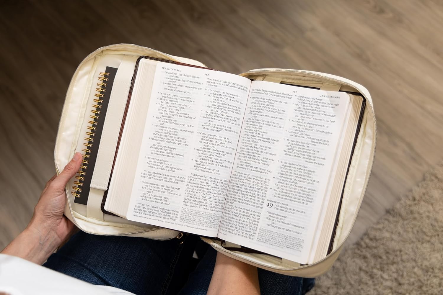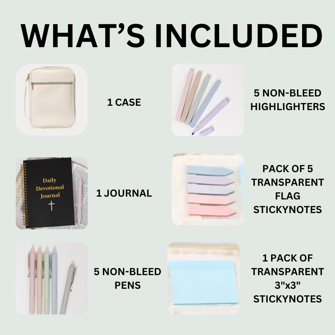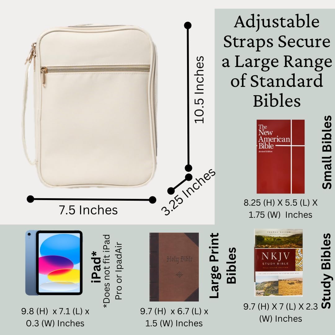 Due scomparti: organizza con facilità: questa custodia per il trasporto della Bibbia dispone di due scomparti per una conservazione ottimale. Tieni il tuo kit di diario completo in uno, la tua Bibbia nell'altra, con tasche aggiuntive per maggiore spazio di archiviazione Kit completo di diario incluso: la nostra copertina biblica viene fornita con un set completo di forniture per diario, tra cui un diario, penne senza sbavature, evidenziatori e foglietti adesivi trasparenti. Immergiti nei tuoi riflessi senza perdere un colpo. Cinghie regolabili: vestibilità sicura: il secondo scomparto è dotato di cinghie regolabili per garantire una vestibilità aderente per la maggior parte delle dimensioni della Bibbia. Non dovrai più preoccuparti che la Bibbia si sposti durante il trasporto. Versatile ed elegante: perfetta per tutti: che tu sia un appassionato di studio biblico, un frequentatore di chiesa o uno studente, questa custodia per il trasporto della Bibbia è progettata per tutti. Adatto per la maggior parte delle bibbie