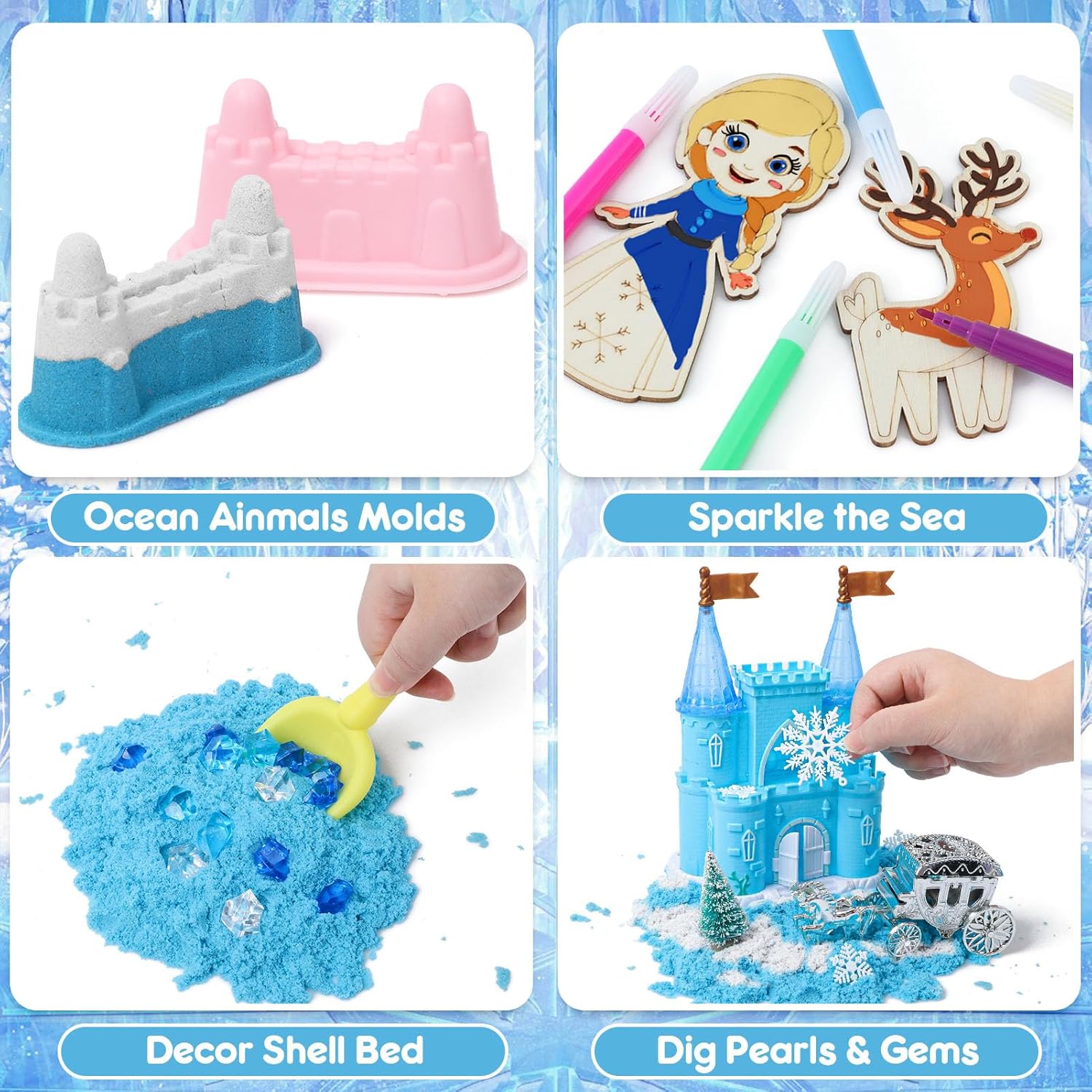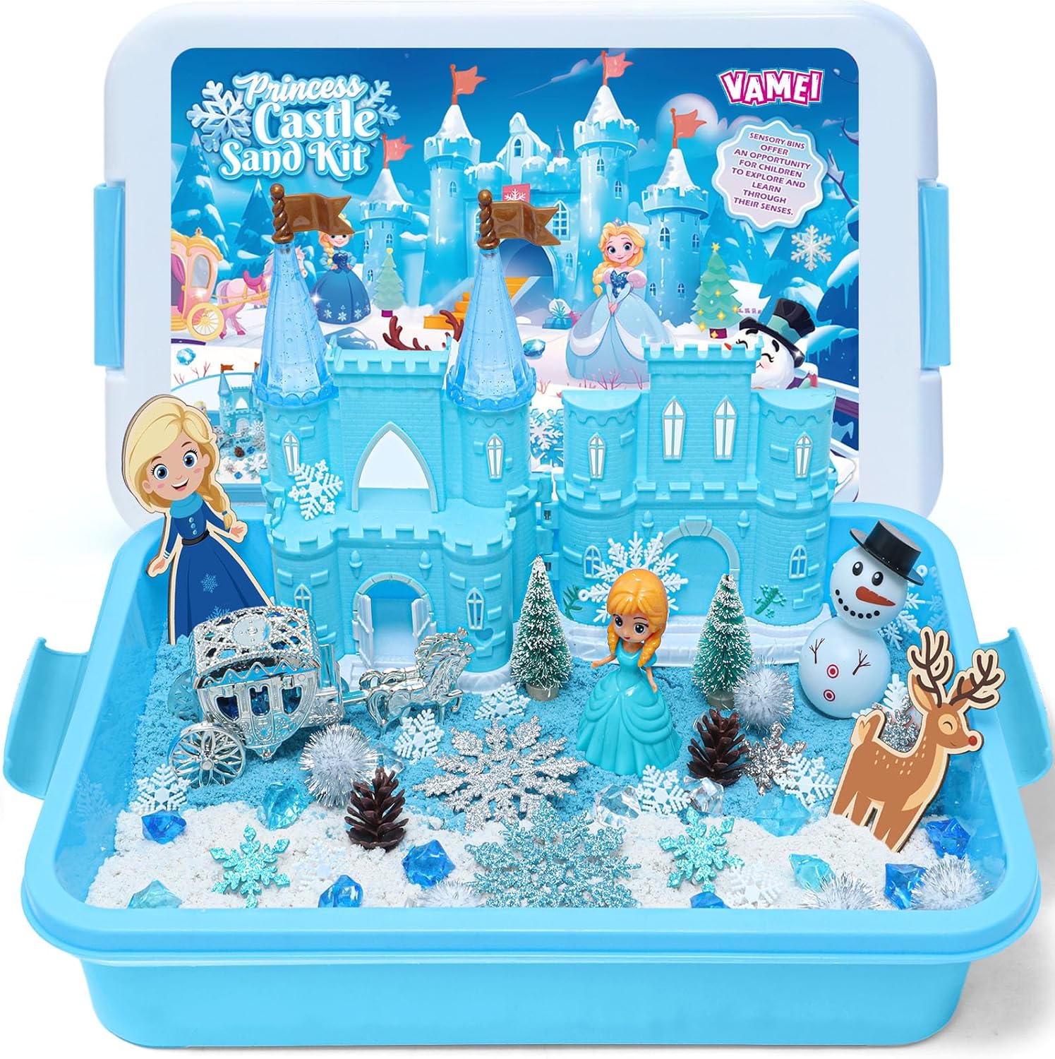 ☃ FROZEN PRINCESS MAGIC SAND: Questo set da gioco con sabbia magica contiene 900 grammi di sabbia magica in due colori (blu e bianco), 1 castello Isa, 5 stampi per sabbia, 10 giocattoli invernali (carro, pigna, albero di Natale, ecc.), 16 fiocchi di neve scintillanti, 20 gemme colorate, decorazioni scintillanti, 3 personaggi magici (principessa, pupazzo di neve, renna) e una custodia portatile. Questo set da gioco con sabbia colorata offrirà alla tua piccola principessa ore di divertimento. ☃ SABBIA MAGICA PER IL GIOCO SENSORIALE: La sabbia magica ha la consistenza e la fluidità della sabbia normale e la modellabilità della pasta da gioco. È facile da modellare, non si attacca e non si secca. La sabbia colorata stimola e delizia l'immaginazione e la creatività dei bambini. Possono afferrare, riempire, premere, lisciare, scavare e modellare la sabbia per costruire bellissimi paesaggi invernali e castelli. ☃ DIVERTENTE GIOCO DELLA REGINA DEL GHIACCIO: La nostra sabbia magica combina il tema dell'inverno con il gioco creativo, in modo che i bambini possano divertirsi con una varietà di giochi fai-da-te da colorare e con la sabbia. Non solo possono creare, ma anche costruire un magico mondo invernale. Ideale per il gioco di ruolo e per costruire fantastici paesaggi invernali. Ogni bambino amerà questo simpatico giocattolo invernale come regalo. ☃ DESIGN PORTATILE DELLA SABBIERA: Il prodotto è progettato come una sabbiera con coperchio e maniglia per una facile conservazione e trasporto. I bambini possono portare la sabbia magica ovunque per essere creativi in casa o all'aperto, e il design portatile è comodo per i genitori per risparmiare il fastidio della pulizia. ☃ REGALO PERFETTO PER I BAMBINI: Questo set magico è perfetto per i bambini che amano i temi invernali e il gioco creativo. Perfetto per bambini e bambine di 3, 4, 5, 6, 7, 8, 9 anni come regalo di compleanno, Pasqua, Halloween, Natale o Capodanno.