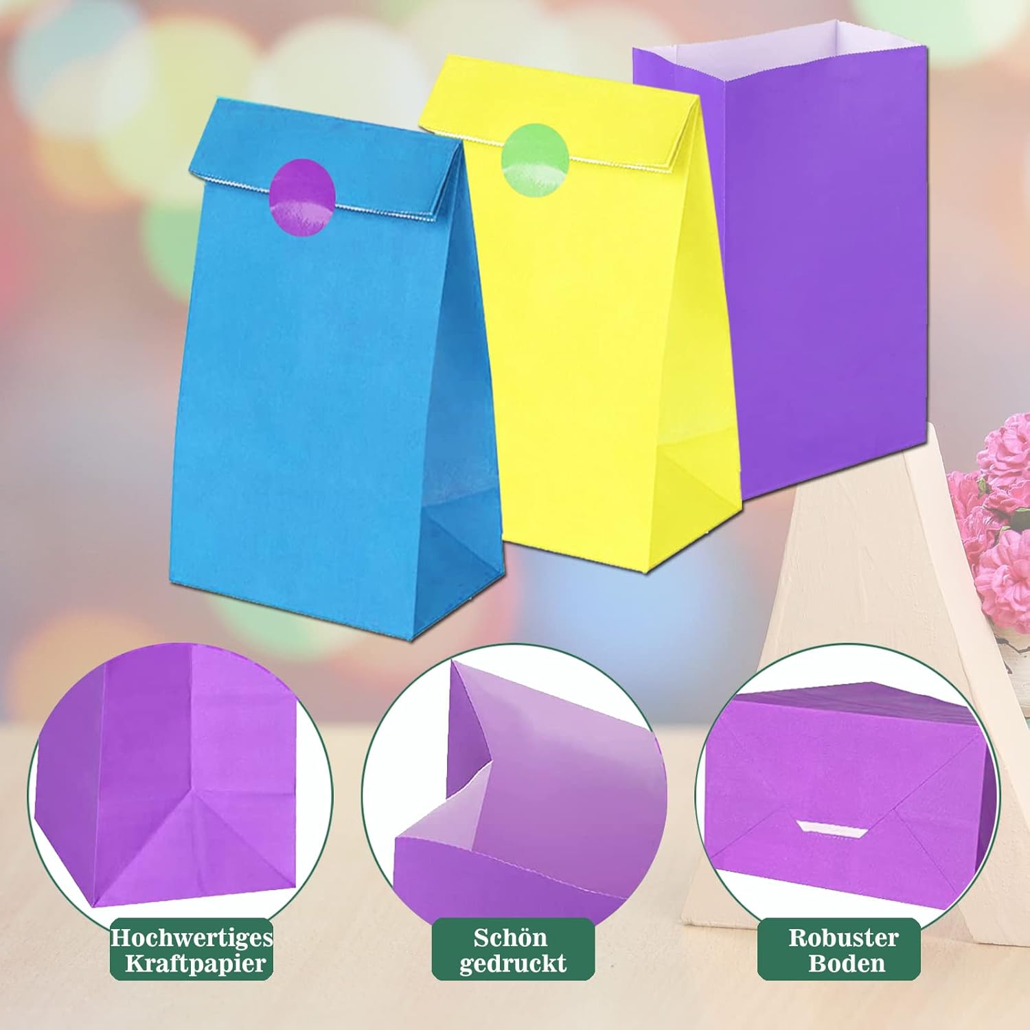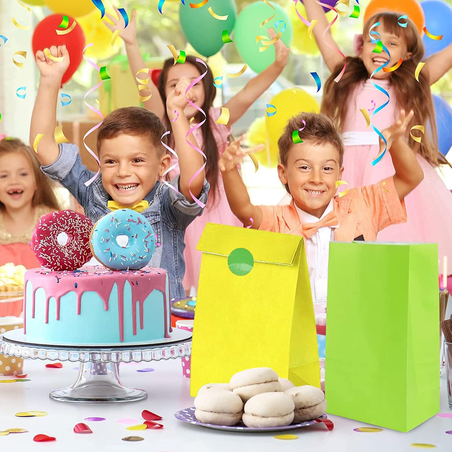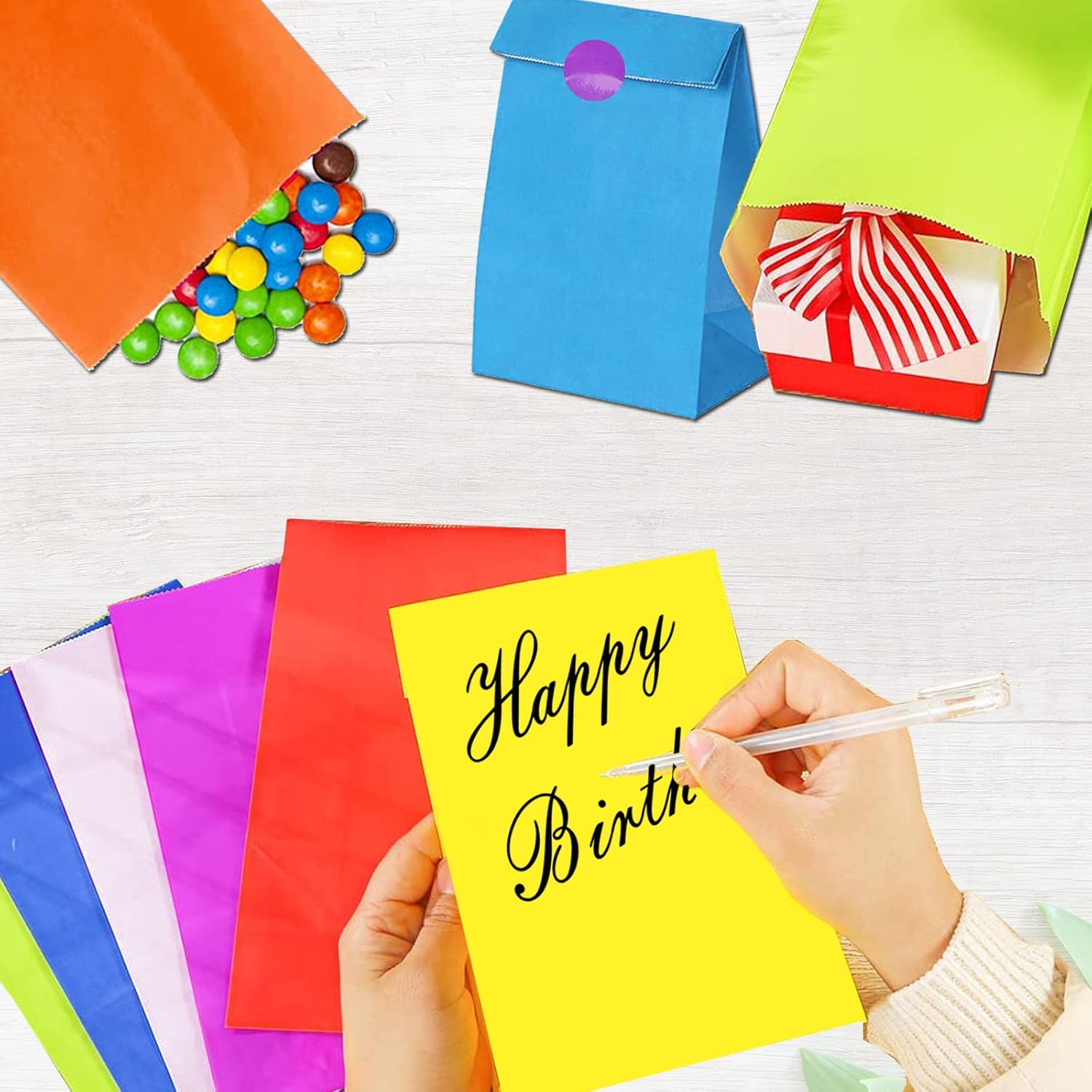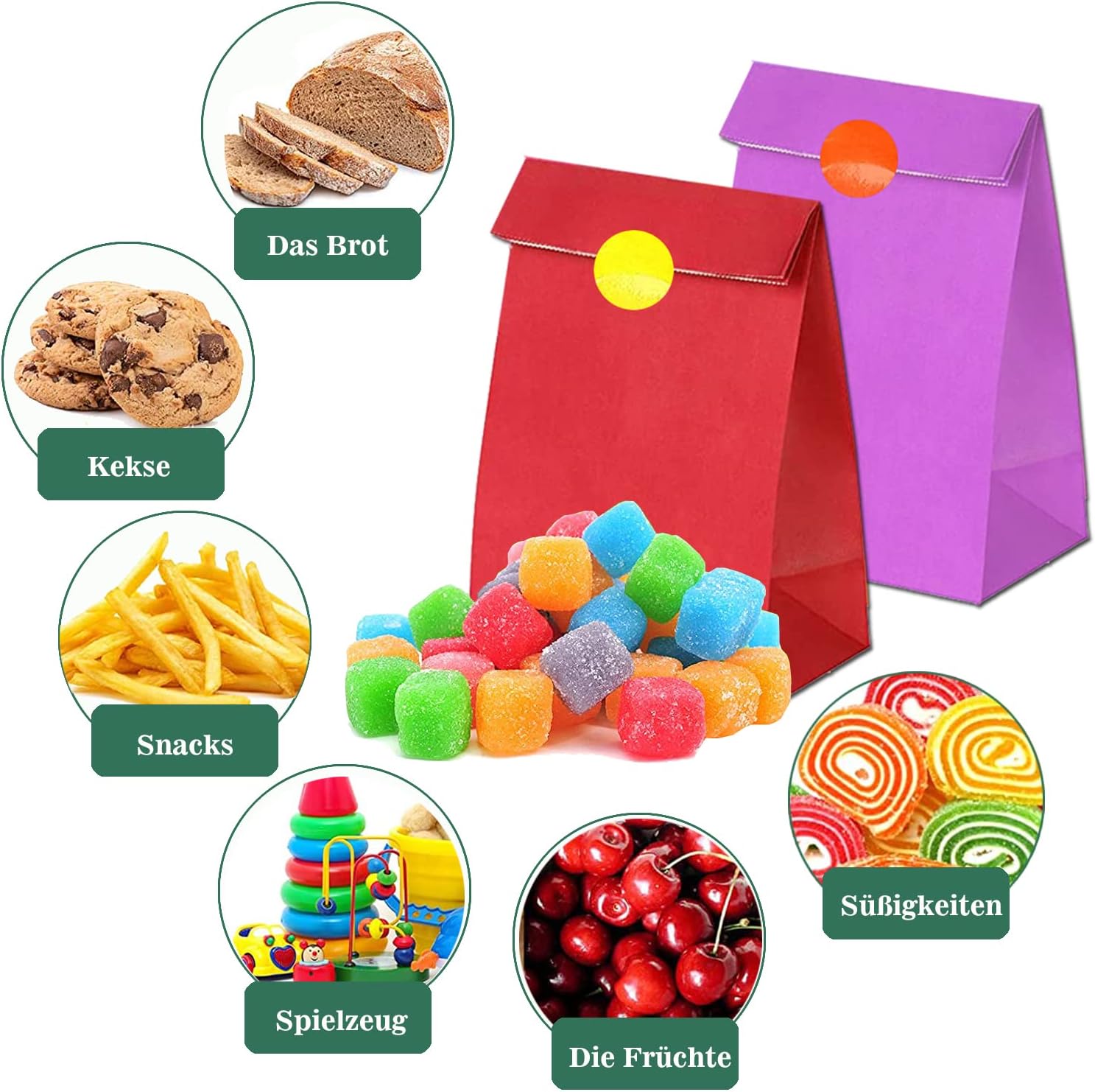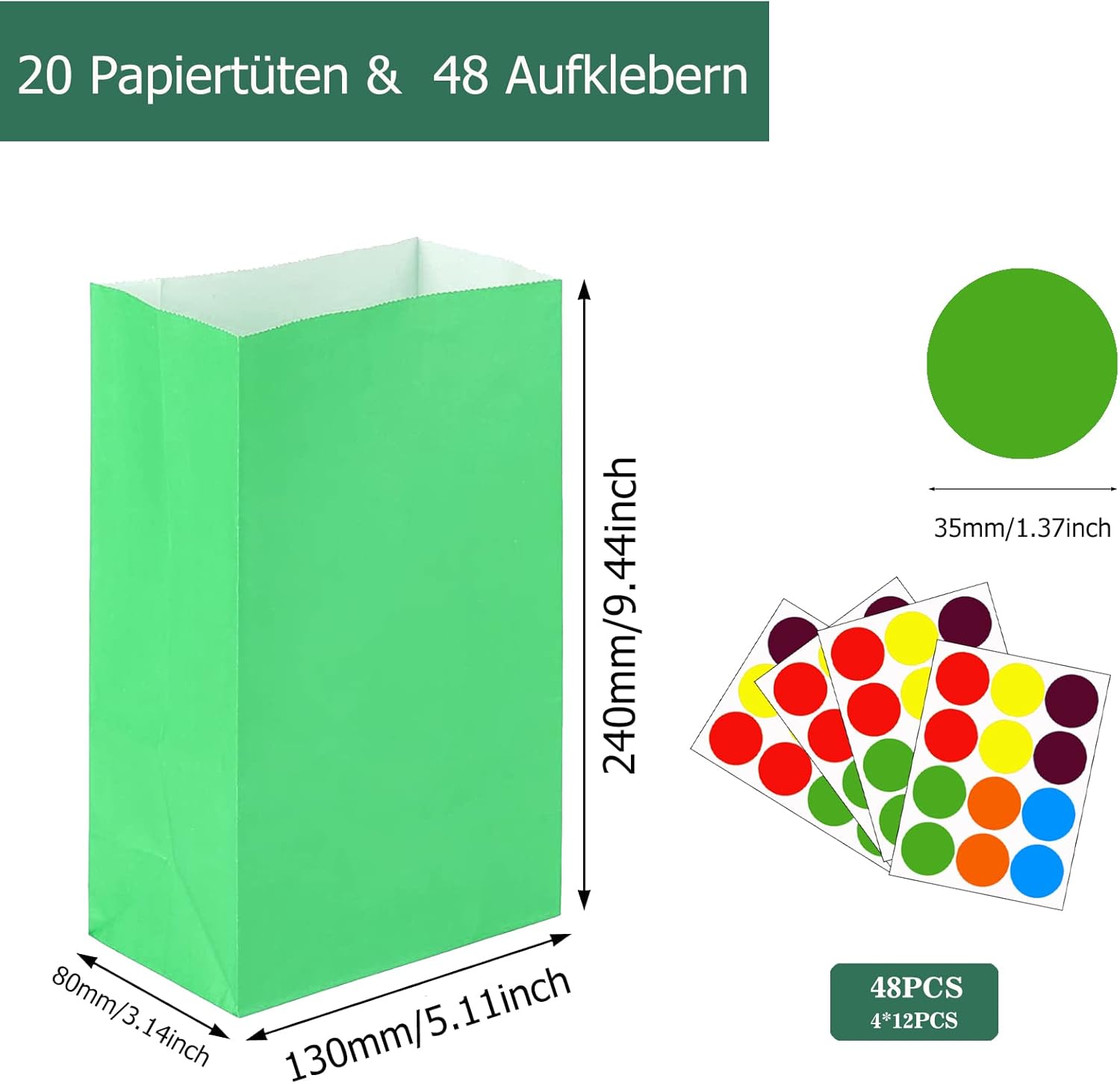 【Sacchetto regalo di carta】 Contiene 20 sacchetti regalo, per un totale di 10 colori senza motivi (rosso, verde chiaro, viola, blu zaffiro, rosa, arancione, giallo, verde erba, rosa rossa, blu cielo), ogni colore 2 pezzi, 48 pezzi adesivi rotondi. È bello usare questi sacchetti di carta colorati come sacchetti regalo per feste e mettere snack o souvenir nei sacchetti per i tuoi ospiti. 【Dimensione perfetta】 Ogni sacchetto regalo misura ca. 5,1 x 3,1 x 9,1 pollici / 13 x 8 x 24 cm (L x P x A), adatto per riporre piccoli oggetti. pieghevole per riporlo facilmente. Ogni etichetta adesiva ha un diametro di 3,5 cm, la dimensione adatta per sigillare i sacchetti di carta, rendendo il tuo imballaggio più comodo. 【Materiale di alta qualità】Sacchetti di carta kraft bianca ad alta resistenza con inchiostro a base d'acqua. Non è presente alcun rivestimento in lamina. Puoi piegarli e riporli dopo l'uso e conservarli per la prossima volta. Questi sacchetti di carta hanno un fondo piatto in modo che possano reggersi da soli. ideale per conservare pane, dolci, biscotti, dessert, colazione, ecc. Ampia applicazione: i sacchetti di carta sono adatti per feste di compleanno, matrimoni, riunioni di famiglia e altre feste, oppure possono essere utilizzati anche come sacchetti regalo per riporre piccoli giocattoli, torte, dolci e altro, perfetti per l'uso quotidiano. Utilizzabile come sacchetto regalo per piccoli giocattoli, piccole torte, caramelle, ecc.
