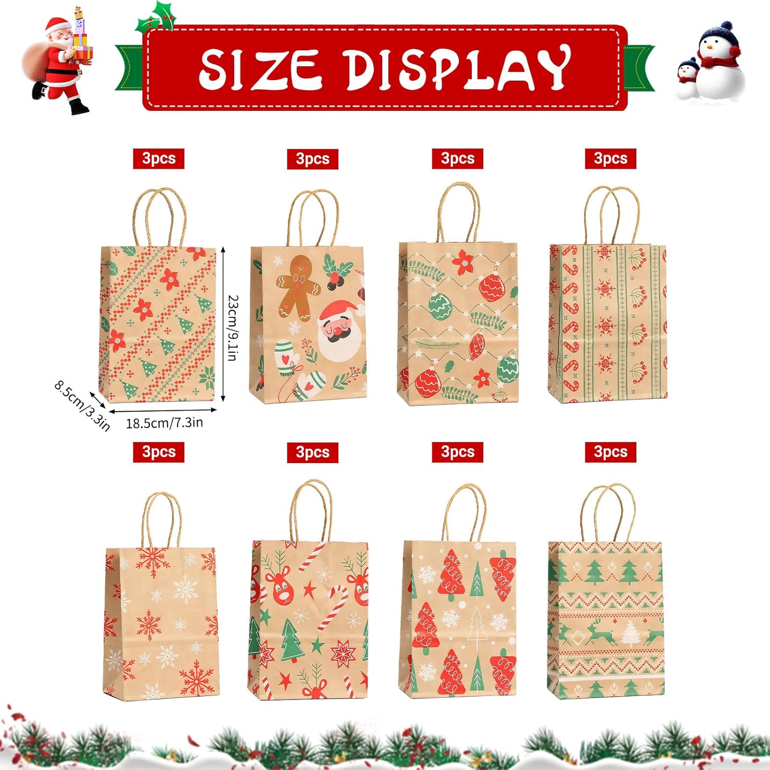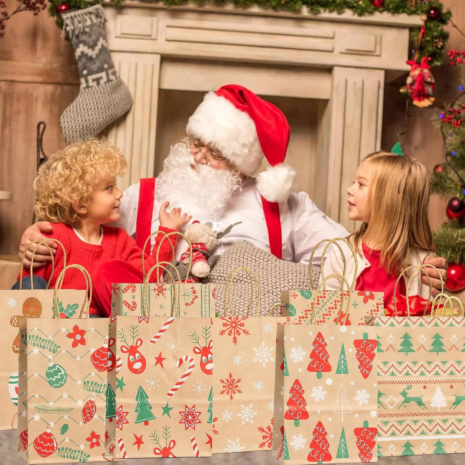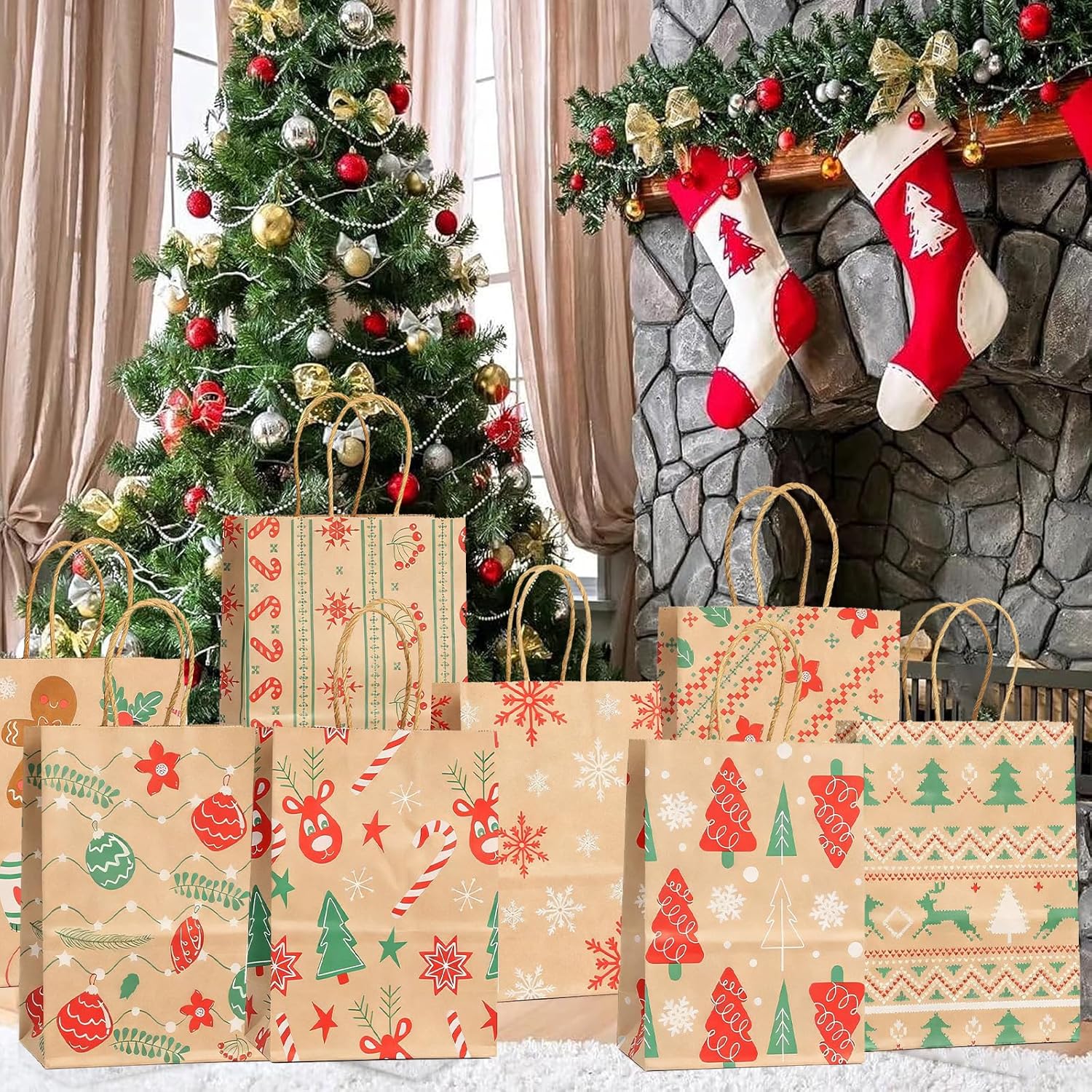 Sacchetti di carta natalizi con manici: Il prodotto include 24 sacchetti di carta natalizi, stampati in 8 stili diversi, 3 pezzi per ciascuno, con classici elementi natalizi, fiocchi di neve, omini di pan di zenzero, albero di Natale e Babbo Natale ecc. Il manico e il sacchetto sono saldamente collegati, puoi sollevare le cose più facilmente Sacchetti di Natale in carta kraft: questi sacchetti di carta sono realizzati in carta kraft di alta qualità da 120 g/m². La maniglia è durevole, spessa e resistente e le dimensioni del prodotto sono 23 x 18,5 x 8,5 cm e soddisfano le tue esigenze quotidiane. Può essere riutilizzato molte volte, economico ed ecologico. In questo modo proteggi l’ambiente, ma anche il tuo portafoglio. Sacchetti di carta per Natale: puoi usare i robusti sacchetti con fondo per regalare belle sorprese durante il periodo natalizio con piccole sorprese e piccole cose varie come libri di folletti, cioccolato, macchinine, pasta giocattolo, biglie. Puoi scrivere, disegnare, dipingere, stampare e decorare queste borse di carta per personalizzare le borse e renderle uniche. Borse di carta con manico: le nostre borse di carta natalizie presentano elementi natalizi stampati, il che rende le nostre borse di Natale la prima scelta per l'imballaggio nel periodo natalizio. Aggiungono un'atmosfera natalizia più forte alle tue attività e portano più sorprese ai tuoi bambini e amici Ampiamente usato: può essere usato per fare sorprese natalizie, biscotti, giocattoli, cosmetici, pasticcini, gioielli, per conservare bevande, ecc. I sacchetti natalizi in carta kraft possono essere usati come decorazioni natalizie, ma anche come borse per la spesa per l'uso quotidiano, sia pratiche che rispettose dell'ambiente