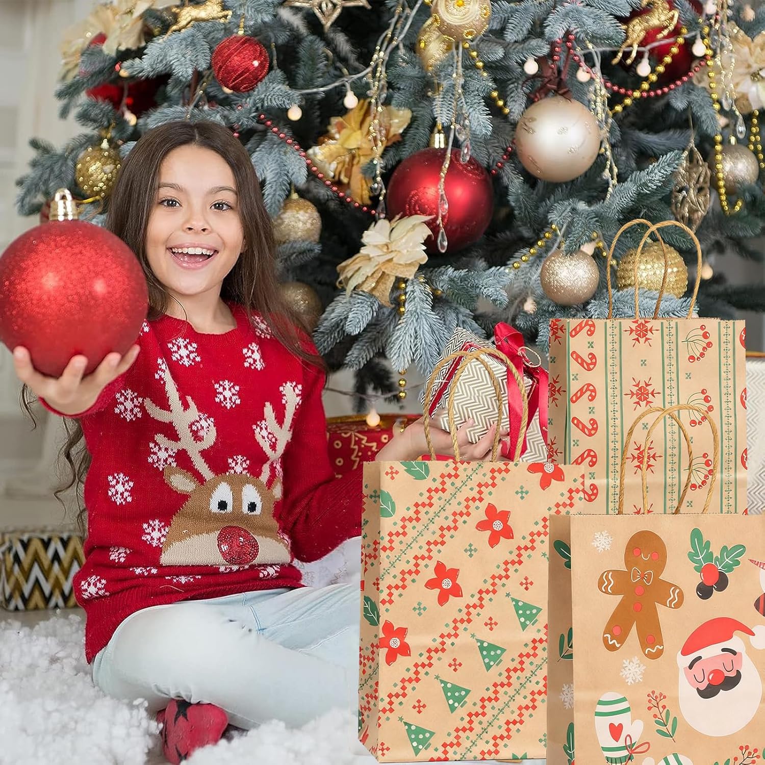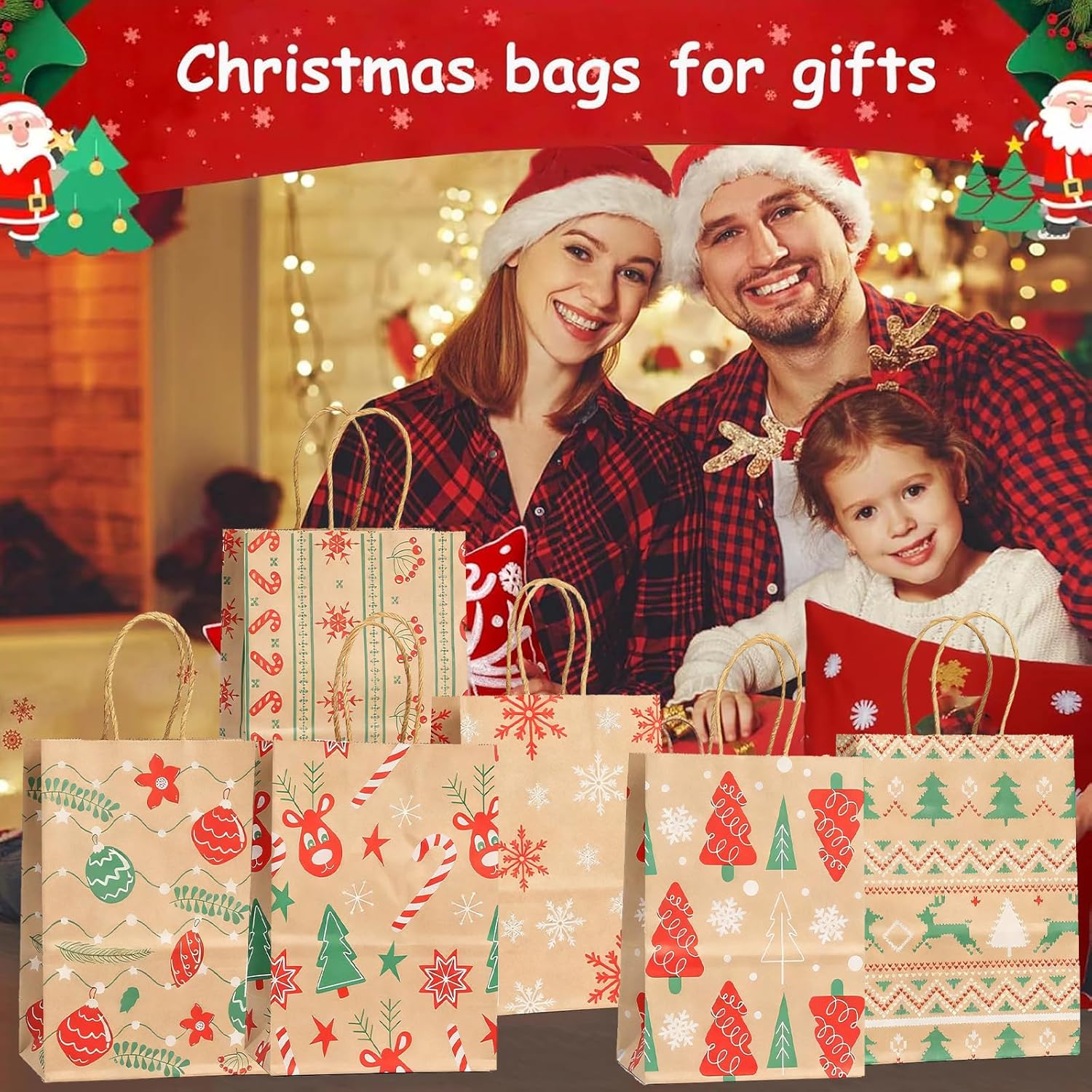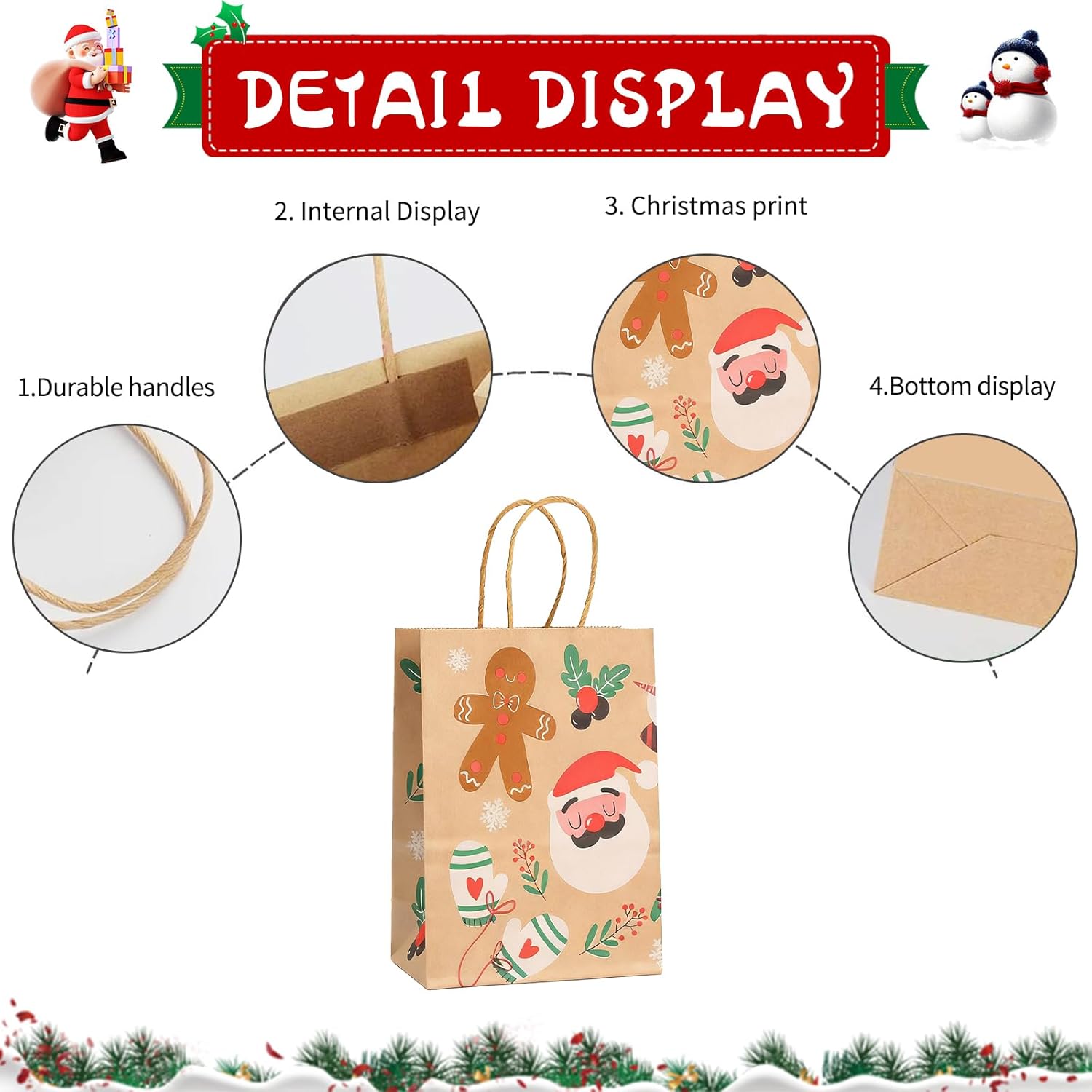 Sacchetti di carta natalizi con manici: Il prodotto include 24 sacchetti di carta natalizi, stampati in 8 stili diversi, 3 pezzi per ciascuno, con classici elementi natalizi, fiocchi di neve, omini di pan di zenzero, albero di Natale e Babbo Natale ecc. Il manico e il sacchetto sono saldamente collegati, puoi sollevare le cose più facilmente Sacchetti di Natale in carta kraft: questi sacchetti di carta sono realizzati in carta kraft di alta qualità da 120 g/m². La maniglia è durevole, spessa e resistente e le dimensioni del prodotto sono 23 x 18,5 x 8,5 cm e soddisfano le tue esigenze quotidiane. Può essere riutilizzato molte volte, economico ed ecologico. In questo modo proteggi l’ambiente, ma anche il tuo portafoglio. Sacchetti di carta per Natale: puoi usare i robusti sacchetti con fondo per regalare belle sorprese durante il periodo natalizio con piccole sorprese e piccole cose varie come libri di folletti, cioccolato, macchinine, pasta giocattolo, biglie. Puoi scrivere, disegnare, dipingere, stampare e decorare queste borse di carta per personalizzare le borse e renderle uniche. Borse di carta con manico: le nostre borse di carta natalizie presentano elementi natalizi stampati, il che rende le nostre borse di Natale la prima scelta per l'imballaggio nel periodo natalizio. Aggiungono un'atmosfera natalizia più forte alle tue attività e portano più sorprese ai tuoi bambini e amici Ampiamente usato: può essere usato per fare sorprese natalizie, biscotti, giocattoli, cosmetici, pasticcini, gioielli, per conservare bevande, ecc. I sacchetti natalizi in carta kraft possono essere usati come decorazioni natalizie, ma anche come borse per la spesa per l'uso quotidiano, sia pratiche che rispettose dell'ambiente