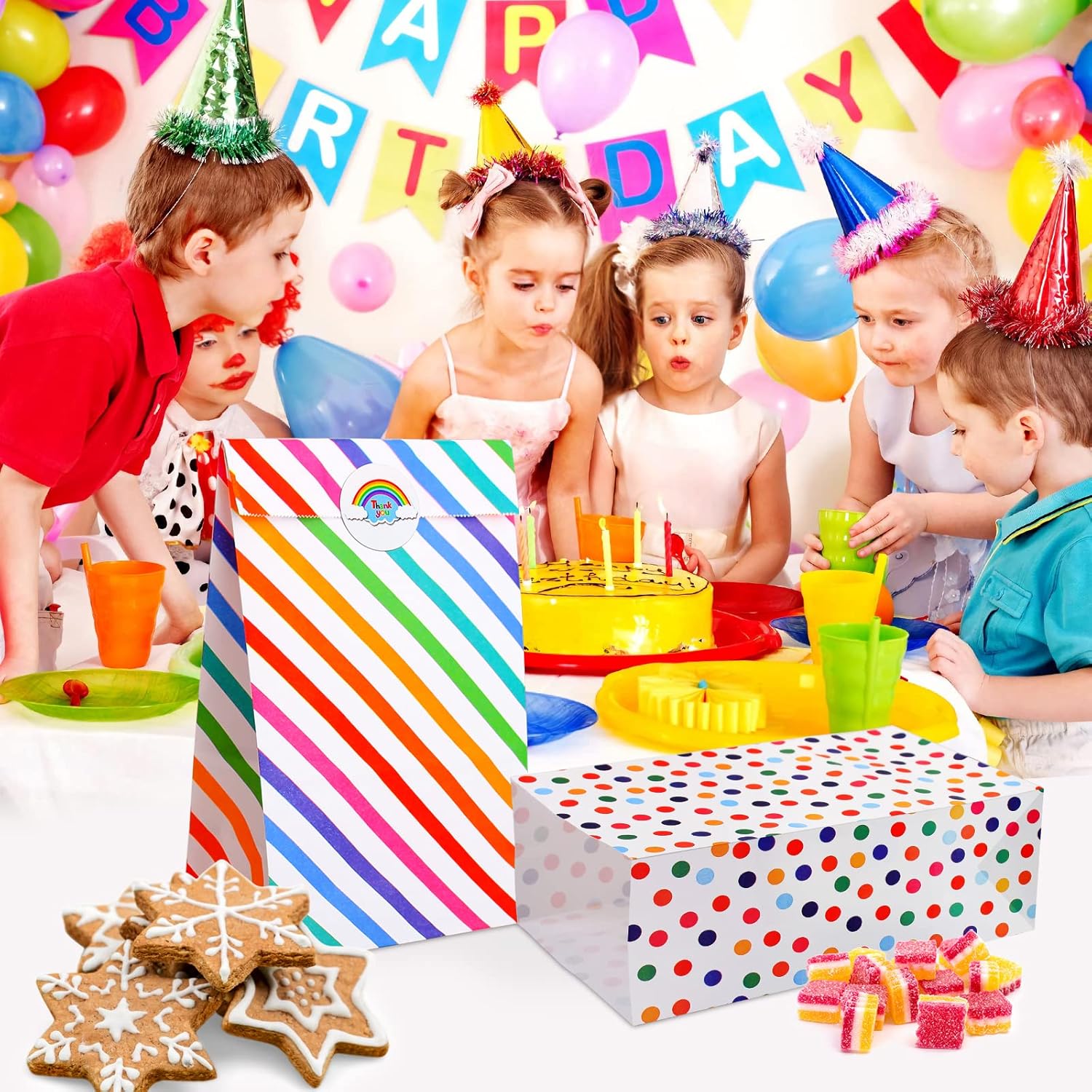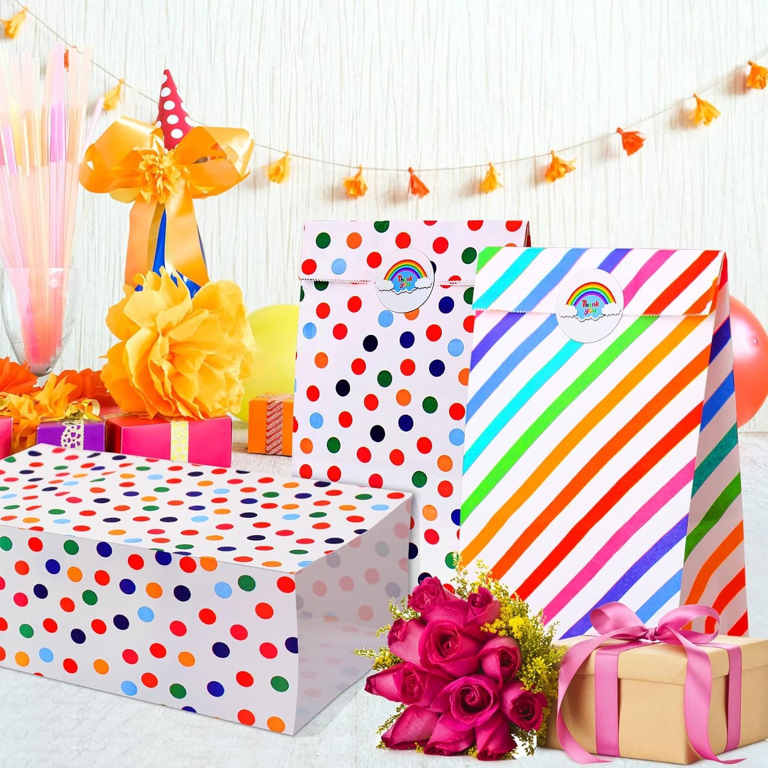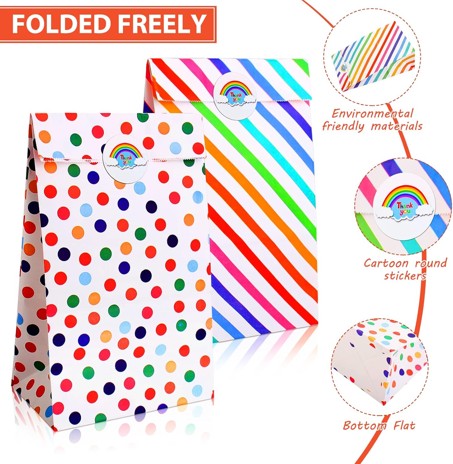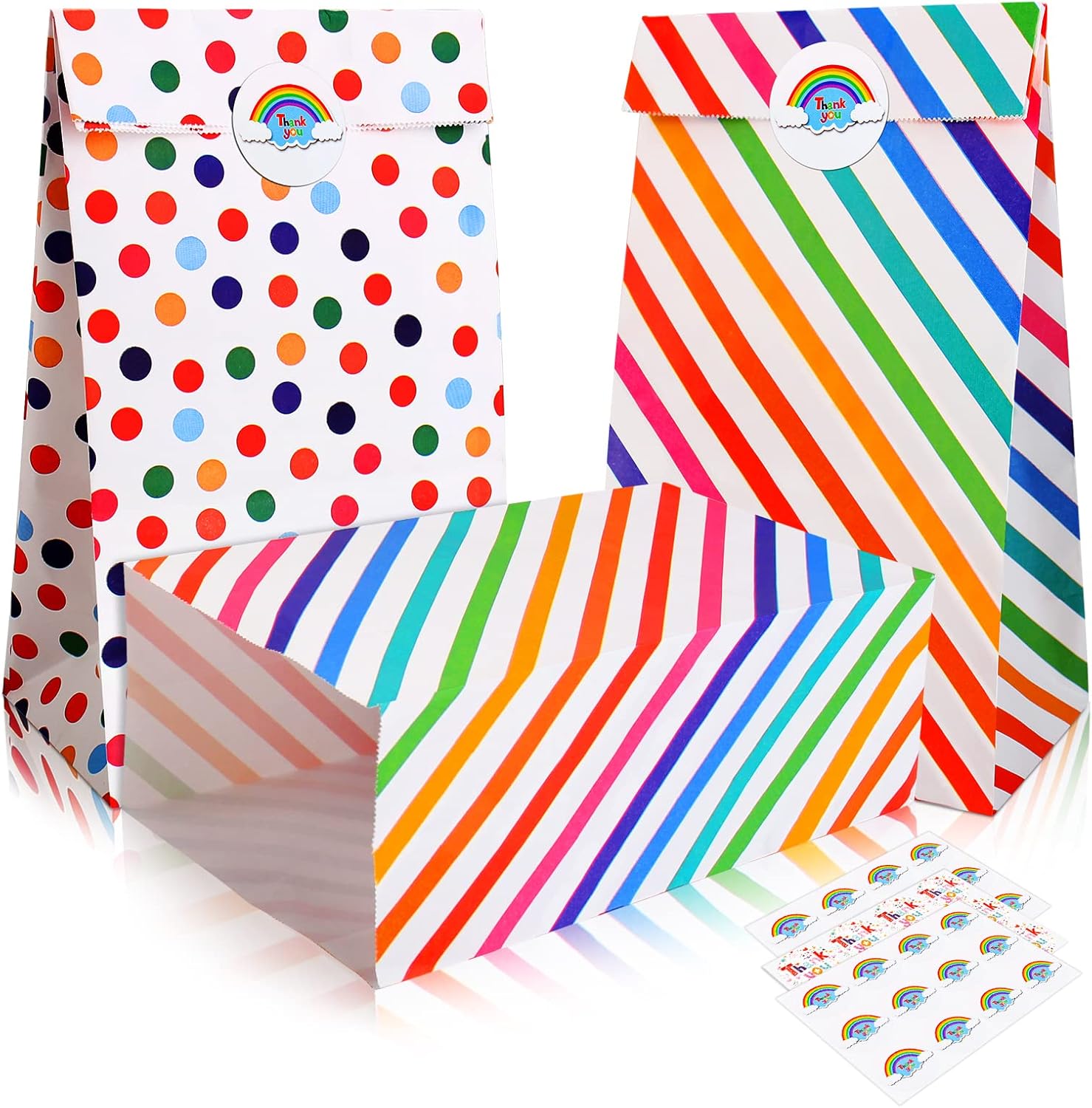 🎁【Set di sacchetti di carta】: Include 20 confezioni di sacchetti regalo di carta per i compleanni dei bambini con 24 sitter (2 fogli x 12 pezzi per foglio). I sacchetti da festa sono di colore bianco con strisce arcobaleno e motivo a pois, i sacchetti di carta neon riutilizzabili possono soddisfare le diverse occasioni e stati d'animo per soddisfare le tue esigenze a qualsiasi festa e ogni giorno, sacchetti di carta colorati per feste di compleanno per bambini per confezionare regali 🎁【DIMENSIONE PERFETTA】: La dimensione dei sacchetti di carta colorati è 21 cm x 13 cm x 8 cm, il diametro degli adesivi è 3,5 cm, una dimensione adatta per sacchetti di carta piccoli per bambini, e gli adesivi possono anche essere usati come etichette. 🎁【USI VERSATILI】: I sacchetti regalo di carta a strisce arcobaleno e a pois sono molto adatti per l'uso quotidiano per pane, panini, piccoli giocattoli, ecc. I sacchetti regalo di compleanno possono essere utilizzati anche come sacchetti di carta, sacchetti di caramelle, sacchetti per bomboniere, sacchetti di compleanno per bambini, sacchetti per dolcetti adatti per Natale, Halloween, matrimoni, San Valentino, Pasqua, compleanni, Ringraziamento, lauree e altre celebrazioni 🎁【MATERIALE COMPLETO】: Vengono realizzati sacchetti regalo arcobaleno vuoti per bambini di carta kraft ecologica, di buona qualità, leggera, biodegradabile, riciclabile, durevole e pieghevole, che offre comodità per il trasporto e l'uso quotidiano. 🎁【Servizio clienti】: sosteniamo la qualità dei nostri prodotti. Se non sei soddisfatto dei sacchetti regalo Multi-Occasion piccoli, riceverai un rimborso.