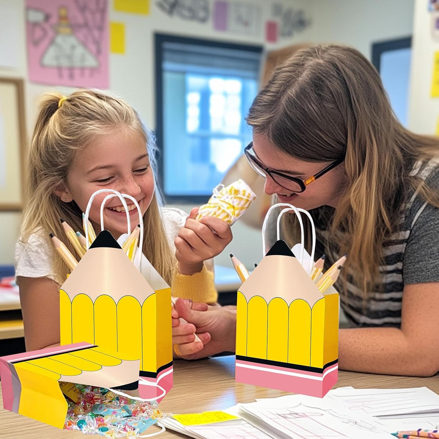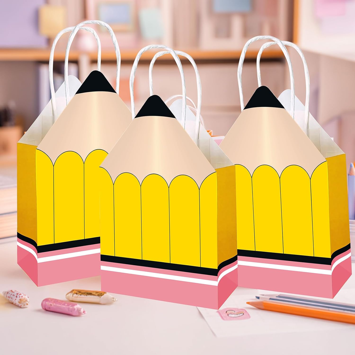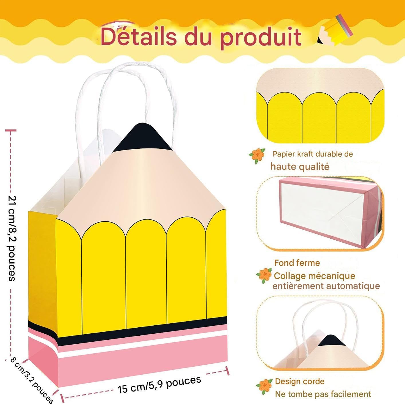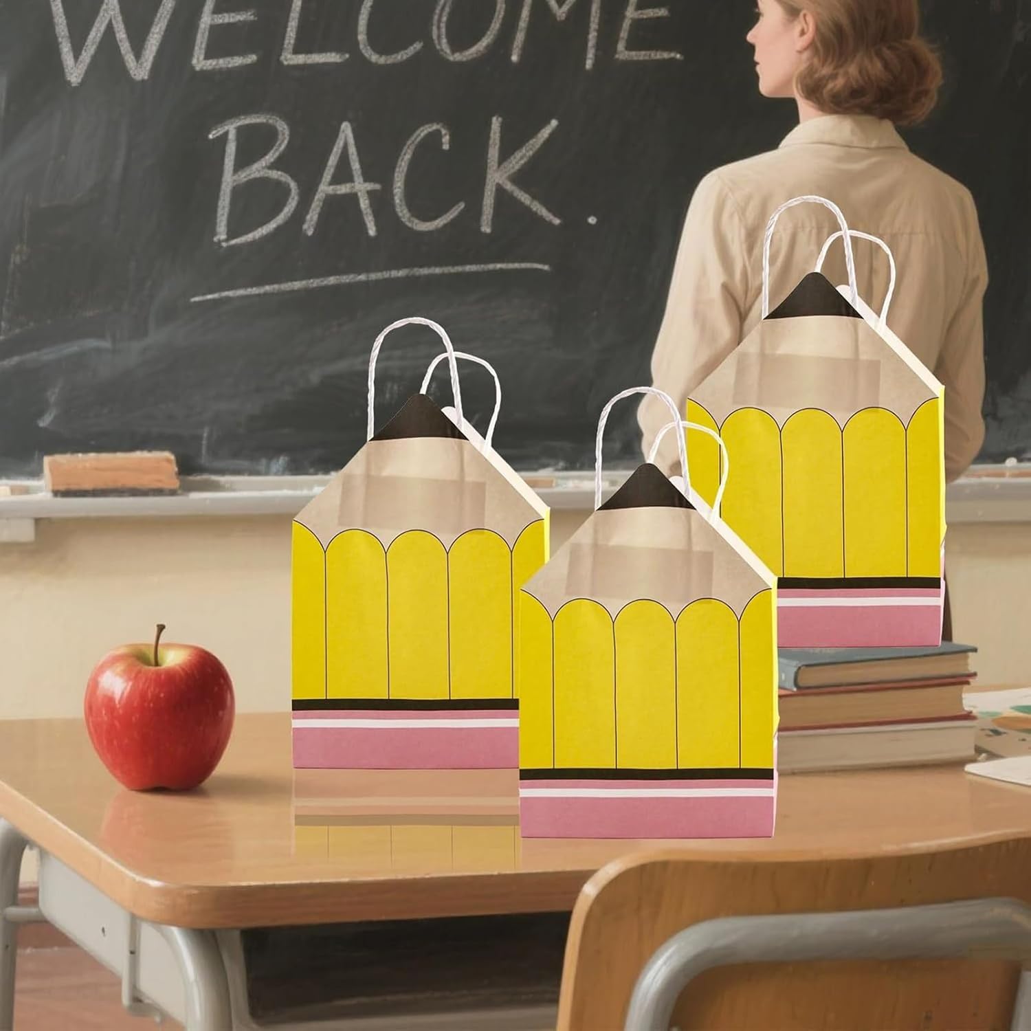 Occasioni regalo adatte: con una dimensione ideale per contenere vari regali, questi sacchetti di carta sono progettati per soddisfare molteplici usi, un abbinamento perfetto per tutte le celebrazioni di riconoscimento degli insegnanti. Design adattabile e pratico: ideali per vari contesti come attività scolastiche o feste per gli insegnanti, queste borse riutilizzabili combinano funzionalità e durata, creando vantaggi reciproci attraverso il loro riutilizzo ripetuto in diverse situazioni. Incantevole design a matita: questi sacchetti di carta dal design ispirato alla matita portano fantasia ed eleganza alla Festa dell'insegnante, migliorando la presentazione e l'emozione dei tuoi regali scelti con cura. Celebrazione dell'insegnante: questo pacchetto di 12 sacchetti regalo a forma di matita è progettato per la Settimana dell'Apprezzamento, facilitando la distribuzione di regali pieni di gratitudine per mostrare il tuo apprezzamento per gli educatori in modo creativo e memorabile. Ideali per fare regali: grazie alla loro costruzione di materiali, questi sacchetti di carta offrono una buona resistenza all'usura, la consegna sicura dei tuoi regali e servono come gesto premuroso per gli insegnanti che desiderano mostrare il loro riconoscimento