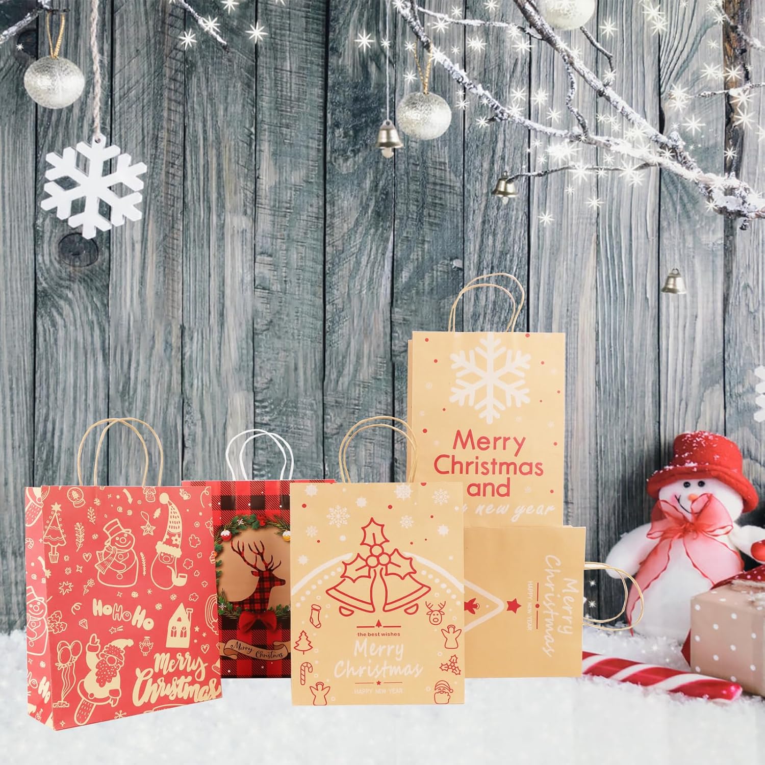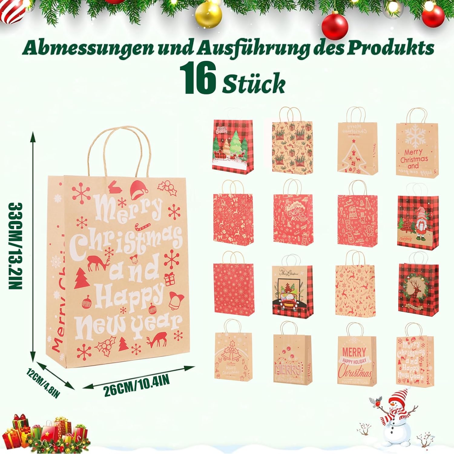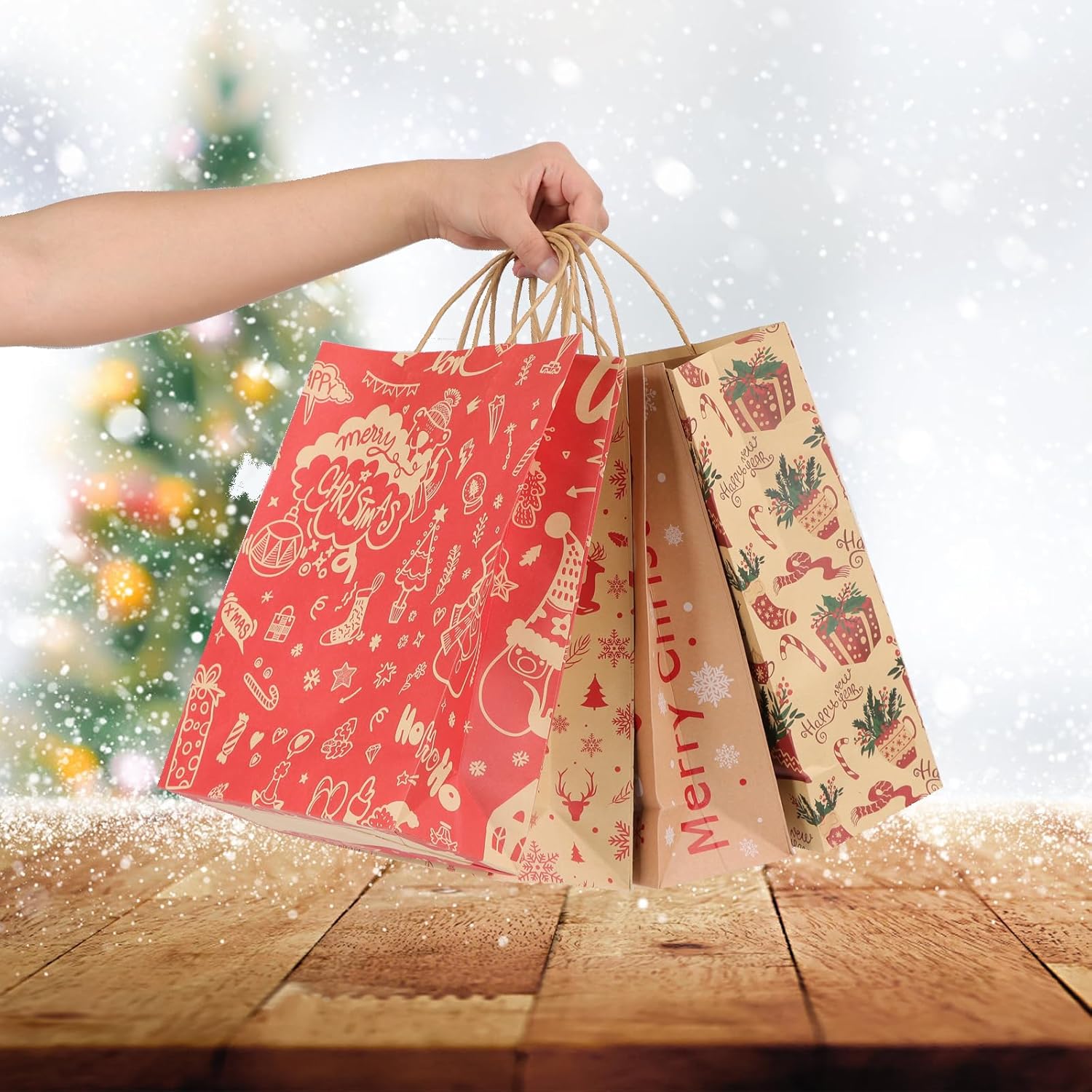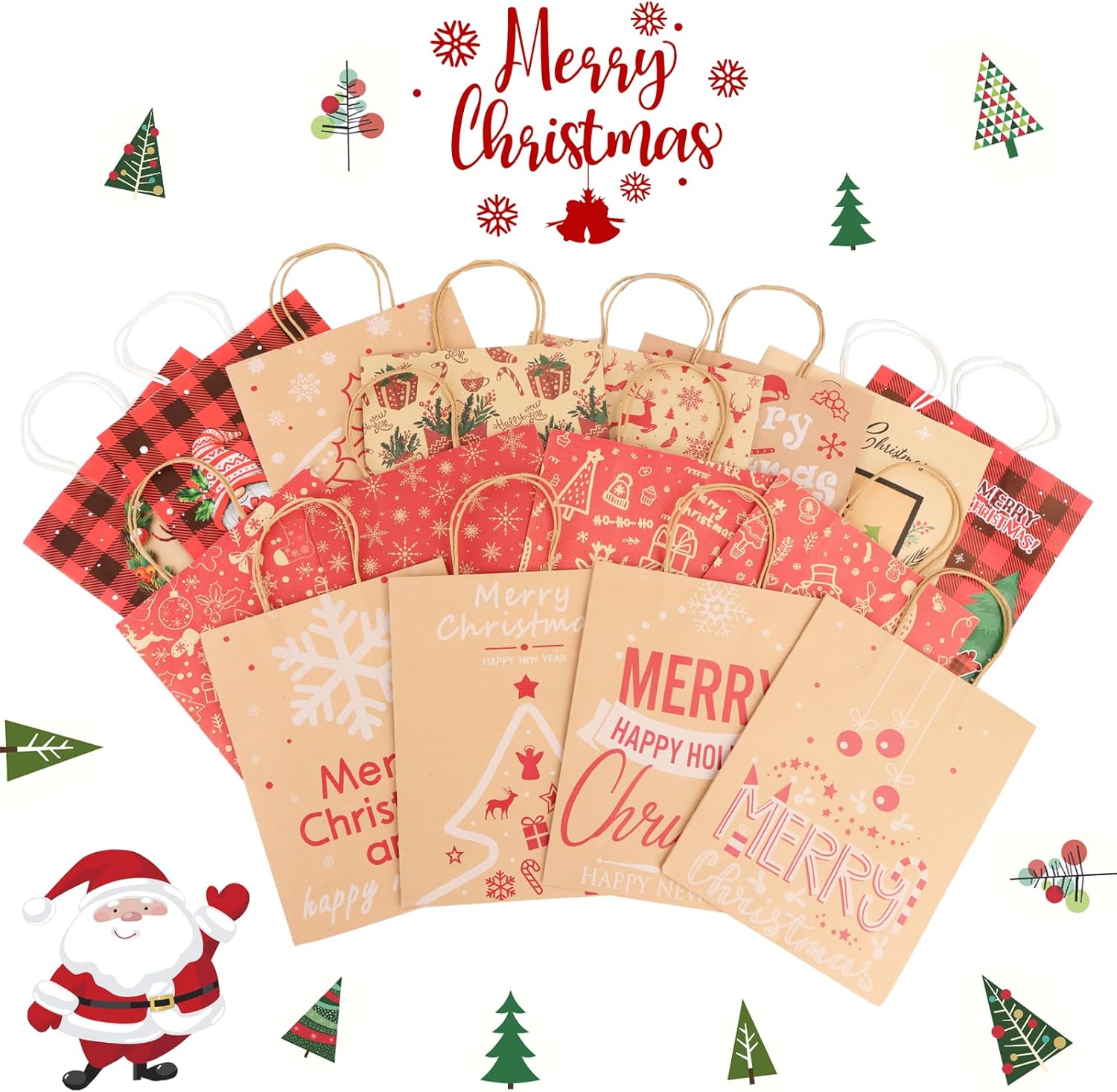 Borse natalizie: 16 borse natalizie in 16 modelli natalizi, quantità sufficiente da riempire con deliziose caramelle natalizie e regali squisiti e soddisfare le tue esigenze per diverse feste natalizie. Dimensioni adeguate: ogni borsa regalo natalizia misura ca. 33 x 26 x 12 cm, adatto per la maggior parte delle confezioni regalo. Puoi confezionare regali di diverse dimensioni, rendendolo una scelta perfetta per l'imballaggio di sacchetti regalo di Natale. Alta qualità: questi sacchetti regalo sono realizzati in carta kraft di alta qualità, superficie liscia, abbastanza spessa, non facile da rompere durante il processo di confezionamento, durevole, facile da usare 16 modelli di modelli: i regali di Natale sono disponibili in 16 diversi modelli classici di Natale. Ci sono alberi di Natale, alci, regali, fiocchi di neve, Buon Natale e altri elementi natalizi. Il classico sfondo marrone è il sacchetto regalo di Natale ideale per creare un'atmosfera festosa. Ampie applicazioni: la borsa natalizia è la scelta migliore per confezionare regali di Natale, regali del Ringraziamento e regali di nozze. Puoi usarlo per l'artigianato, la decorazione della stanza, le tovaglie e altri scopi