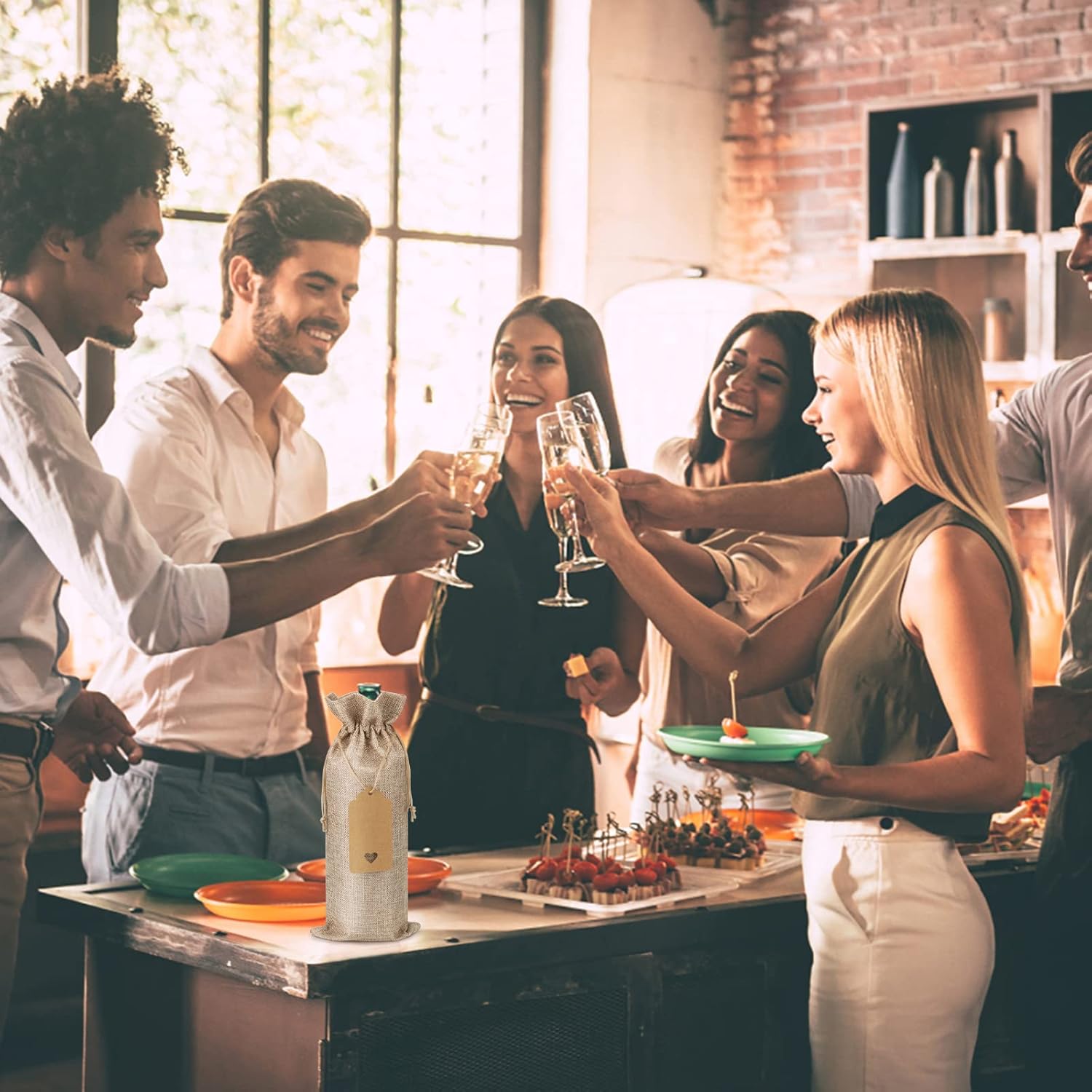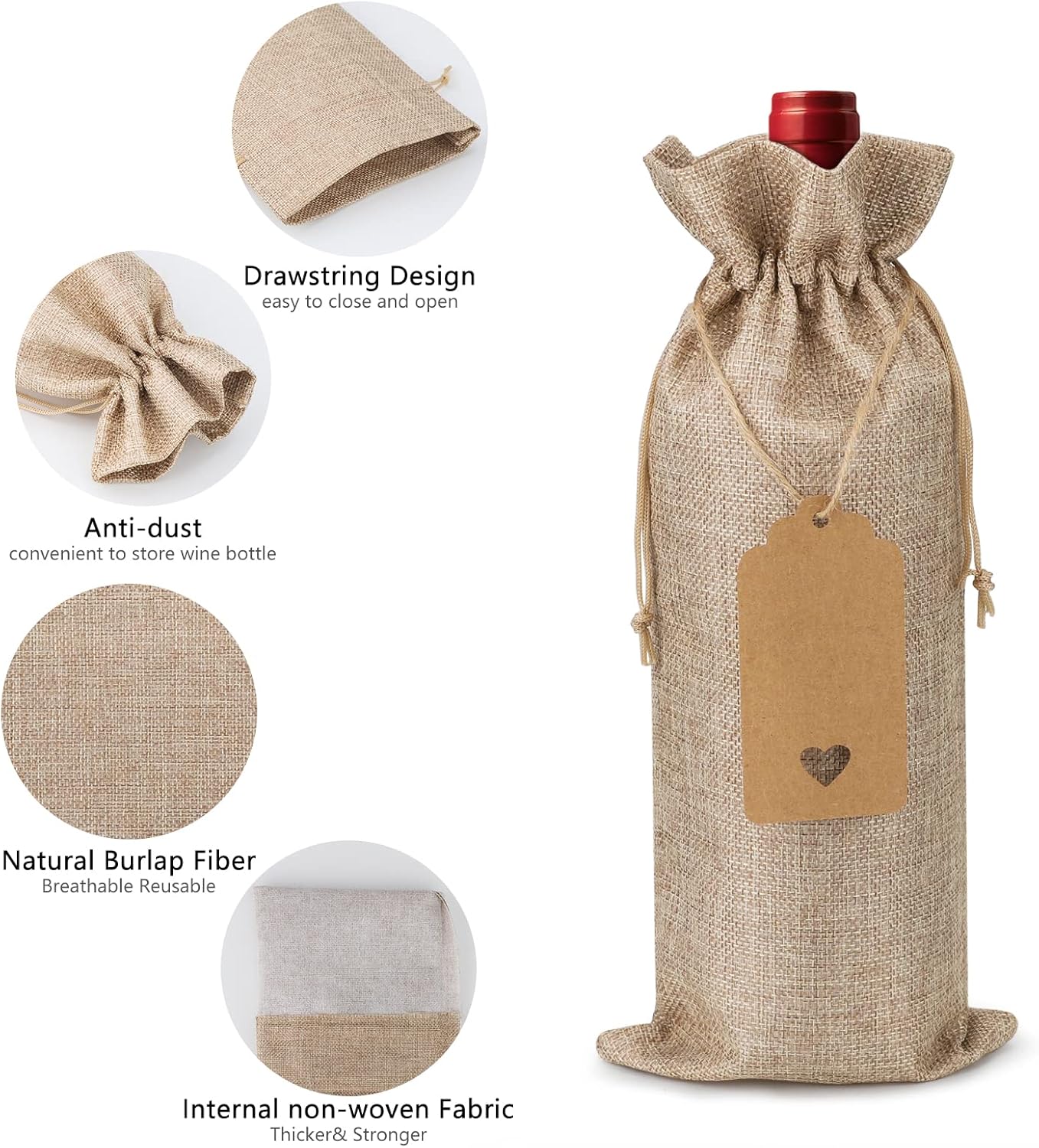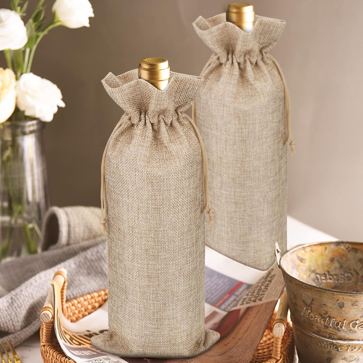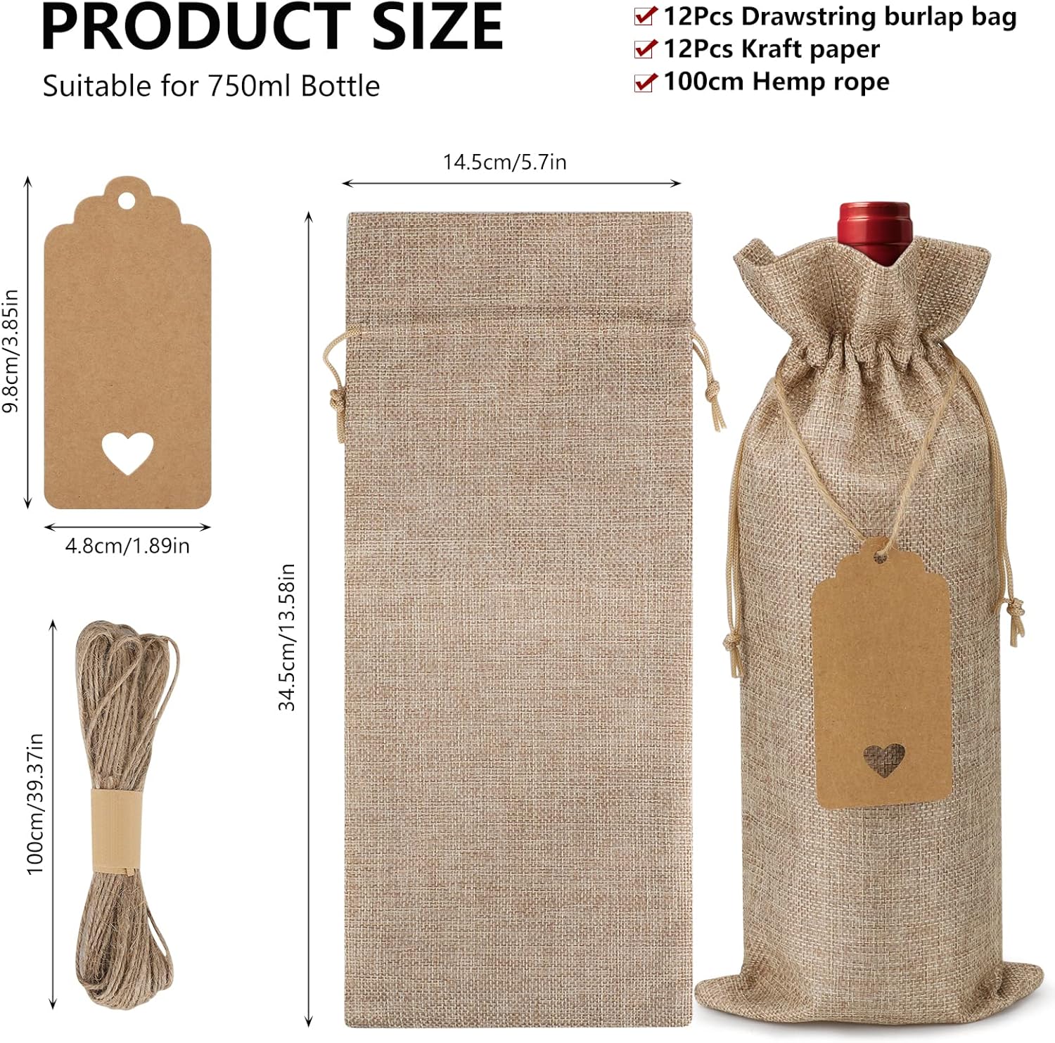 Alta qualità - Realizzate in tela naturale ecologica, il materiale di iuta naturale rende le borse riutilizzabili e durevoli. Borsa per bottiglia con coulisse - Ogni copertura per bottiglia di vino ha un cordoncino che ne facilita l'apertura e la chiusura, comoda per riporre bottiglie di vino o come confezione regalo o confezione per altri oggetti dalla forma simile. Lavabile e riutilizzabile: morbido e delicato, non si consuma né sbiadisce se trattato con cura. Puoi riutilizzarlo l'anno prossimo. Pulire solo con acqua e asciugare all'aria in un luogo ventilato. Regali di Natale perfetti: questi sacchetti per bottiglie di vino possono essere un regalo perfetto per un amante del vino e ideali per la decorazione natalizia delle bottiglie di vino. per la tua famiglia, i tuoi amici e gli amanti del vino questo Natale. Multiuso - Adatto per confezionare bottiglie di vino e champagne, proteggendole dalla polvere, ideale per la conservazione domestica, confezioni regalo e bottiglie di vetro per feste, matrimoni e festival