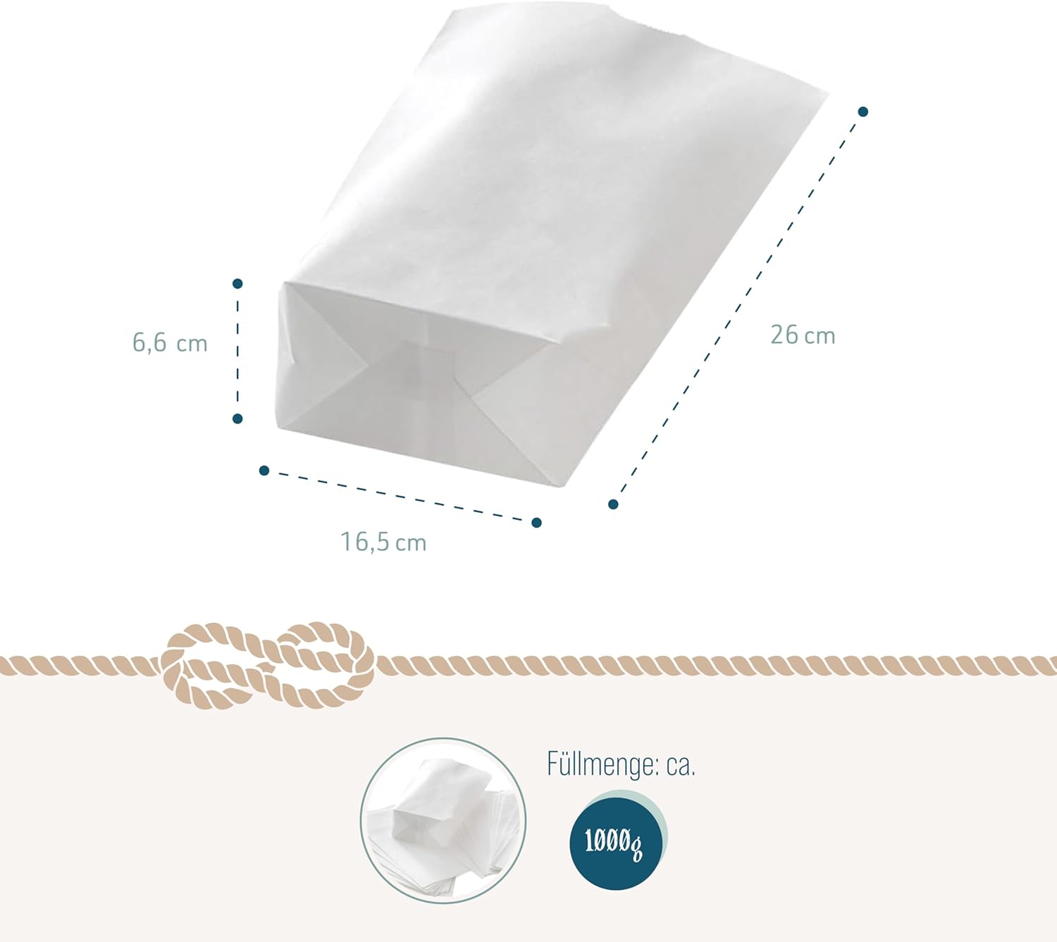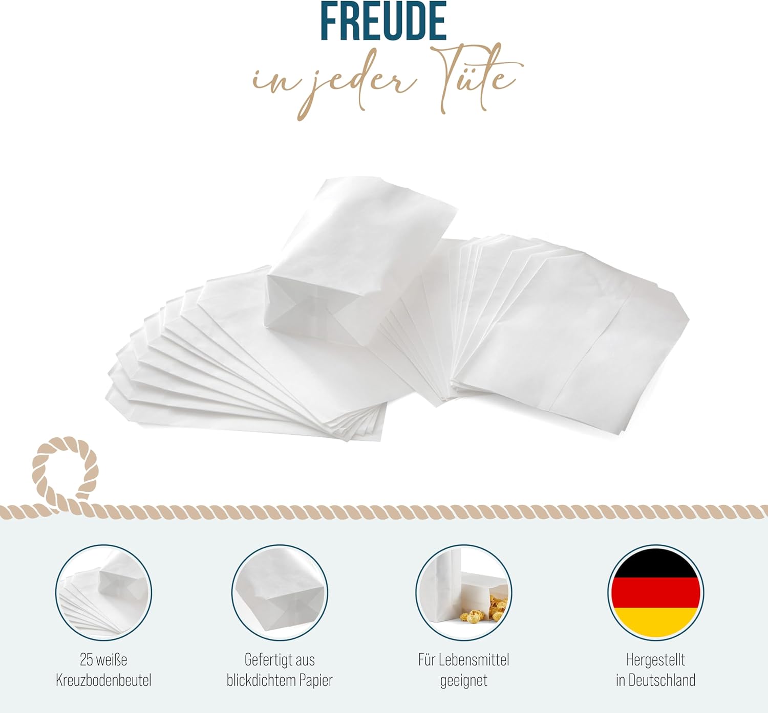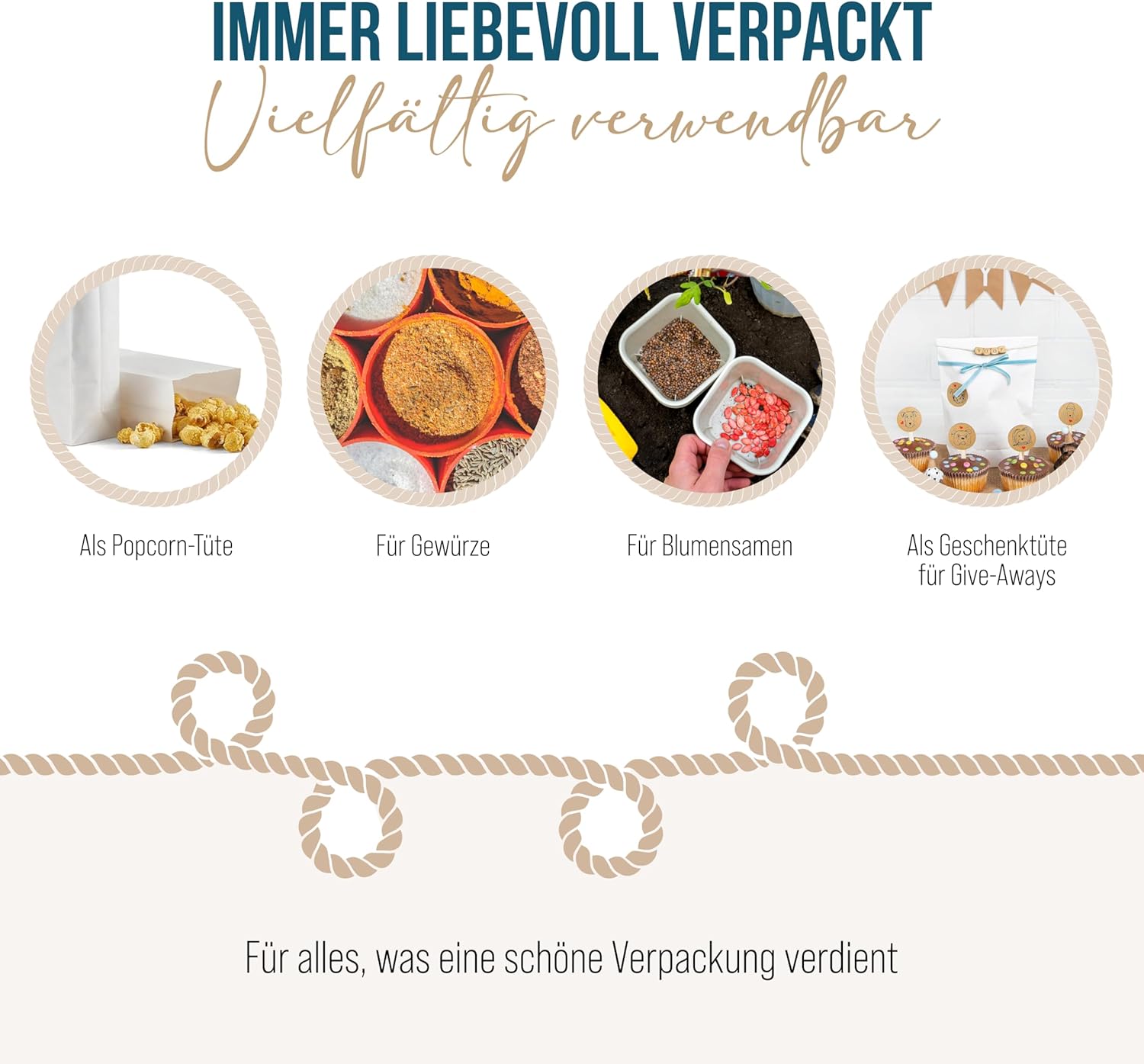 BORSE PRATICHE: Le borse bianche con fondo a croce sono un talento versatile nel confezionamento, ideali per riempire con stile spezie, popcorn, caramelle, semi di fiori o piccoli regali. STABILI E FACILI DA RIEMPIRE: Grazie al fondo incrociato, i sacchetti stanno in piedi da soli, possono essere facilmente riempiti e sono perfetti per mercati, festival o progetti creativi fai da te. PER OGNI OCCASIONE: Sia come regalo per gli ospiti a un matrimonio, come confezione per bomboniere ai compleanni o per piccoli regali nella vita di tutti i giorni, i sacchetti garantiscono contenuti confezionati con cura con un tocco personale MADE IN GERMANY: I sacchetti sono realizzati in carta robusta, opaca e adatta agli alimenti. Lavorazione di alta qualità per un utilizzo sicuro in molte occasioni DESIGN VERSATILE: le borse possono essere decorate e personalizzate individualmente con adesivi, etichette, clip o fascette, ideali per il fai da te con i bambini, per progetti creativi fai da te o celebrazioni con un tocco personale