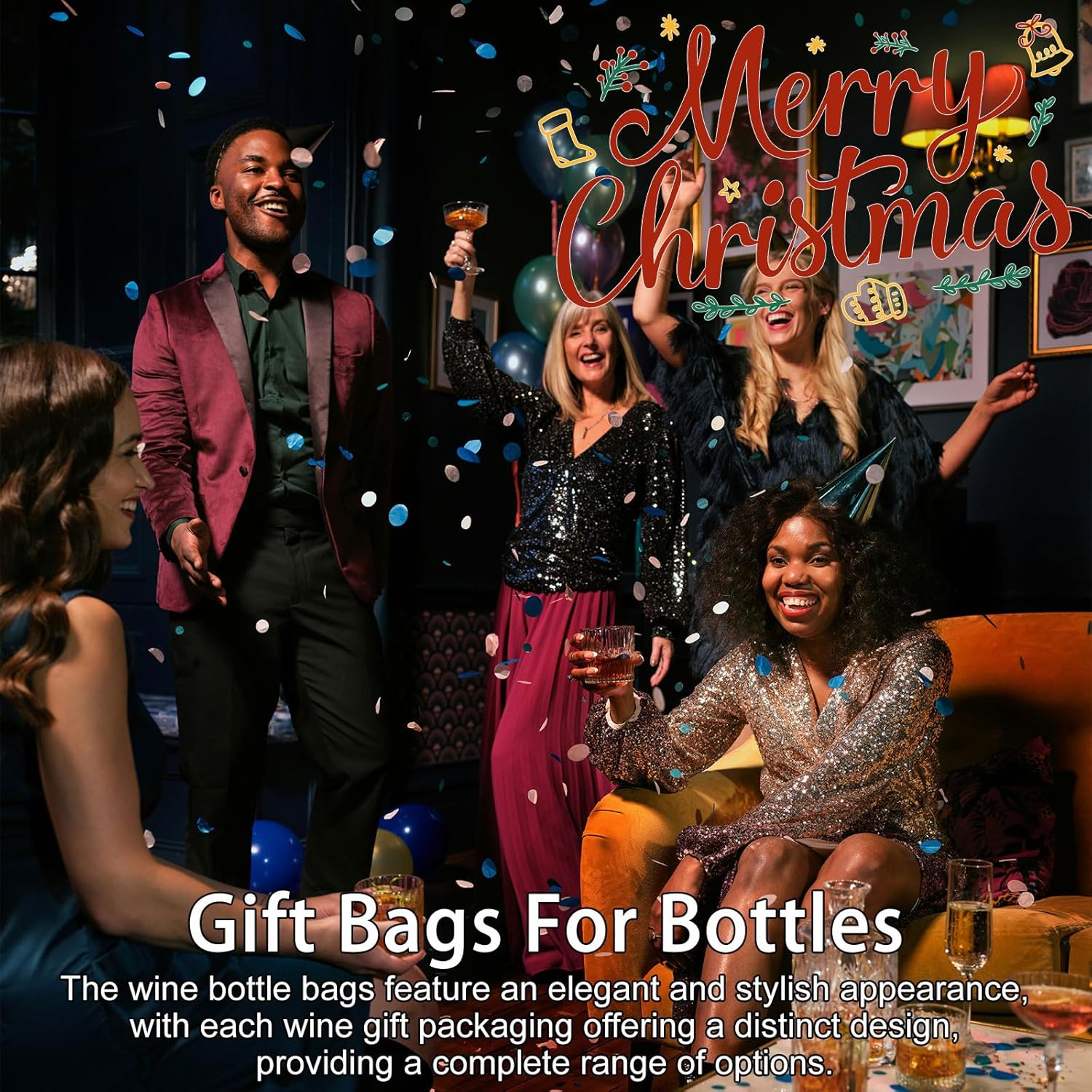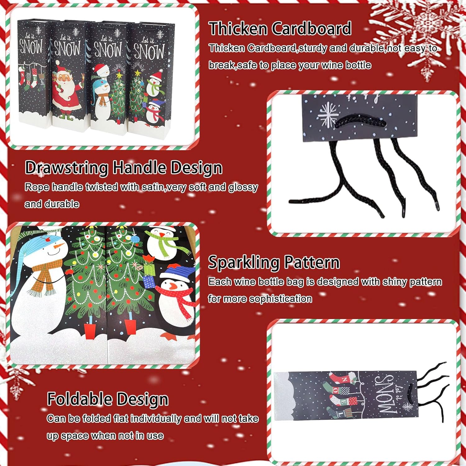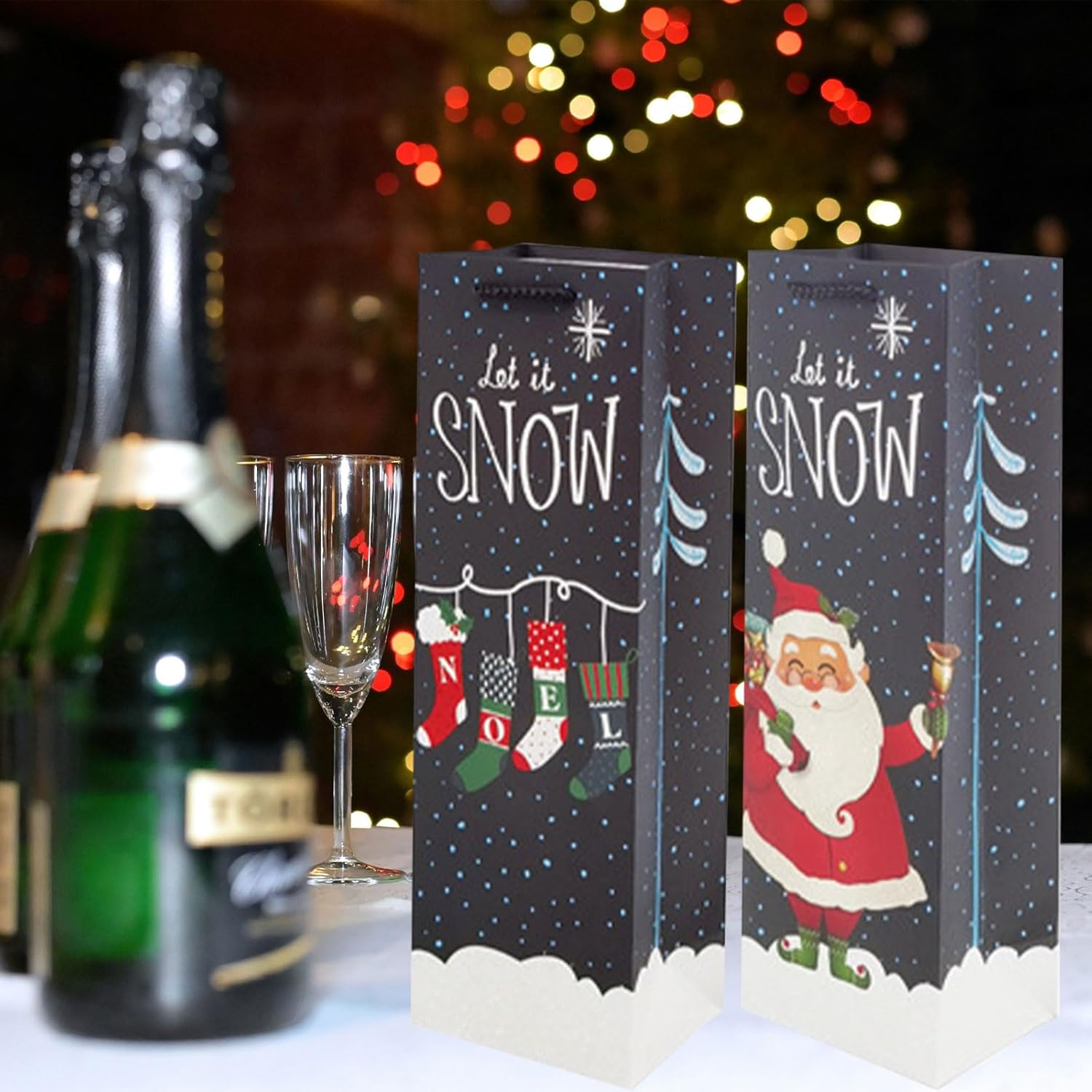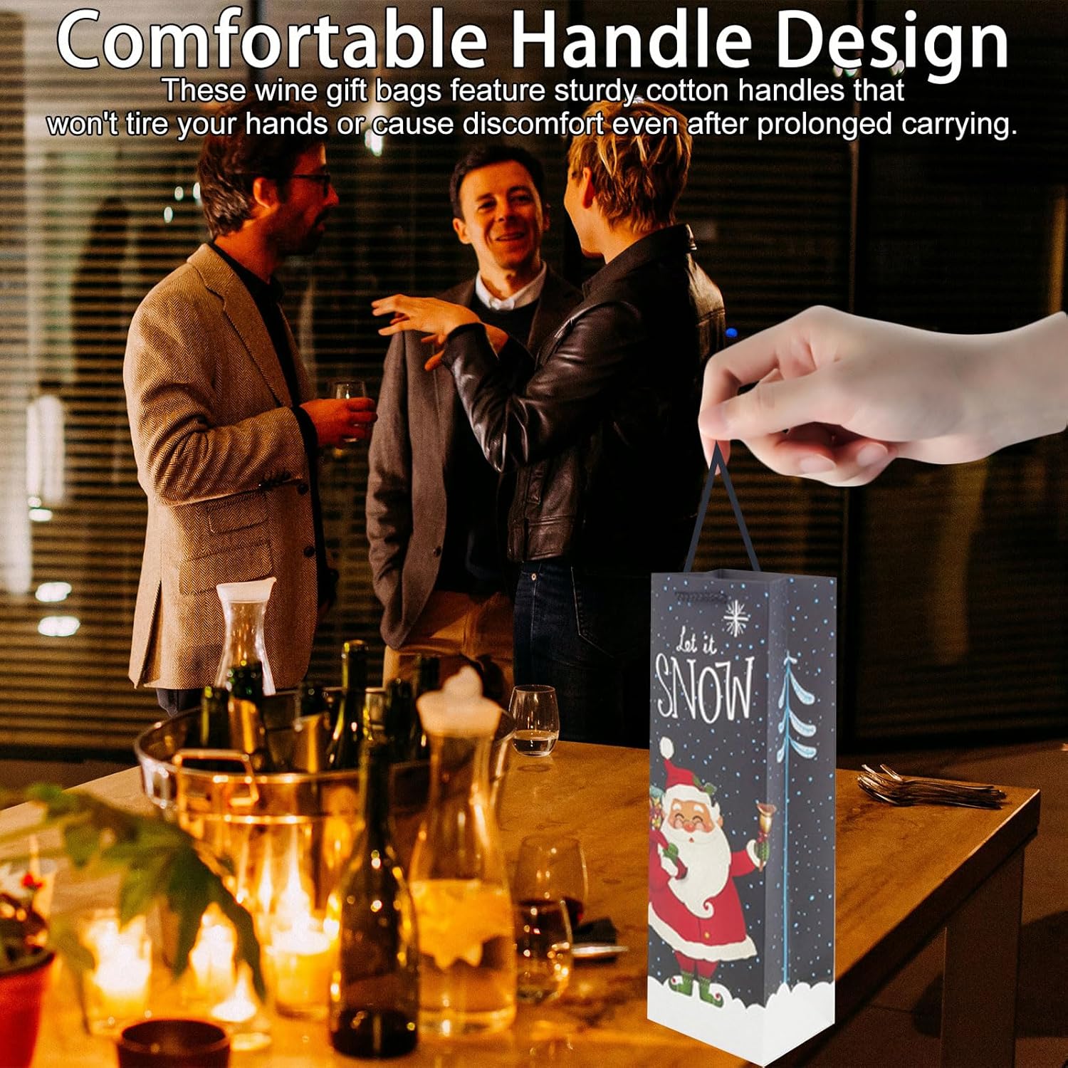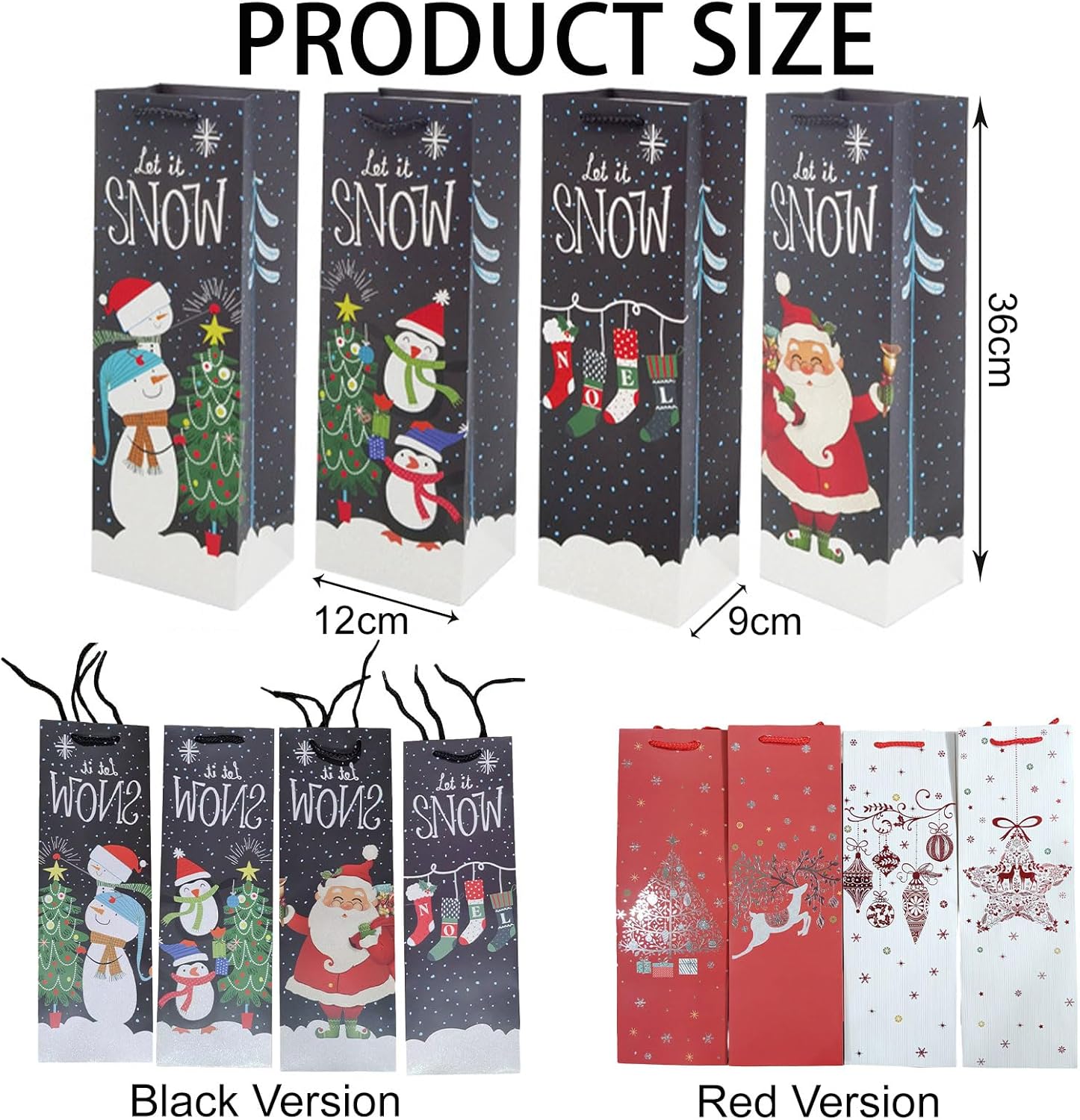 【8 sacchetti per bottiglie】 Questo set include 8 sacchetti regalo per bottiglie che misurano L12 x P9 x H36 cm. Ogni confezione di bottiglia può contenere una bottiglia di vino o champagne, adatta per la maggior parte dei vini rossi, champagne e così via. La borsa regalo per vino appositamente progettata impedisce alle bottiglie di scontrarsi durante il trasporto, garantendo la loro sicurezza e aggiungendo un tocco festoso al tuo regalo. 【Sacchetti regalo di Natale】 Il nostro set comprende otto diversi modelli di sacchetti regalo per bottiglie di vino di Natale, ciascuno con un modello unico. Sono disponibili in rosso o nero e offrono molto spazio per regali di vino per Natale o altre occasioni. Questi sacchetti regalo per vino presentano i tuoi regali in modo distintivo, aumentando l'attesa del destinatario e migliorando lo spirito festivo del Natale. 【Sacchetti per bottiglie durevoli】 Ogni sacchetto per bottiglie è realizzato in carta pesante e incollato insieme con un adesivo, rafforzando il supporto e l'integrità strutturale. Il materiale è spesso e robusto e ha una forte capacità di carico che non cadrà né si romperà a causa del peso. Ciò garantisce che il tuo vino venga trasportato in modo sicuro e senza intoppi ed è in grado di proteggerlo aggiungendo un tocco di eleganza. 【Design confortevole della tracolla】Questi sacchetti regalo per vino sono dotati di robusti manici in cordoncino di cotone, il materiale del manico è morbido e confortevole al tatto e supporta il trasporto a lungo senza stancarsi o ferirsi le mani. Le borse per bottiglie di vino sono disponibili in nero e rosso, la versione rossa ha manici rossi mentre la versione nera ha manici neri, garantendo una combinazione di colori coerente. Molteplici usi: questi sacchetti di carta non sono adatti solo per la maggior parte delle bottiglie di vino, whisky e champagne, ma possono anche essere utilizzati per conservare vari regali, dolci, giocattoli, snack e così via. Sono ideali per occasioni come Natale, Ringraziamento, compleanni, inaugurazioni di case, matrimoni, conferenze, riunioni di famiglia, fidanzamenti e cene.