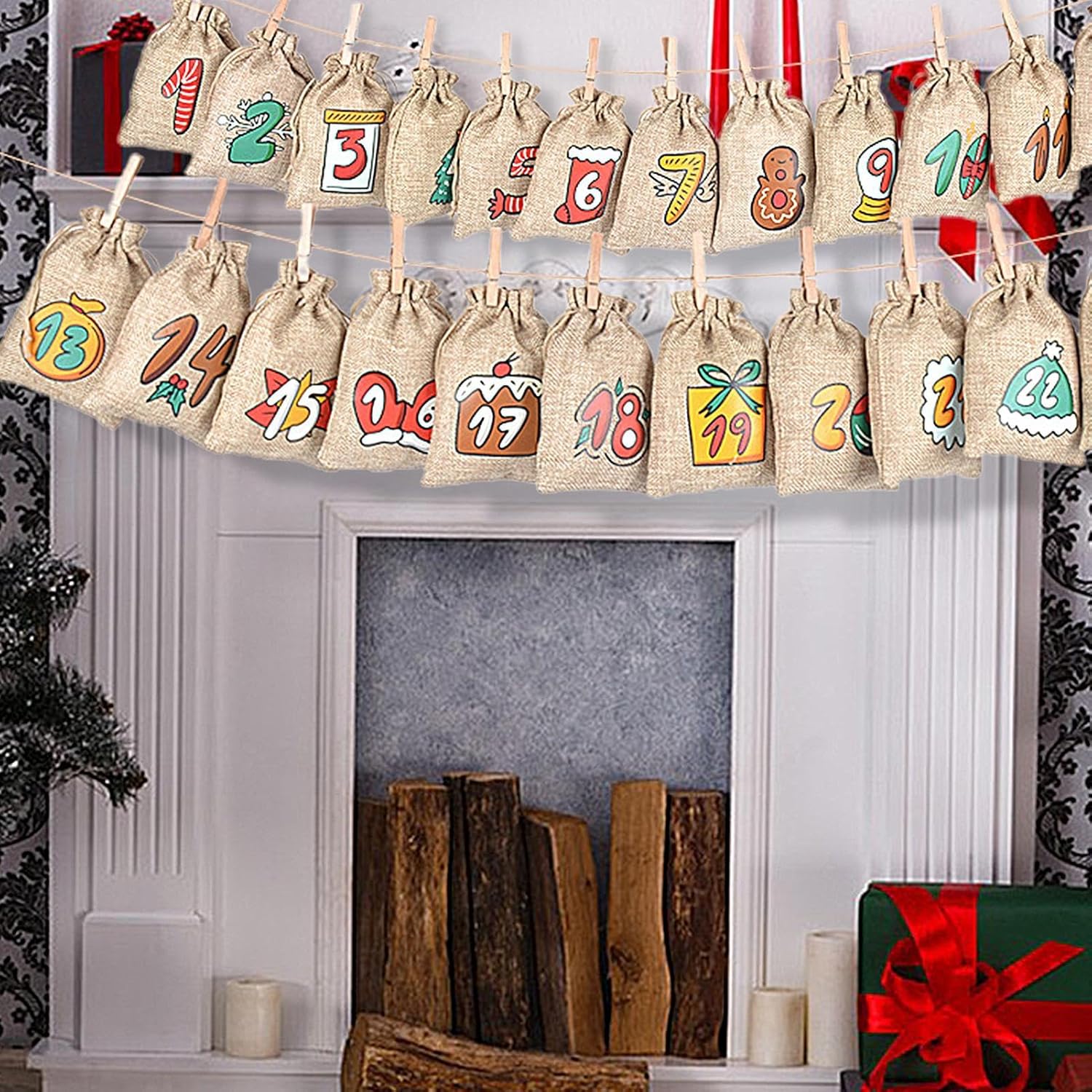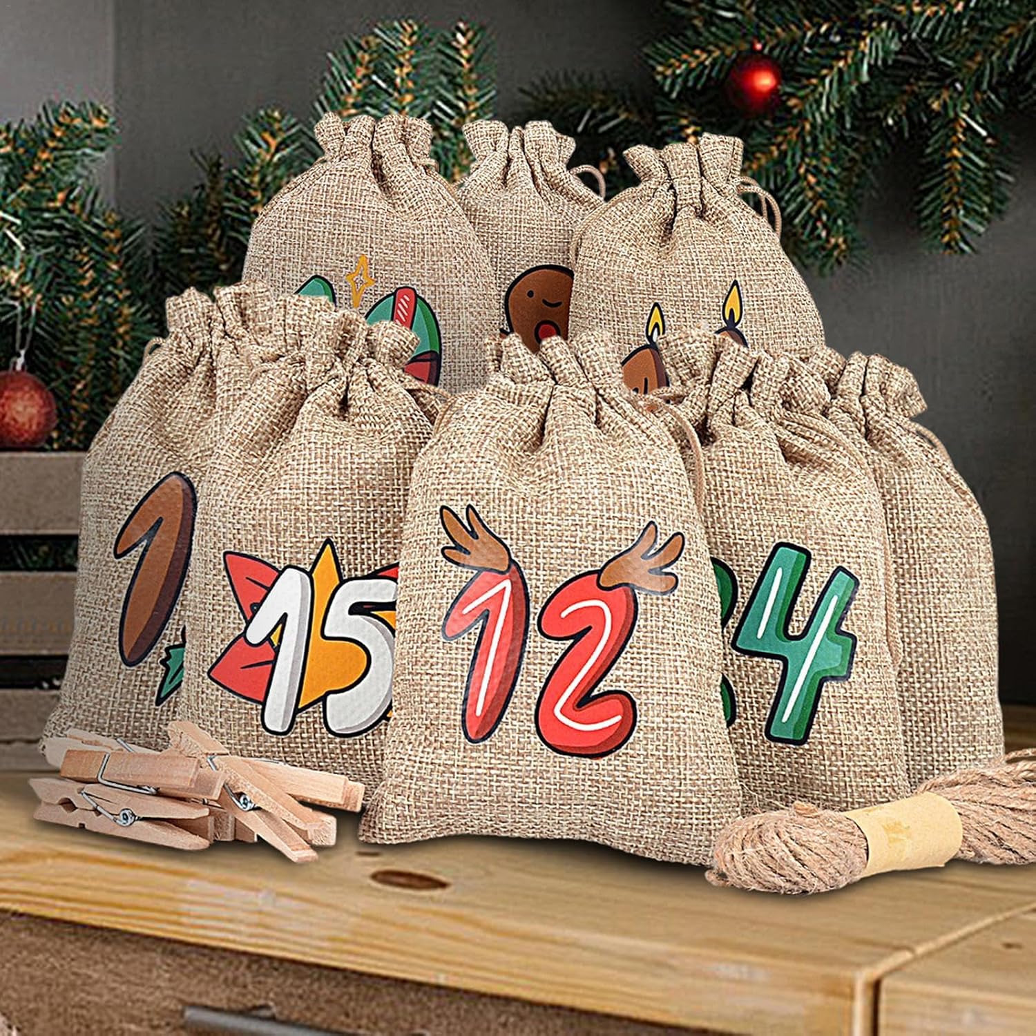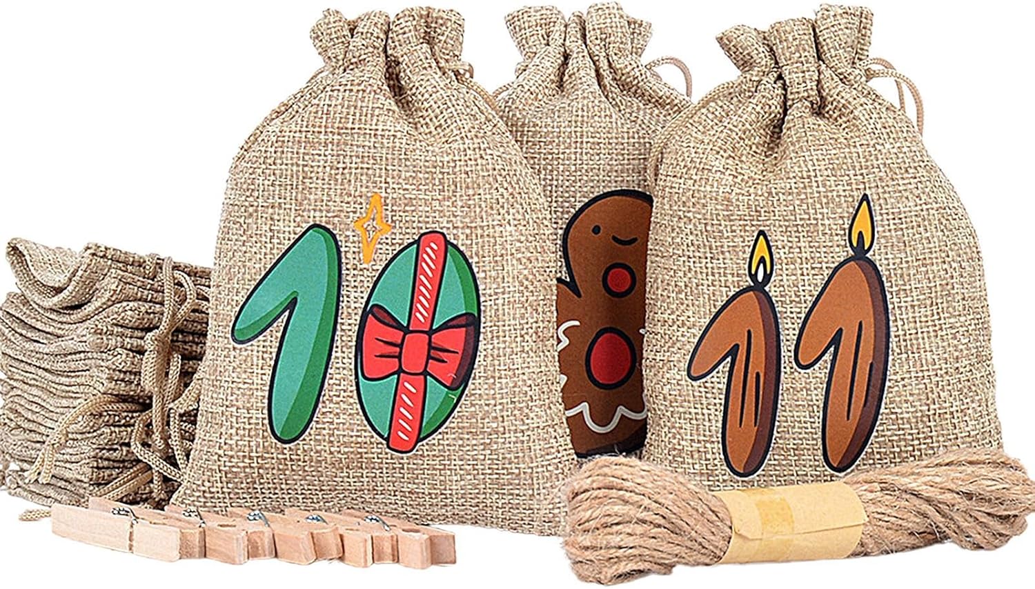 【Durabilità e sicurezza】 Queste borse natalizie in iuta presentano un design robusto e realizzato con cura che ne garantisce resistenza e sicurezza. Realizzati in robusto materiale di iuta, questi sacchetti possono essere riutilizzati e forniscono una protezione duratura per i tuoi regali. SORPRESA OGNI GIORNO - Migliora le tue celebrazioni natalizie con i nostri sacchetti di iuta. Scartalo ogni giorno per rivelare una sorpresa invisibile e abbracciare l'attesa del grande giorno. Ognuna delle 24 borse porta eccitazione senza pari e aspettative elevate ai tuoi festeggiamenti.,Interazione genitore-figlio: stimola l'interazione genitore-figlio con sacchetti di tela natalizi pieni di sorprese, sblocca varie sorprese e aggiungi più divertimento. Guarda i tuoi bambini divertirsi esplorando le borse e creando ricordi che dureranno tutta la vita.,Atmosfera festosa: diffondi un po' di allegria natalizia con le nostre borse di tela natalizie. Usali per decorare il tuo albero e la tua stanza con un tocco festoso. Conta i giorni con i calzini per una perfetta decorazione festiva e aumenta l'allegria dell'ambiente.,Ampiamente usato: migliora il tuo evento con i nostri sacchetti di tela natalizi, ampiamente utilizzati per decorazioni di nozze, battesimi, compleanni di bambini, Ringraziamento e altre attività entusiasmanti. Perfetto per fare regali e organizzare calendari