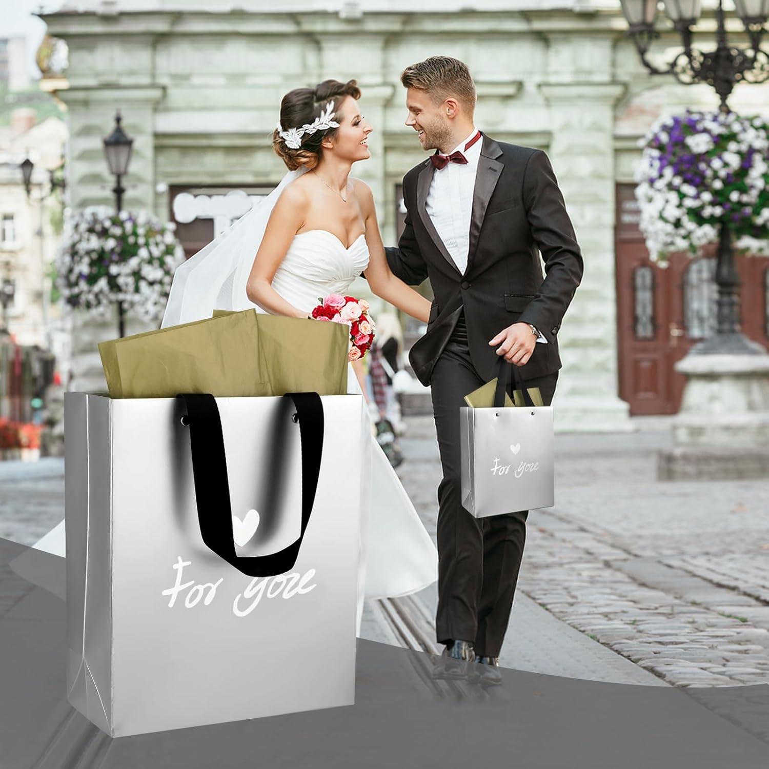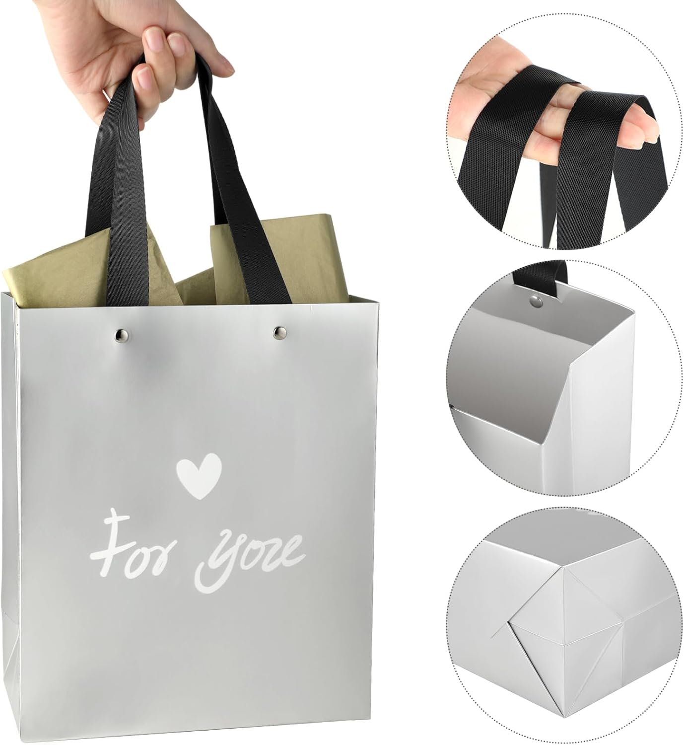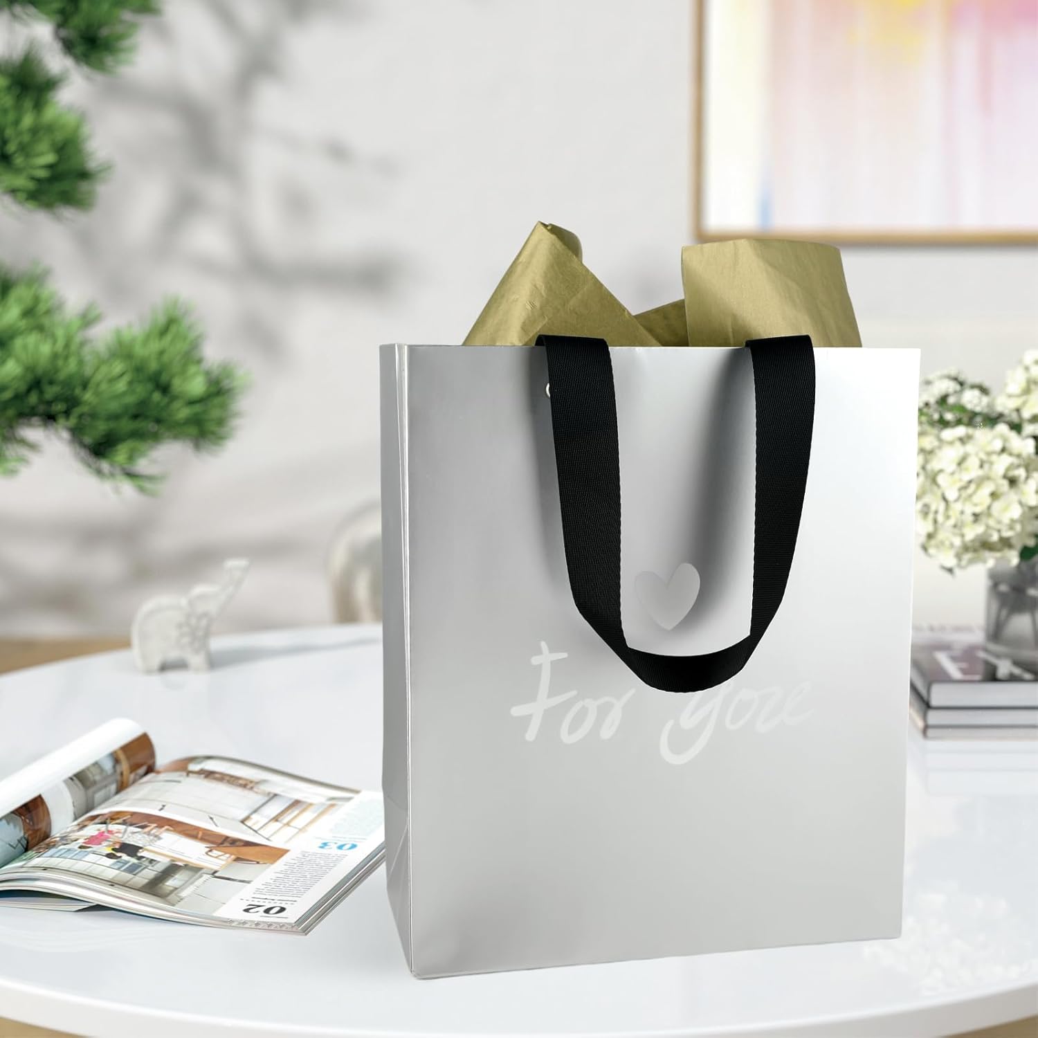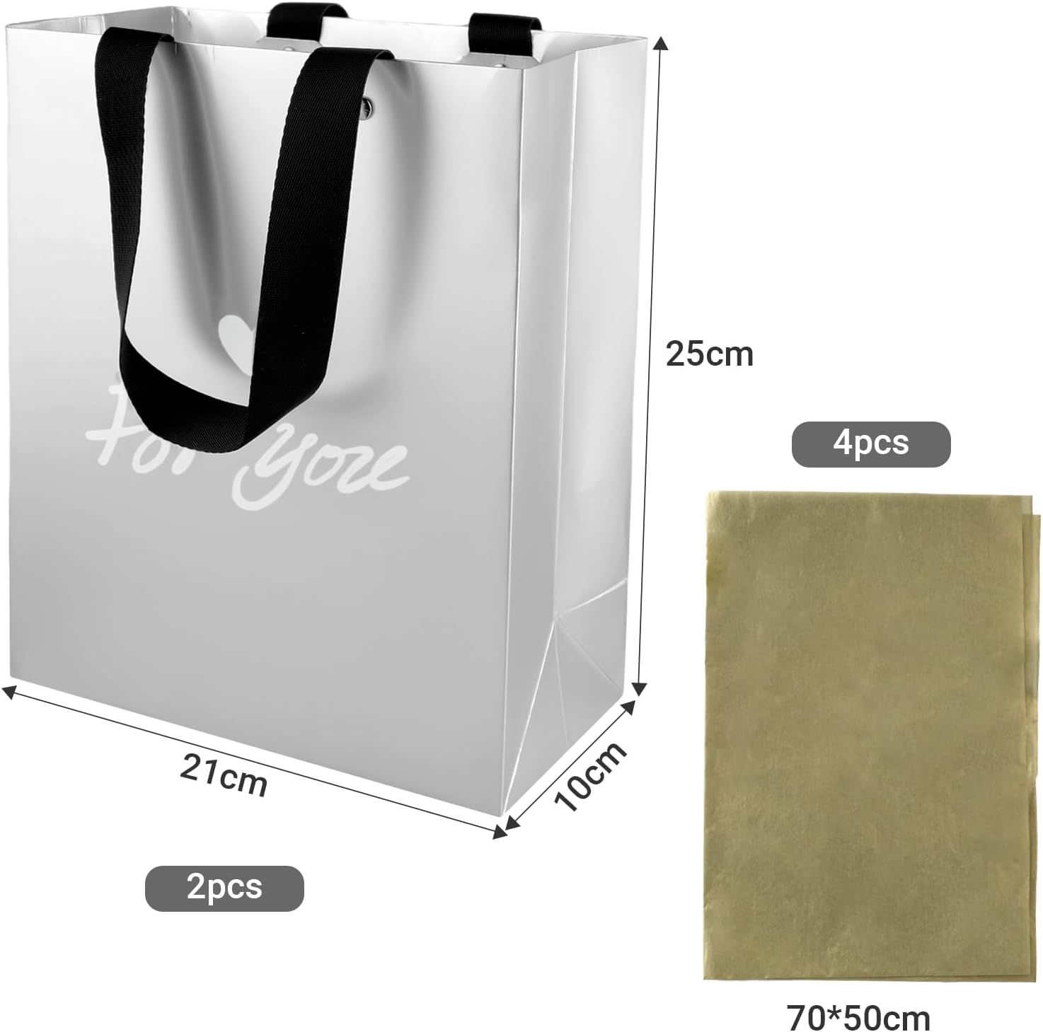 【ALTA QUALITÀ】 La nostra grande borsa regalo è realizzata in robusto cartone argentato, è ecologica, robusta e durevole. Con una base rinforzata e manici robusti, la grande borsa regalo offre un supporto affidabile per libri, vestiti, accessori o altri regali. 【APPLICAZIONE VERSATILE】 Questa elegante borsa regalo è perfetta come borsa regalo di compleanno, borsa per matrimonio, borsa per compleanno o confezione regalo per Natale, baby shower, festival o eventi aziendali. Elegante e pratico per molte occasioni. 【LOOK LUSSO】 Il sacchetto regalo in argento conferisce ad ogni regalo un'impressione elegante. Con questo sacchetto regalo il tuo regalo avrà un aspetto più pregiato ed elegante, ideale per amici, familiari, colleghi o partner commerciali. 【GRANDE E PRATICO】Grazie alle generose dimensioni di 30x10x25 cm, il grande sacchetto regalo è ideale per vari regali. Che si tratti di vestiti, libri, caramelle o piccoli accessori, questi robusti sacchetti regalo offrono spazio sufficiente per molte occasioni. 【RIUTILIZZABILE E RISPETTOSO DELL'AMBIENTE】 I nostri sacchetti regalo di compleanno sono riutilizzabili, durevoli e un'alternativa sostenibile agli imballaggi usa e getta. Con questi sacchetti regalo di alta qualità non solo regalate gioia, ma contribuite anche alla tutela dell'ambiente.