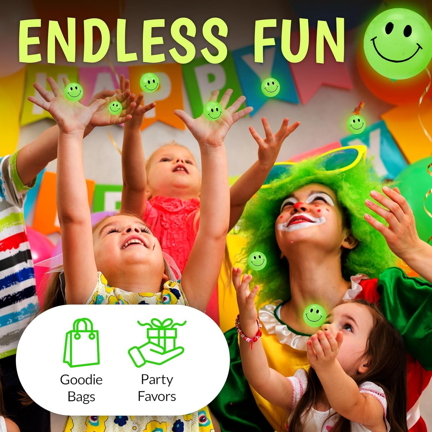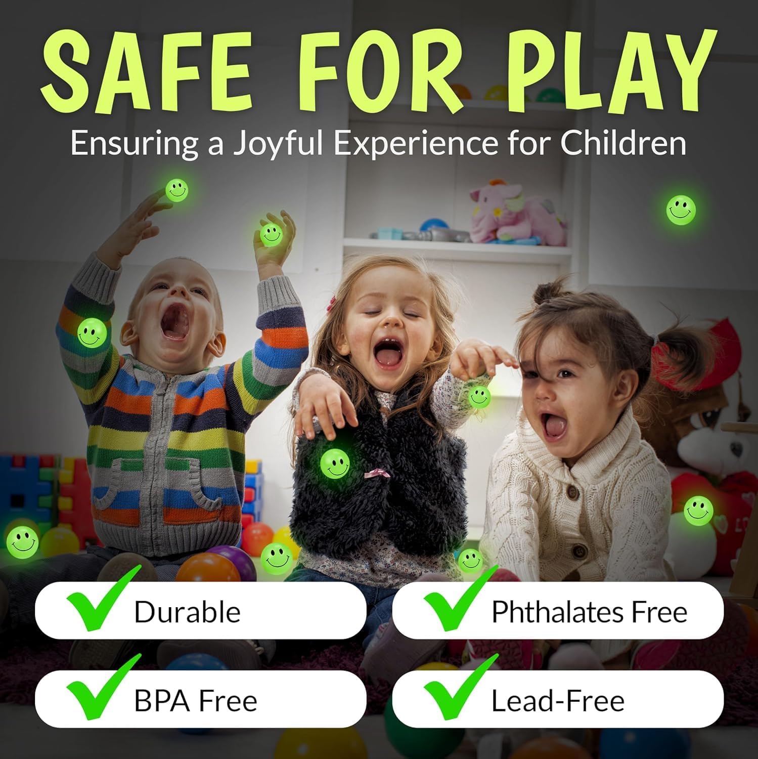 Confezione da 36: ottieni il massimo dai tuoi soldi e fai ridere i tuoi piccoli. Con 36 palline rimbalzanti che si illuminano al buio per bambini, avrai abbastanza dolcetti da distribuire. Distribuiscile come regalo o usa le palline rimbalzanti come divertenti ausili per l'apprendimento per lezioni di matematica e conteggio ALTA CAPACITÀ DI COSTRUZIONE; COOL GLOW: palline rimbalzanti con un'adorabile faccina sorridente e la luminosità più bella! Queste palline rimbalzanti che si illuminano al buio da 1 pollice delizieranno i bambini. Illuminali sotto una luce per attivare il bagliore, dai loro un buon rimbalzo e guardali illuminare la stanza con uno stile accattivante. GIOCO SICURO: prendiamo molto sul serio la sicurezza. Ecco perché abbiamo realizzato le nostre palline rimbalzanti luminose con gomma di alta qualità priva di BPA, ftalati e piombo. La gomma resistente può sopportare tutti i rimbalzi. Ciò significa sorrisi infiniti, giorno dopo giorno. FANTASTICI DOLCI PER LE FESTE: Cerchi bomboniere sorridenti e luminose al buio? Vuoi riempire le tue borse da festa con caramelle che adoreranno sia i ragazzi che le ragazze? Distribuisci queste palline sorridenti e rendi la festa un successo. Fanno anche fantastici premi di carnevale, imbottiture per calze e incentivi per un buon comportamento. PREPARATI PER I COMPLIMENTI: ravviva la tua festa di compleanno con queste decorazioni. Con un po' di creatività, puoi trasformare queste palline rimbalzanti in un'accattivante decorazione per la festa e in un centrotavola che attirerà i complimenti.