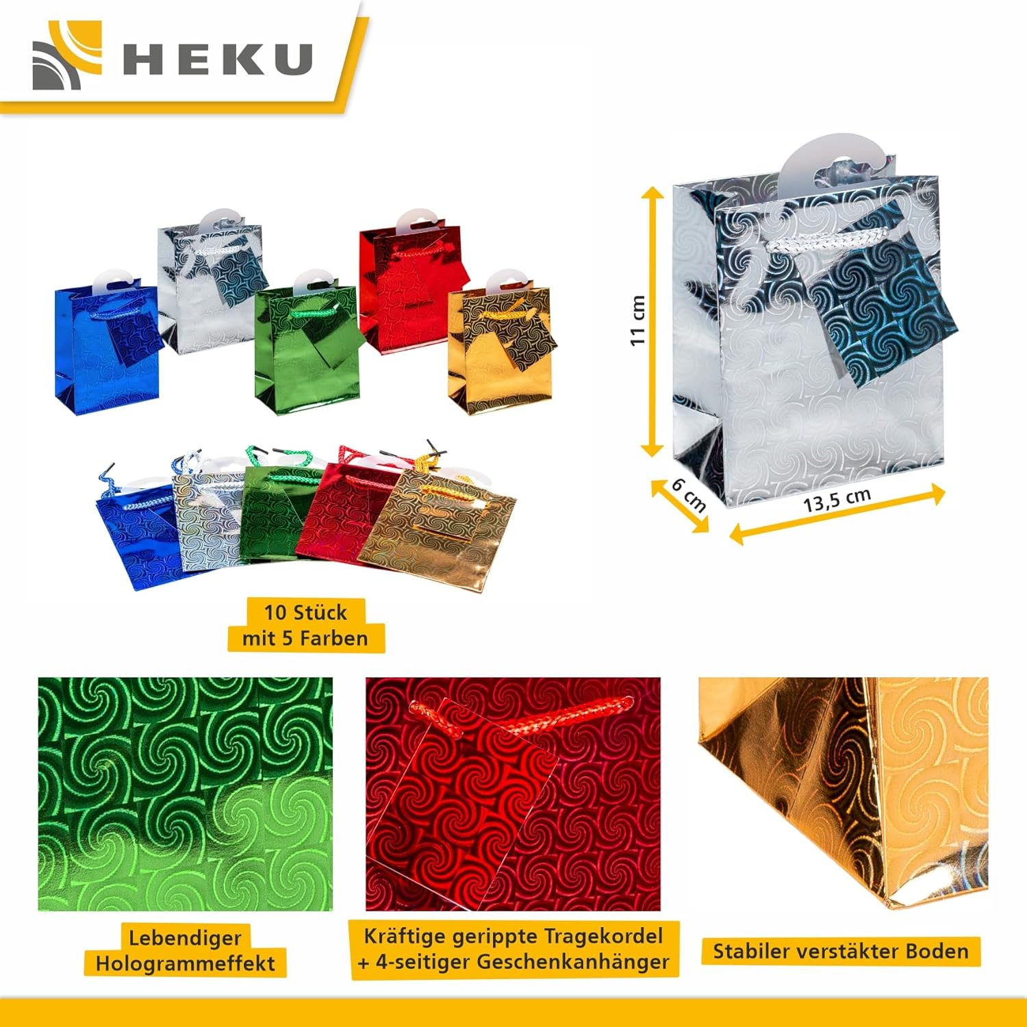 SET DA 10 IN UN CLASSICO ASSORTIMENTO DI COLORI: Due borse ciascuna nei colori rosso, argento, verde scuro, oro e blu scuro offrono una selezione elegante e varia per diverse occasioni. RIVESTIMENTO HOLOGRAM CON EFFETTO LUCENTE: Lo speciale rivestimento crea un affascinante effetto luccicante che valorizza visivamente i sacchetti regalo e garantisce una presentazione attraente. CARTA DI ALTA QUALITÀ: Realizzate con carta di alta qualità, queste borse offrono una confezione robusta e attraente per i regali. Possono essere riutilizzati o riciclati, rendendoli un'opzione ecologica. DIMENSIONI COMPATTE: Misurando 13,5 x 11 x 6 cm, le buste sono ideali per piccoli regali come gioielli, dolciumi, accessori o altri regali. SET PRATICO: Con 10 pezzi per confezione, questo set è una scelta pratica per chiunque abbia bisogno di incartare più regali. Che tu li usi per compleanni, Natale, anniversari, matrimoni, feste aziendali o come souvenir, questi sacchetti regalo faranno sicuramente girare la testa.