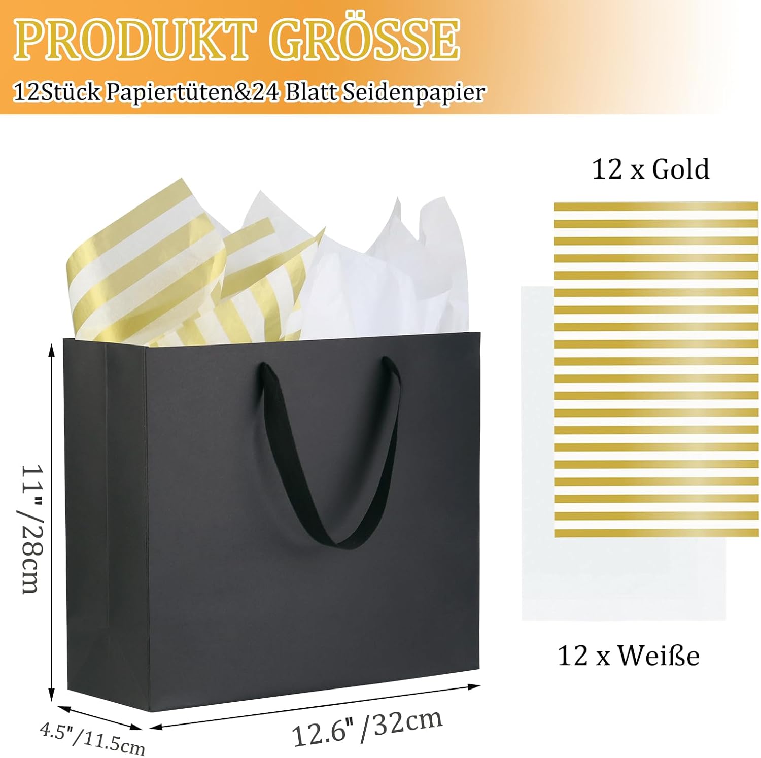 🎁Dai al regalo un aspetto lussuoso: la superficie del sacchetto di carta è liscia, la carta dura da 250 GSM conferisce al sacchetto un aspetto nobile e la carta velina decorativa che rende il tuo regalo più elegante e prezioso. ♻️Set di sacchetti di carta super convenienti: 12 sacchetti di carta, dimensioni: 12x4,5x11 (32x11,5x28 cm). Set sacchetti di carta con 12 fogli di carta velina rigata oro e 12 fogli di carta velina bianca (50x70 cm). ♻️Costruzione robusta e carta più spessa - Realizzati in carta kraft spessa 250 GMS di alta qualità, con robusti manici in tessuto che non sono facili da strappare, i sacchetti di carta possono facilmente sostenere da 5 a 10 libbre di peso. ♻️Sacchetti di carta ecologici - Questi sacchetti di carta con manici sono realizzati con carta riciclata al 100%, non solo ecologica, innocua, ma anche riutilizzabile, salutare per te e per l'ambiente, questa è la tua prima scelta. ♻️ Multiuso: questi sacchetti di carta per vari regali e occasioni, come feste di compleanno, matrimoni, baby shower, pubblicità, festa della mamma e altre celebrazioni. È la borsa regalo perfetta per le vacanze, la borsa per la spesa, la borsa per la vendita al dettaglio, la borsa per il merchandising e la borsa di benvenuto per il matrimonio.