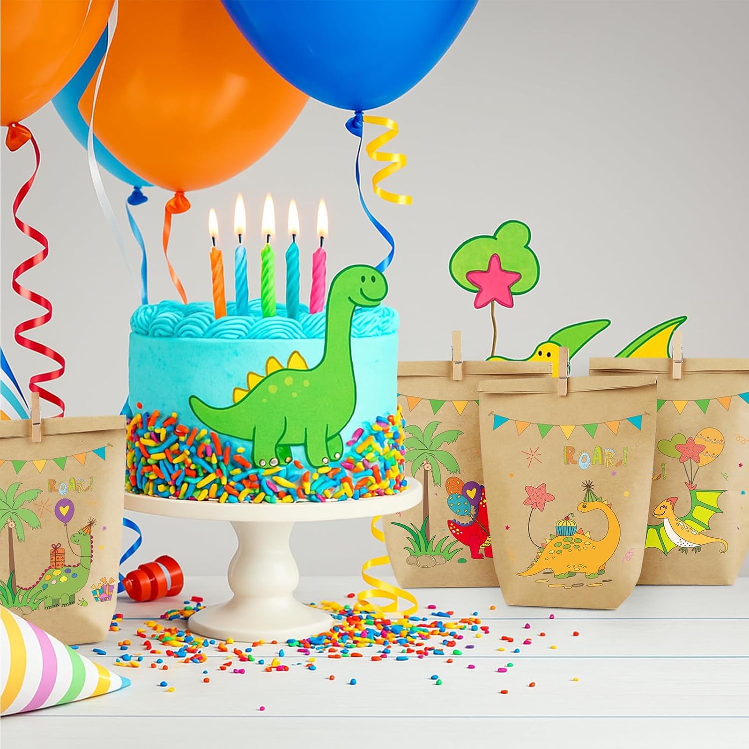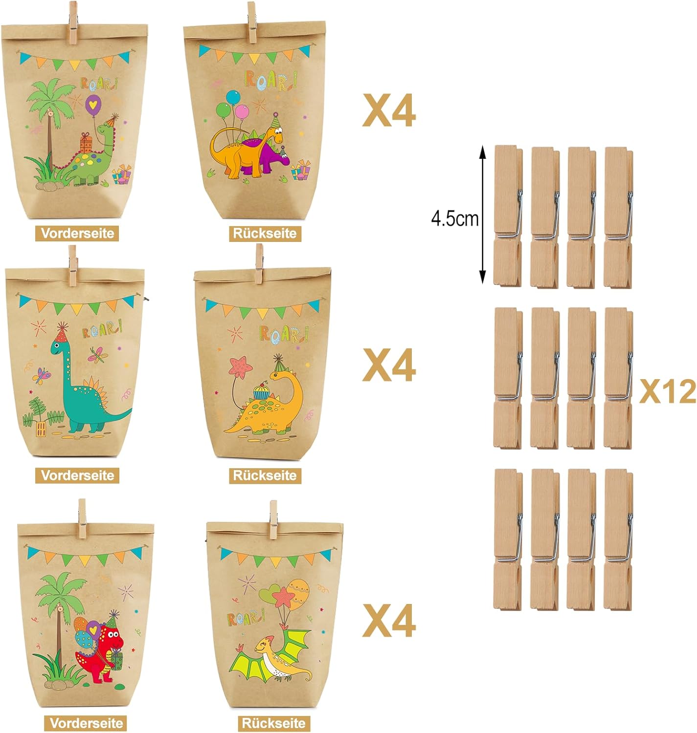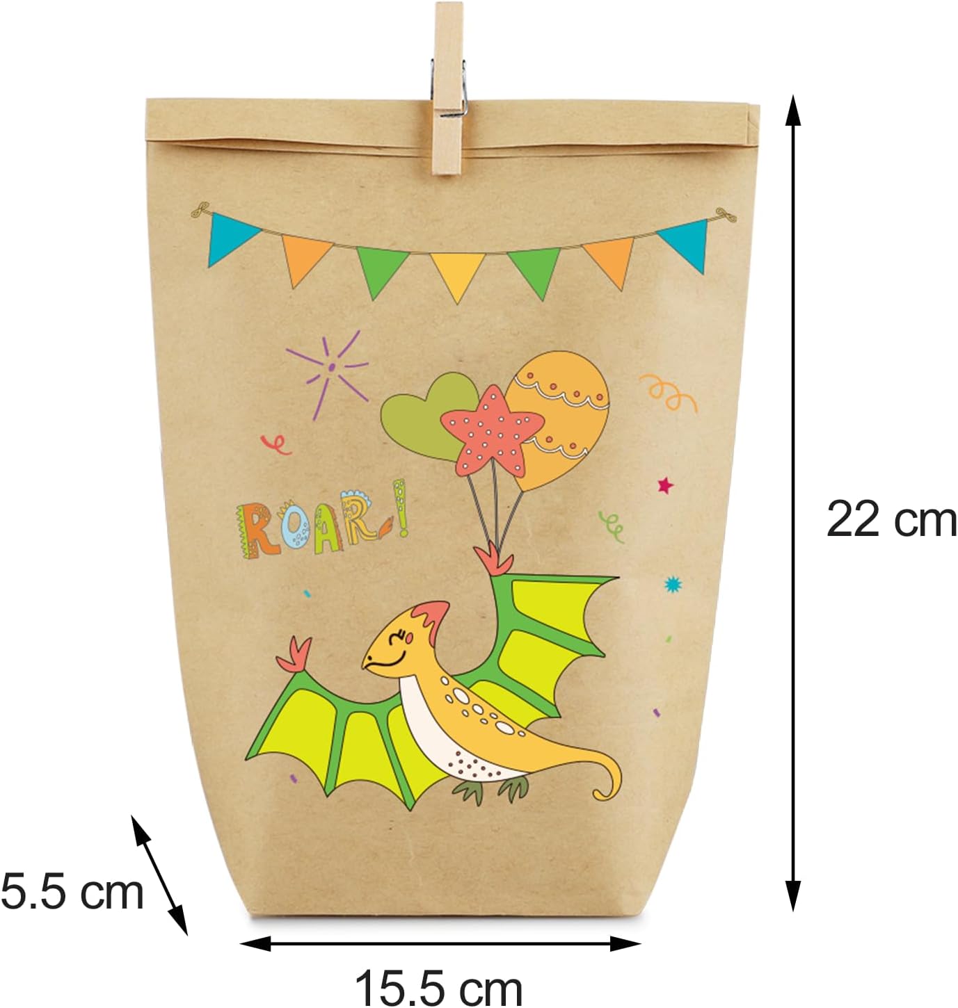 Un set di sacchetti per feste con 12 sacchetti di carta kraft marrone (15 x 22 cm) e stampa – colorati, 12 piccole mollette in legno per chiudere. Ottima decorazione per il compleanno dei bambini: sacchetti di carta stampati con amore, questi sacchetti regalo con dinosauri da 12 pezzi hanno 3 design. Ideale per l'asilo, la scuola e come decorazione per la casa. Perfetti come sacchetti a sorpresa da riempire con bomboniere, sacchetti per feste, omaggi, caramelle, cioccolatini e altri bellissimi dolci. Ottimo regalo di compleanno per bambini e ragazzi. I sacchetti regalo stampati sono adatti come sacchetti regalo per il compleanno dei bambini o come confezione per souvenir di compleanno. I robusti e carini sacchetti di carta da regalo con dinosauri sono ideali per una varietà di usi. (Si prega di imballare prima i prodotti da forno grassi separatamente)