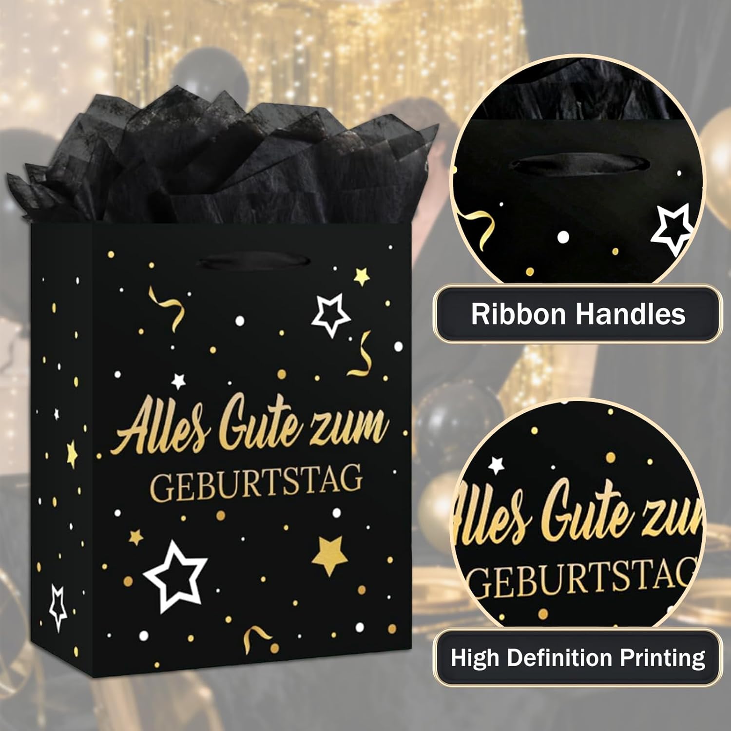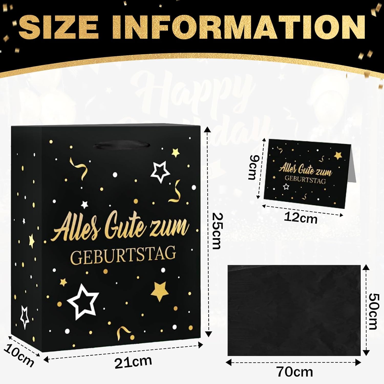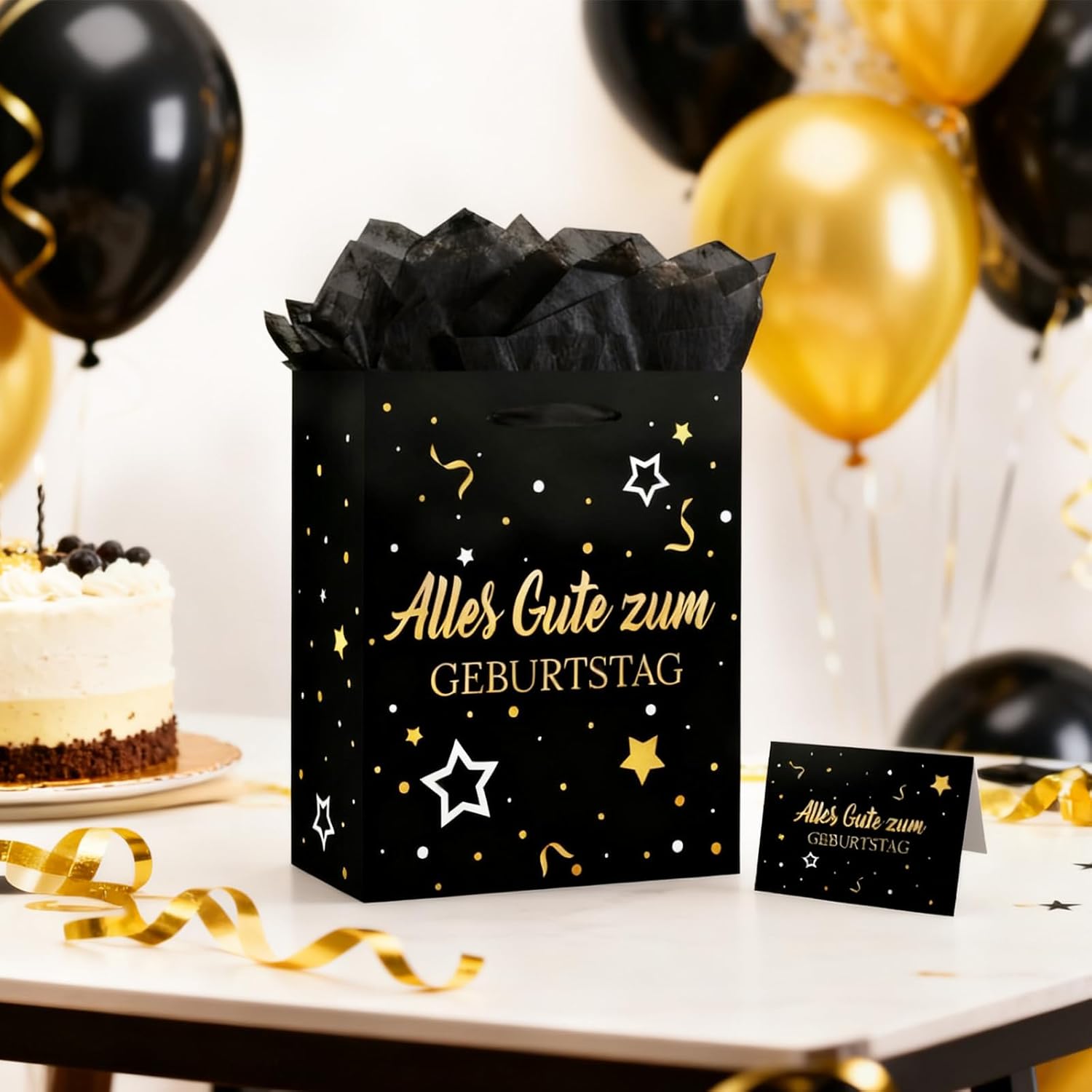 【Set di sacchetti regalo di compleanno】 Set di sacchetti regalo con motivo palloncini e coriandoli neri e dorati, composto da 1 sacchetto regalo con manici e motivo "Buon Compleanno". Ogni sacchetto regalo contiene 3 pezzi di carta velina e un biglietto di auguri a tema per le tue congratulazioni! 【Materiali di alta qualità】 Realizzati con materiali durevoli e di alta qualità che possono mantenere forma e dimensioni e accogliere regali di diverse dimensioni. La carta velina è inclusa. 【Taglia】 Il sacchetto regalo di compleanno è di ca. 21 x 25 x 10 cm, ogni pezzo di carta velina misura 50 x 70 cm, il biglietto d'auguri misura 12 x 9 cm. Puoi utilizzare la carta velina per decorare sacchetti regalo o incartare piccoli regali. 【Riutilizzabile】 La struttura estremamente robusta con base extra imbottita è durevole e affidabile per lo stoccaggio e il trasporto. I sacchetti regalo sono durevoli. Se non sei brava a confezionare regali ma vuoi comunque fare un bel regalo, questi sacchetti regalo in carta facili da realizzare fanno al caso tuo! 【Sacchetti per confezioni regalo】 Bellissimi accessori per decorare e confezionare per nascita, matrimonio, baby shower o battesimo. Questi sacchetti regalo offrono spazio sufficiente per regali, regali in contanti, dolci, torte e bomboniere. Le maniglie con coulisse li rendono facili da trasportare.