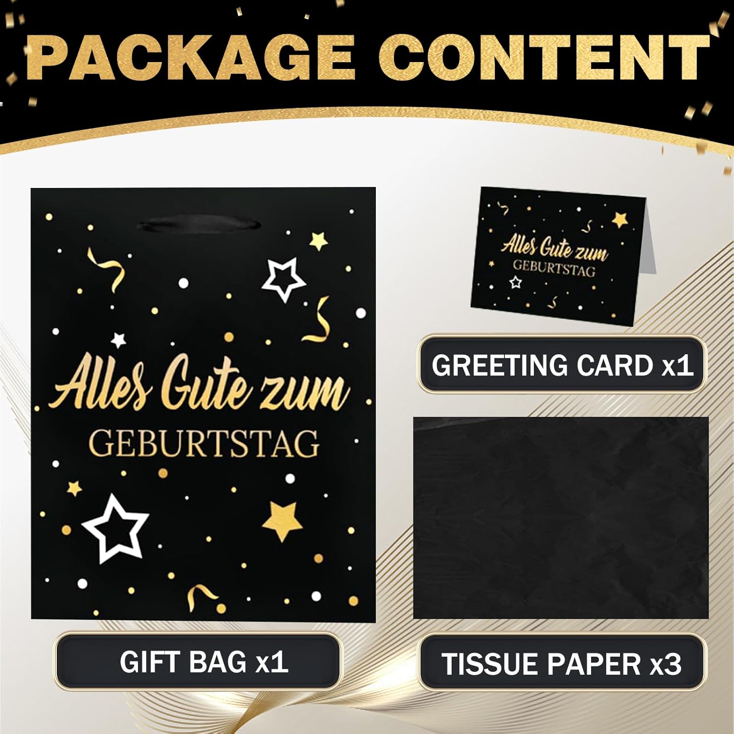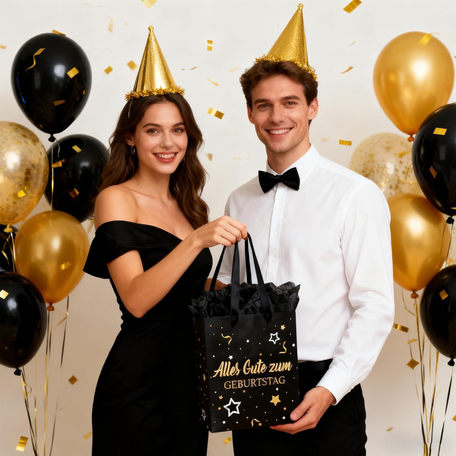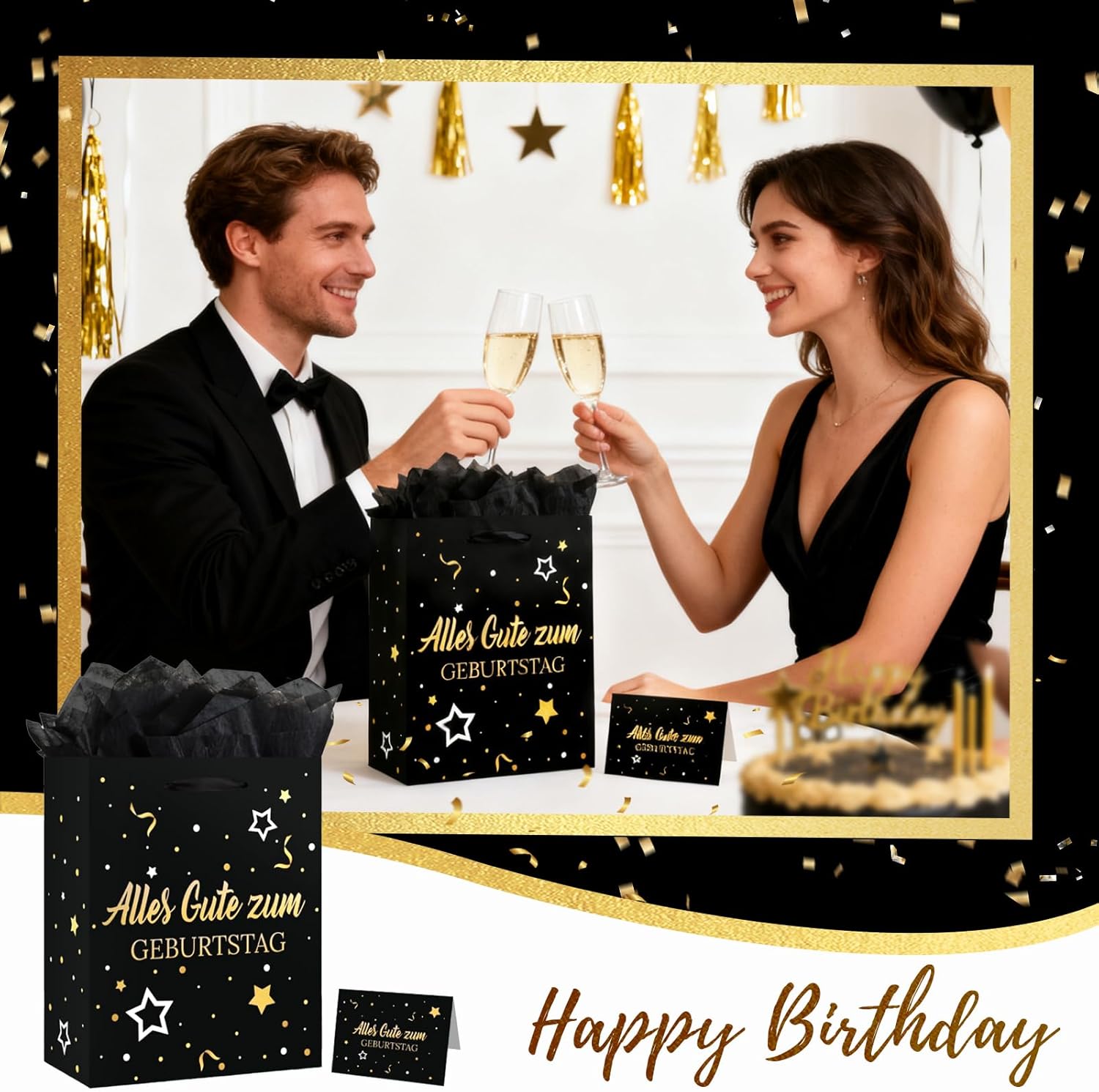 【Set di sacchetti regalo di compleanno】 Set di sacchetti regalo con motivo palloncini e coriandoli neri e dorati, composto da 1 sacchetto regalo con manici e motivo "Buon Compleanno". Ogni sacchetto regalo contiene 3 pezzi di carta velina e un biglietto di auguri a tema per le tue congratulazioni! 【Materiali di alta qualità】 Realizzati con materiali durevoli e di alta qualità che possono mantenere forma e dimensioni e accogliere regali di diverse dimensioni. La carta velina è inclusa. 【Taglia】 Il sacchetto regalo di compleanno è di ca. 21 x 25 x 10 cm, ogni pezzo di carta velina misura 50 x 70 cm, il biglietto d'auguri misura 12 x 9 cm. Puoi utilizzare la carta velina per decorare sacchetti regalo o incartare piccoli regali. 【Riutilizzabile】 La struttura estremamente robusta con base extra imbottita è durevole e affidabile per lo stoccaggio e il trasporto. I sacchetti regalo sono durevoli. Se non sei brava a confezionare regali ma vuoi comunque fare un bel regalo, questi sacchetti regalo in carta facili da realizzare fanno al caso tuo! 【Sacchetti per confezioni regalo】 Bellissimi accessori per decorare e confezionare per nascita, matrimonio, baby shower o battesimo. Questi sacchetti regalo offrono spazio sufficiente per regali, regali in contanti, dolci, torte e bomboniere. Le maniglie con coulisse li rendono facili da trasportare.