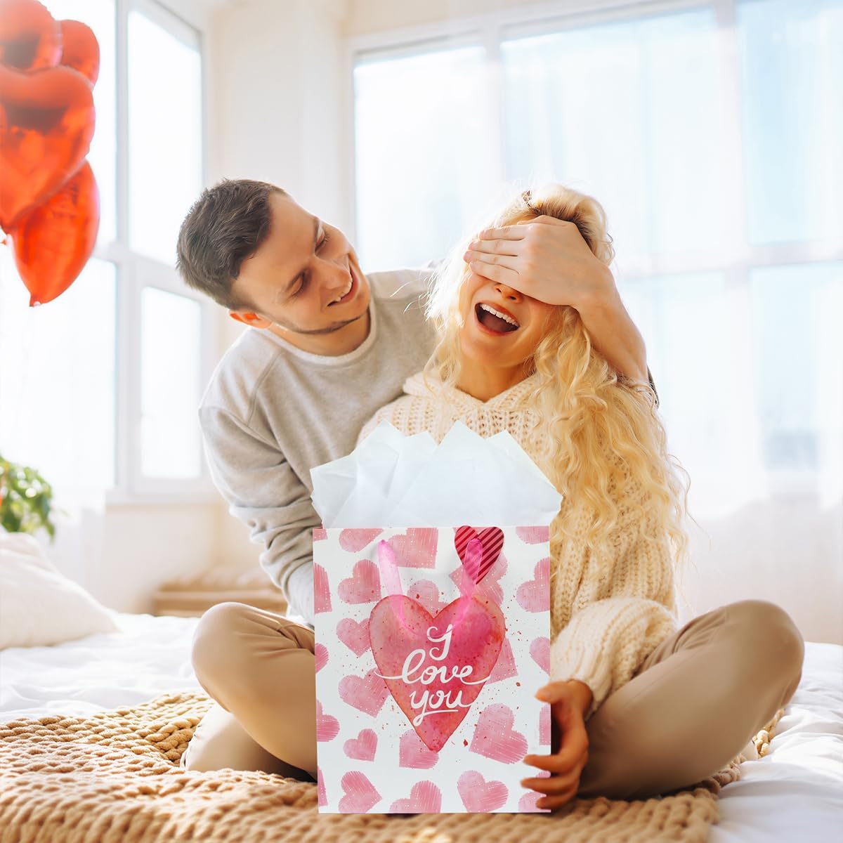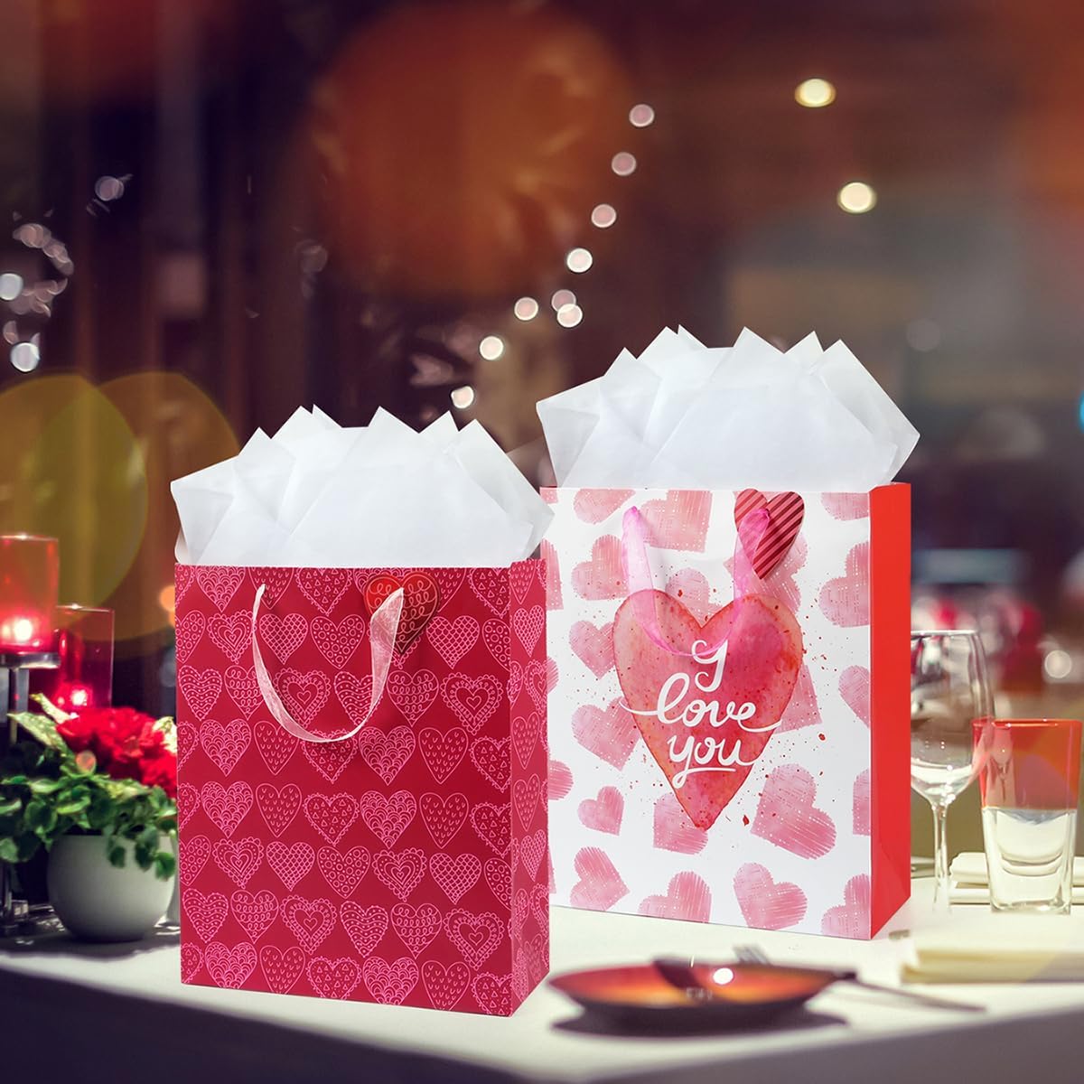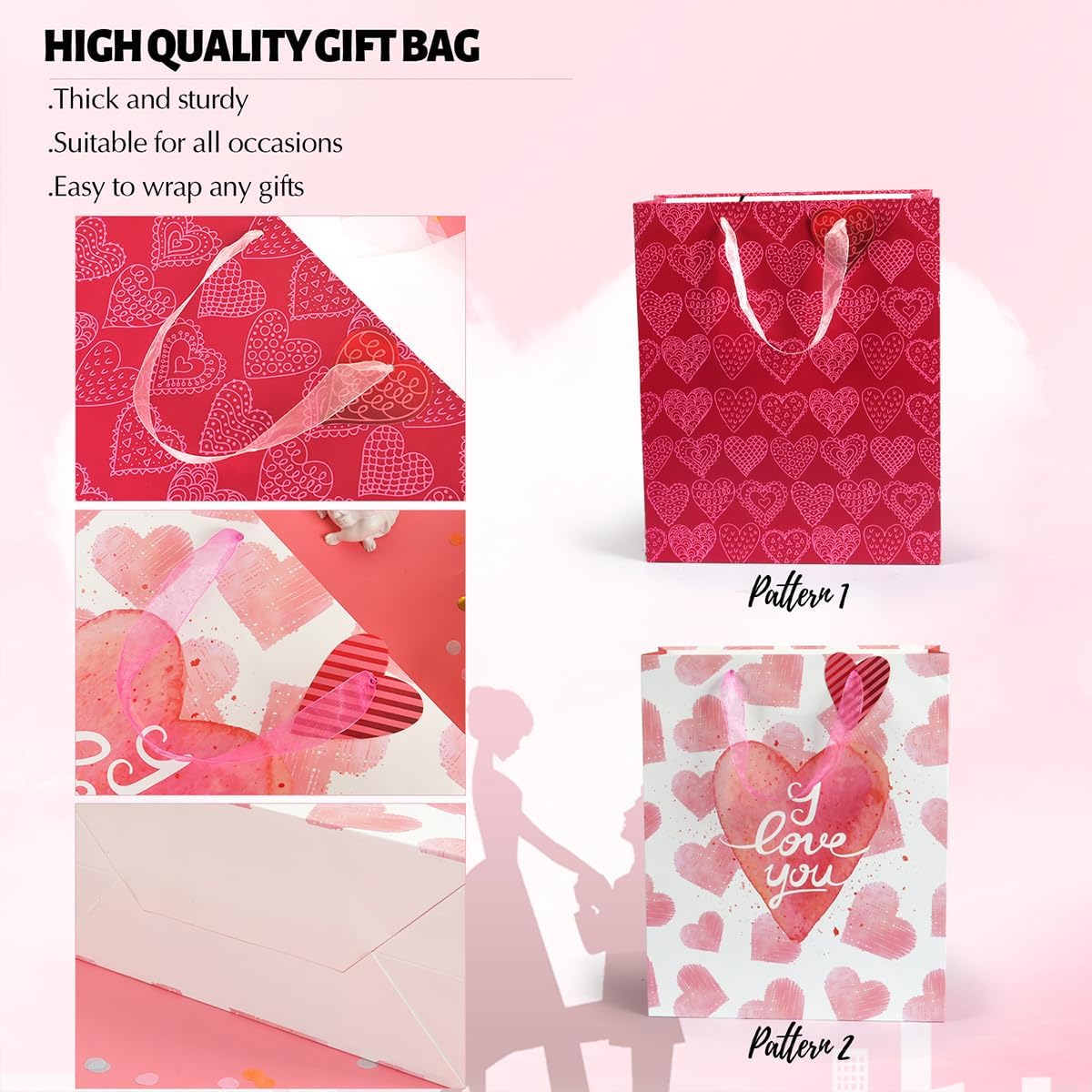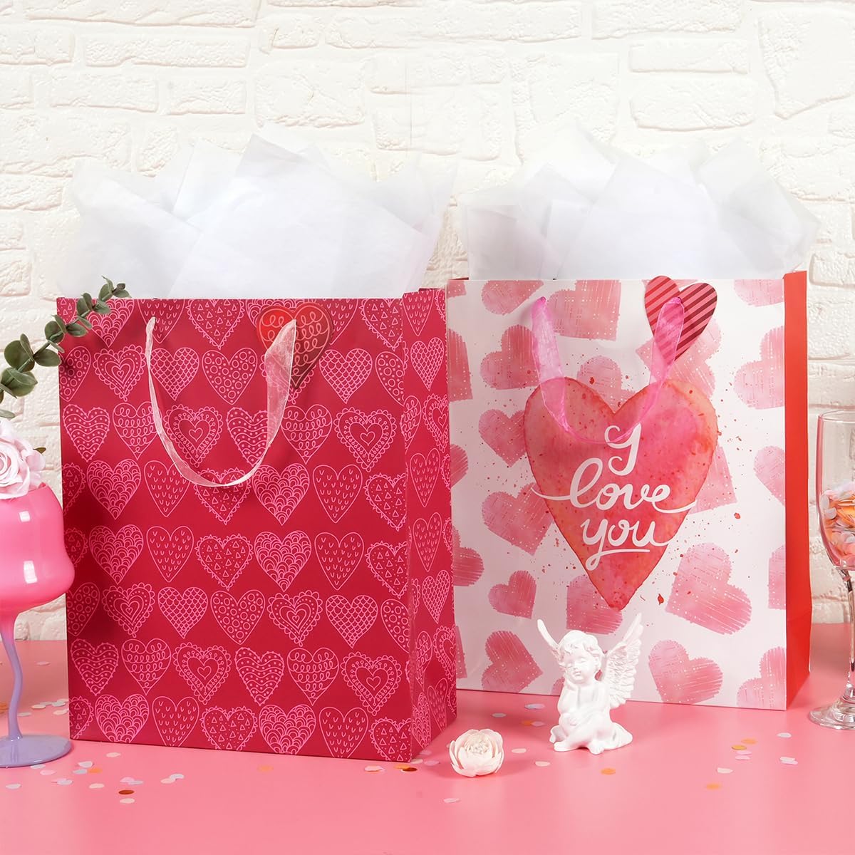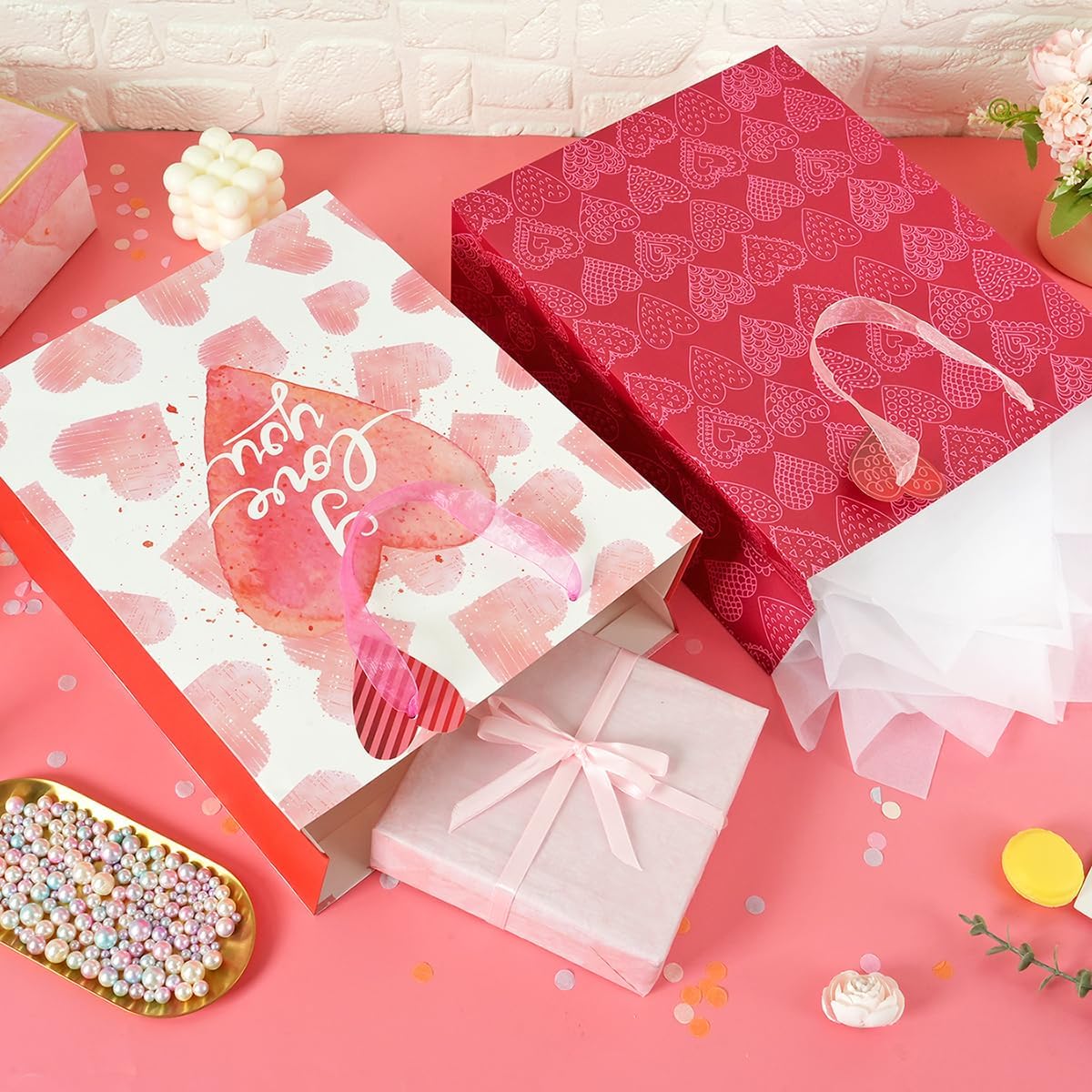 Sacchetto regalo cuore rosso: il set di sacchetti regalo cuore rosso include 2 sacchetti regalo di lusso. L'aspetto raffinato mostra amore per il destinatario ed è sicuramente un punto culminante per tutte le occasioni. SET DI BORSE REGALO GRANDE: il sacchetto regalo per donna misura 32 x 26 x 11 cm, abbastanza grande per regali multipli e ottimo per regali più grandi. Sacchetti regalo rossi e rosa: sacchetto regalo grande disegnato con 2 diversi motivi di cuore, un grande cuore rosa con le lettere "I Love You" e diversi stili di cuori rossi. La borsa regalo è dotata anche di un manico a nastro per un tocco di lusso, fantastica borsa regalo per ragazze e donne. Sacchetti di carta di alta qualità: i sacchetti regalo sono realizzati in carta di cartone spessa di alta qualità, robusti e ben fatti, non facili da strappare o rompere, le maniglie sono fissate saldamente e non cadono facilmente. Tutte le occasioni: questi sacchetti regalo di carta sono pratici e perfetti per San Valentino, festa della mamma, compleanno, matrimonio, fidanzamento, baby shower, addio al nubilato, Ringraziamento, anniversari, Capodanno, Natale e altre occasioni speciali.