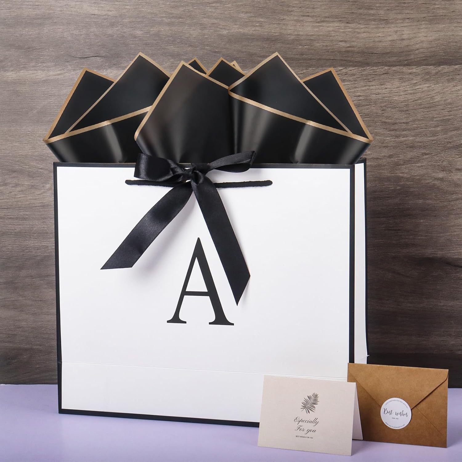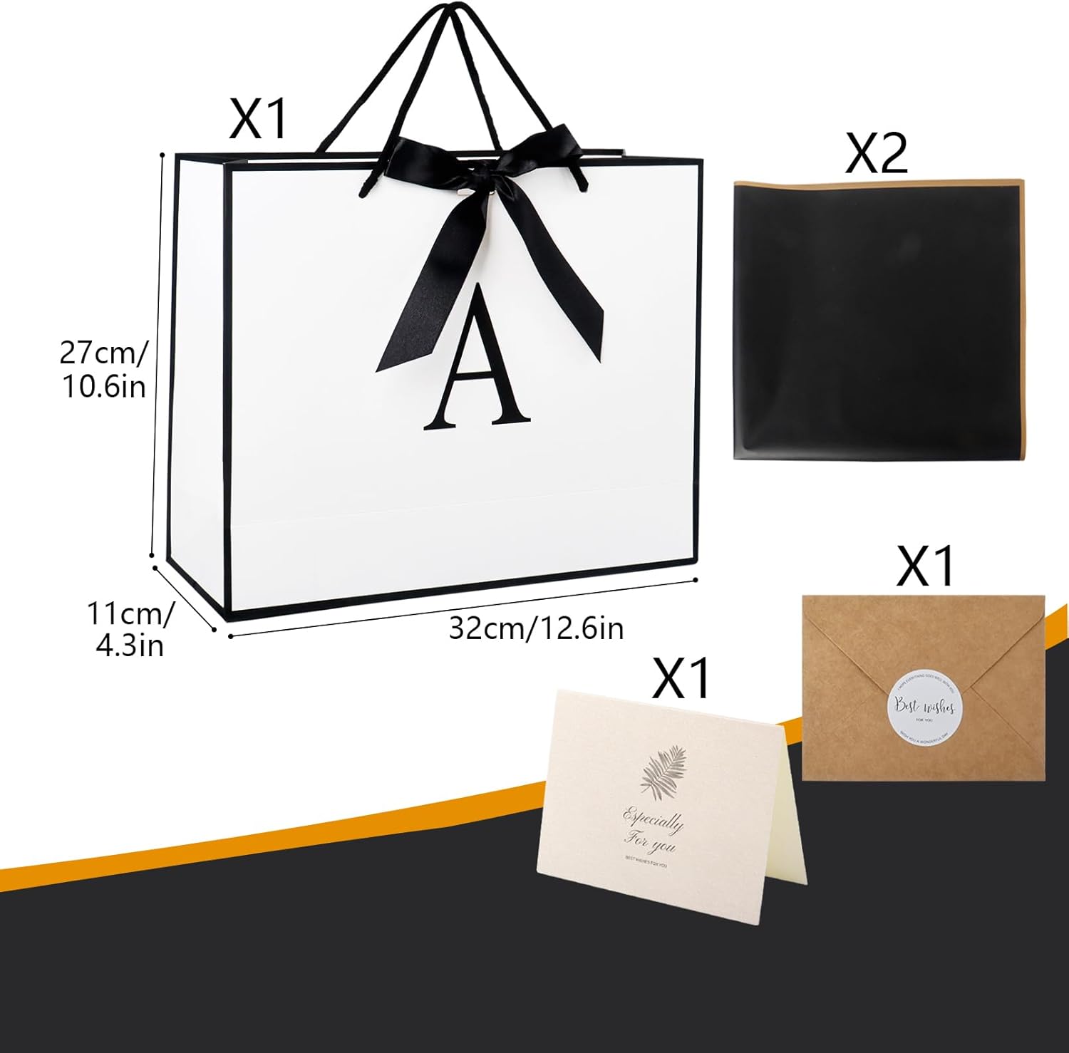 Design elegante e personalizzato: le scritte eleganti aggiungono un tocco personale al tuo regalo ed sono adatte per compleanni, matrimoni e occasioni speciali. DIMENSIONI E QUALITÀ PREMIUM: Realizzata in carta robusta di alta qualità, la borsa regalo da 32×11×27 cm (12,6×4,3×10,6 pollici) è abbastanza spaziosa per contenere regali di medie e grandi dimensioni e garantisce affidabilità. Set completo per confezioni regalo: include carta velina, biglietti e nastri di raso abbinati per un'esperienza di confezione sofisticata e professionale. MULTIUSO - Questa borsa è ideale per regalare vestiti, libri o altri oggetti speciali e aggiungerà un aspetto lussuoso a qualsiasi regalo. ECOLOGICA E RIUTILIZZABILE: Realizzata con materiali riciclabili, questa borsa è una scelta eco-consapevole per eliminare gli sprechi mantenendo l'eleganza.