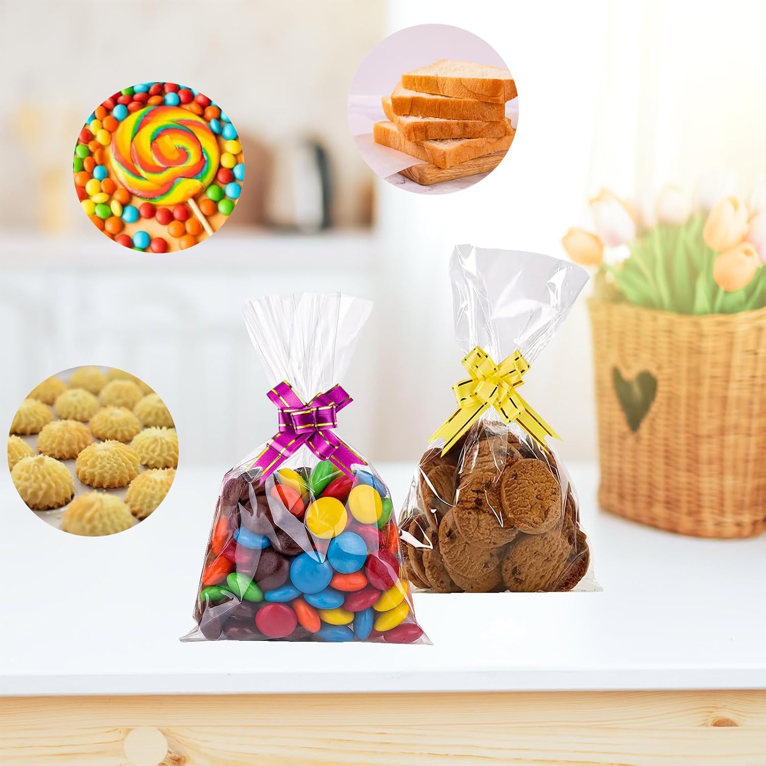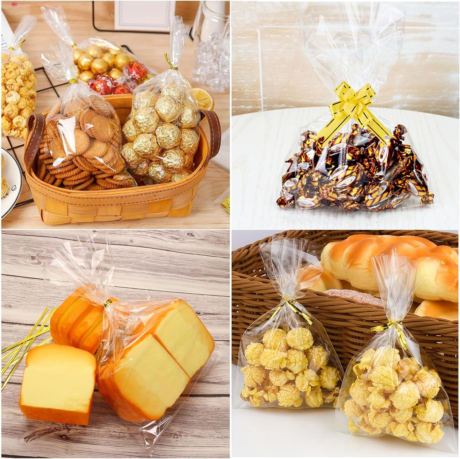 VARIE DIMENSIONI: Il nostro set di sacchetti di cellophane contiene 100 sacchetti trasparenti per dolcetti in 2 diverse dimensioni: 50 pezzi da 5,9 x 9,84 pollici, 50 pezzi da 7,9 x 11,4 pollici e 100 pezzi di fiocchi e lacci. REGALO PERFETTO PER LE FESTE: i sacchetti regalo in cellophane sono ideali per confezionare regali dalla forma insolita e confezionare tutti i tipi di regali. Prova una combinazione di piccoli sacchetti trasparenti con fiocchi colorati e nastri attorcigliati per aggiungere una finitura accattivante e bella alla tua confezione. Alta qualità: sacchetti di caramelle trasparenti spessi, resistenti e altamente trasparenti possono essere utilizzati per confezionare caramelle, torte, biscotti, biscotti, oggetti artistici e artigianali. Sicuro per gli alimenti: sei preoccupato per la freschezza delle caramelle o della frutta confezionate? Il vantaggio principale dei nostri sacchetti per alimenti in cellophane OPP trasparente è quello di mantenere fresco il gusto dei prodotti da forno e prolungare la durata di conservazione degli alimenti. Ampiamente utilizzato: il set selezionato di sacchetti di plastica trasparente può soddisfare le vostre esigenze di imballaggio in varie occasioni, tra cui commercio, feste di compleanno, vacanze, matrimoni, feste di Halloween e Natale, regali, ecc.