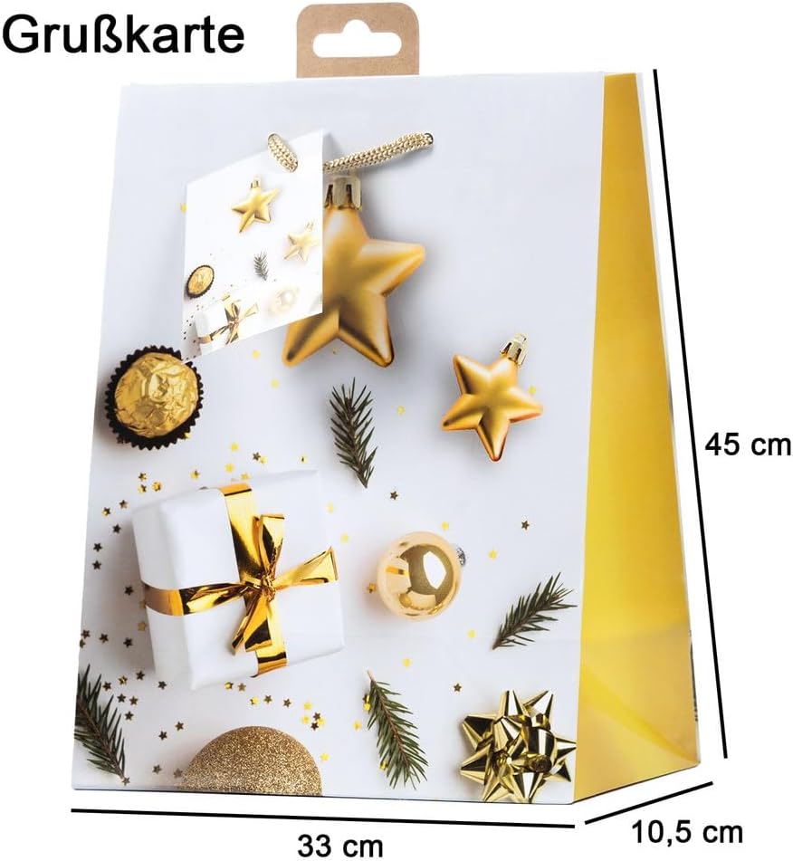 Dimensioni e stabilità: le borse jumbo offrono spazio sufficiente per regali di grandi dimensioni e sono abbastanza robuste per trasportare in sicurezza oggetti pesanti o delicati. Design eleganti e festosi: con vari motivi e decorazioni natalizie, danno ad ogni regalo un tocco individuale e lussuoso. Made in Germany ecologico: queste borse sono prodotte in Germania, il che significa lavorazione ecologica e di alta qualità. Usi versatili: ideale per Natale, compleanni o altre occasioni speciali in cui i regali impressionanti devono essere presentati in modo appropriato. Disponibili in diverse confezioni: i sacchetti sono disponibili in set da 10, 20 o 40, perfetti per regali di diverse dimensioni e occasioni.