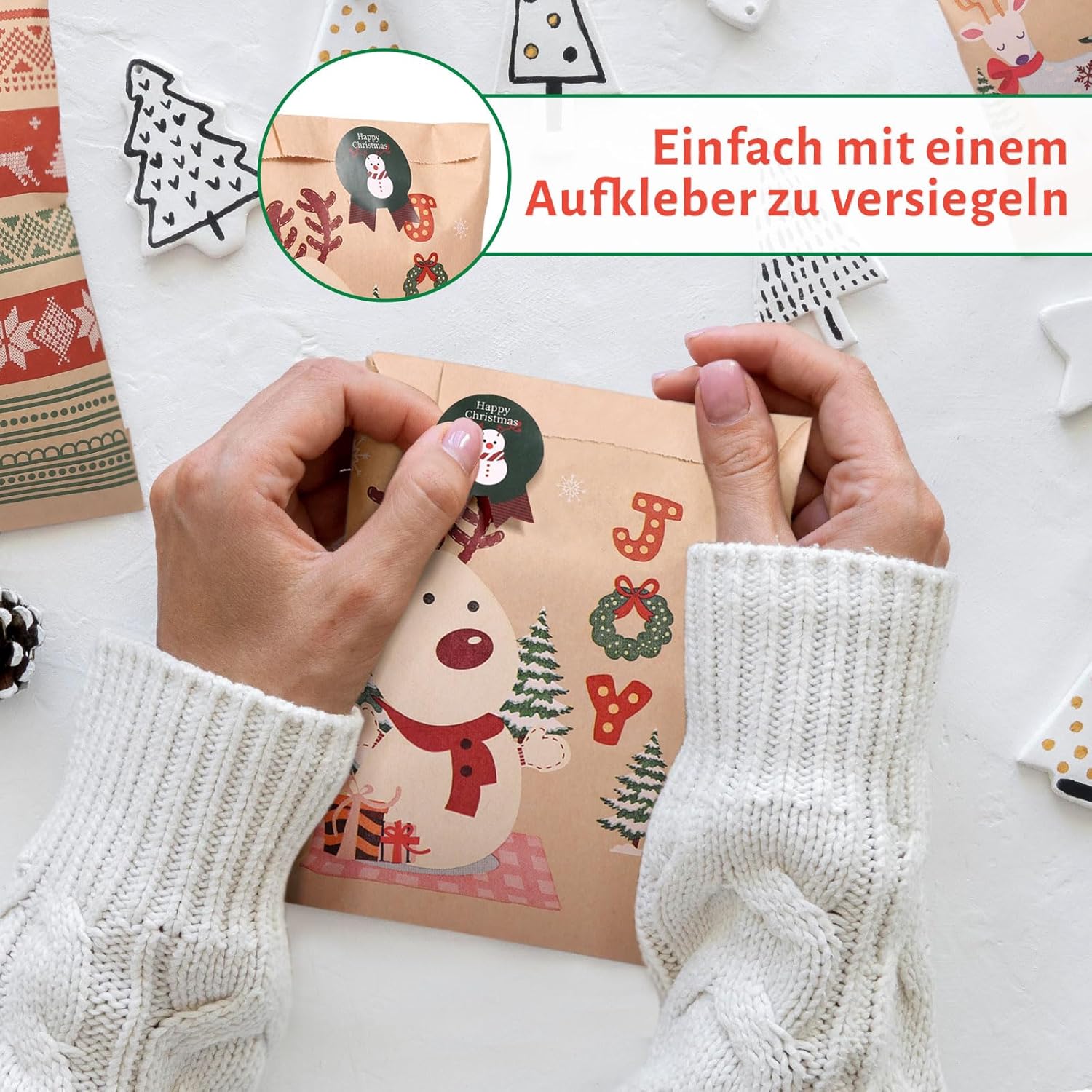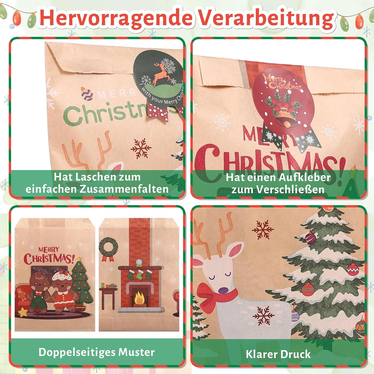 Quantità: 50 sacchetti di carta con 64 adesivi regalo, 5 modelli da 10 pezzi ciascuno; Dimensioni: circa 13x18 cm Alta qualità: realizzata in carta kraft ecologica, robusta e riutilizzabile: la scelta perfetta per la confezione regalo Disegni di sacchetti di carta chiaramente stampati, 5 disegni: alce, omino di pan di zenzero, albero di Natale, strisce di Natale, ecc. Soddisfa le diverse esigenze di modello. La dimensione è abbastanza grande da contenere caramelle o regali per la festa. Puoi usare questi sacchetti per caramelle, regali, piccoli giocattoli o altro. Può essere utilizzato per i regali di Natale! Questa graziosa borsa natalizia è ideale per conservare regali per la famiglia, gli amici e i bambini. Buon Natale a tutti!