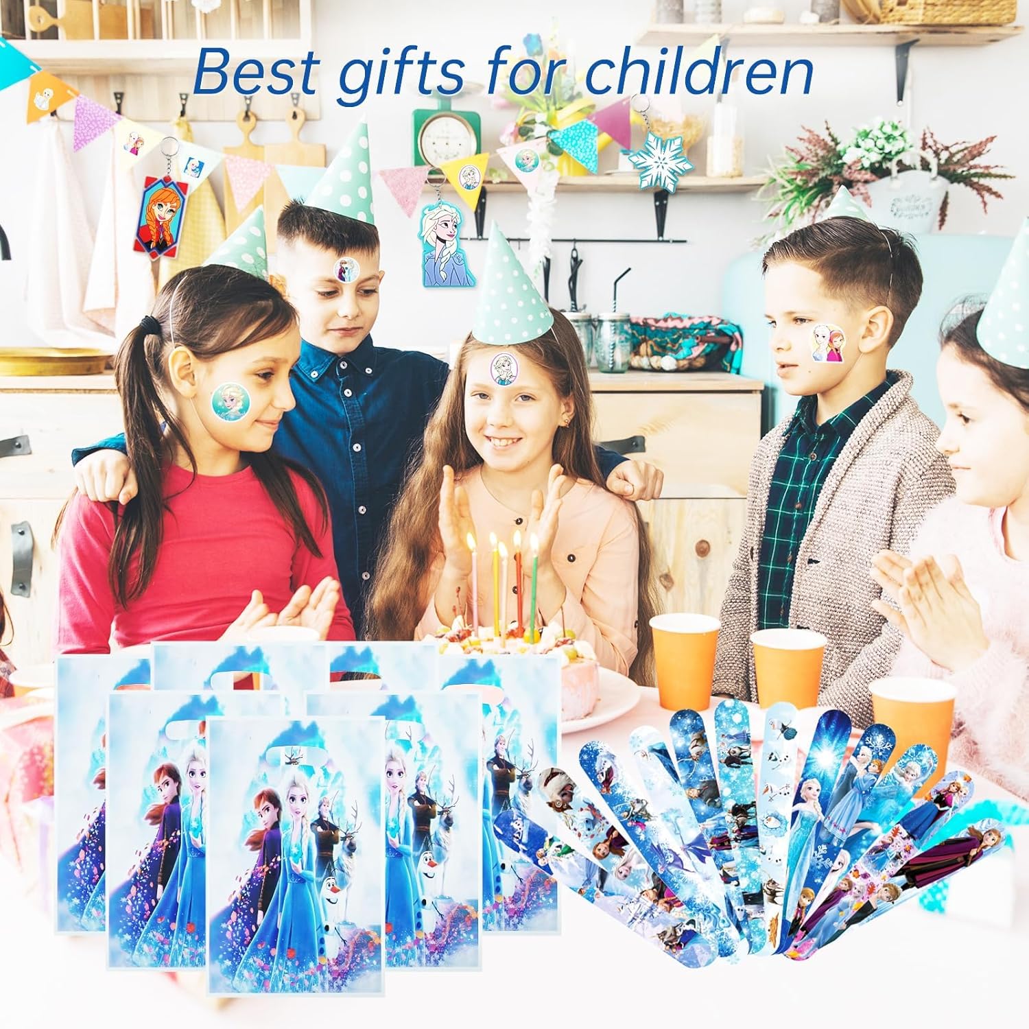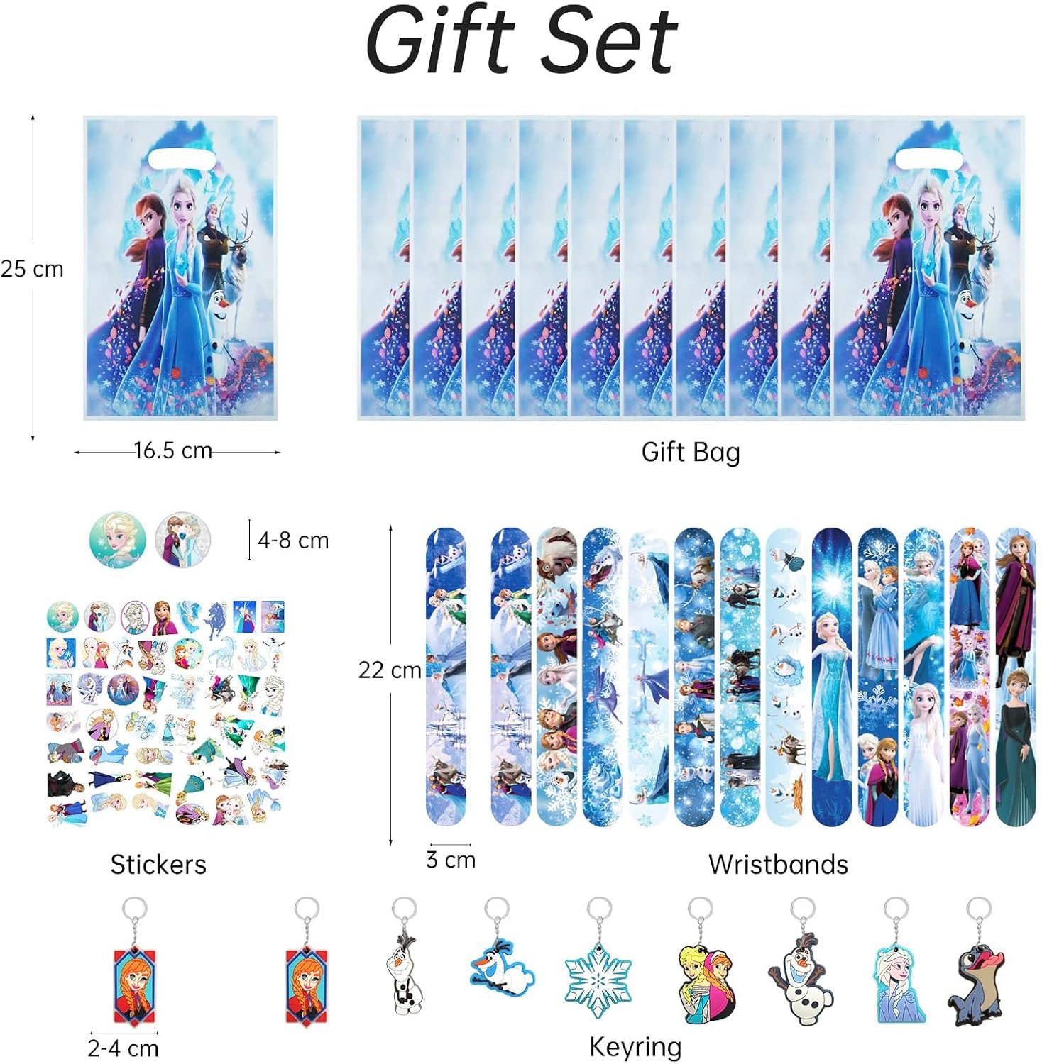 Contenuto della confezione del set di sacchetti per feste di compleanno per bambini: questo set di sacchetti per feste di compleanno per bambini contiene molti gadget interessanti per un totale di 80 pezzi, inclusi 8 portachiavi, 10 sacchetti regalo per sacchetti per feste, 50 adesivi, 12 braccialetti a scatto. Queste bomboniere per il compleanno dei bambini garantiscono tanto divertimento alla festa delle ragazze. Il set di borse da festa Frozen è il miglior regalo a sorpresa per le feste ed è molto popolare tra le ragazze. Design classico e popolare dei cartoni animati: il set di borse per feste di compleanno per bambini è stampato con motivi anime classici e carini dei cartoni animati. Grazie al design a cartone animato, le bomboniere per la festa di compleanno dei bambini attirano l'attenzione di ogni ragazza. Omaggi perfetti per i compleanni dei bambini, puoi usarli come piccoli premi o premi di apprendimento per i tuoi bambini. I bambini saranno entusiasti e potranno godere di questi premi e regali per molto tempo. Piccoli regali per bambini di alta qualità: ogni piccolo giocattolo nella borsa per la festa di compleanno dei bambini è realizzato con materiali di alta qualità. I sacchetti regalo possono essere utilizzati per incartare piccoli regali o snack. Gli adesivi sono dai colori vivaci e stampati in modo chiaro. I braccialetti sono costituiti da un nucleo di ferro di alta qualità all'interno e sono avvolti in PVC all'esterno. Il portachiavi è realizzato con ganci in silicone e metallo di alta qualità, atossici e innocui, robusti e durevoli. Ampiamente usato: i nostri ripieni di pinata sono adatti per le ragazze. Queste bomboniere per feste di compleanno per bambini hanno una vasta gamma di usi. Sono perfetti come riempitivo del calendario dell'Avvento, premi della lotteria, premi in classe e feste a tema. Insegnanti e genitori possono anche utilizzare bomboniere come premi di giochi o premi di classe per gli studenti. Rendi i bambini più motivati ad apprendere! Regalo per feste a sorpresa: le bomboniere per feste di compleanno per bambini sono combinate con vari elementi di cartoni animati in base alle preferenze dei bambini e sono molto adatte per feste per bambini, compleanni per bambini, regali per il rientro a scuola, premi di carnevale, premi per spettacoli, regali di Halloween e regali di Natale, ecc. Puoi distribuire questa bomboniera alla festa di compleanno di tuo figlio per includere tutti e ravvivare l'atmosfera della festa.