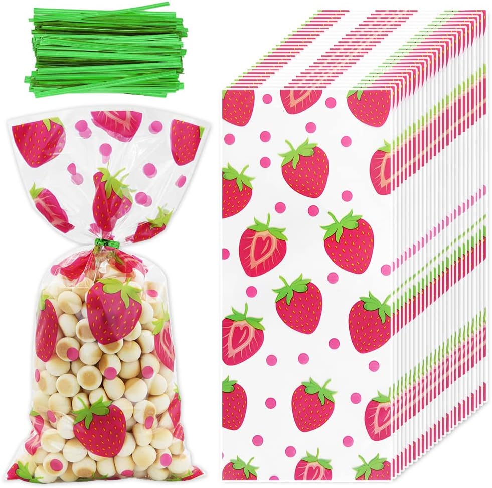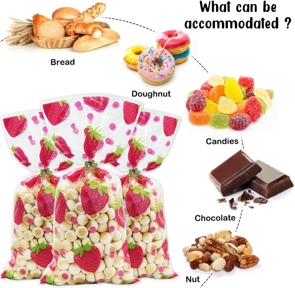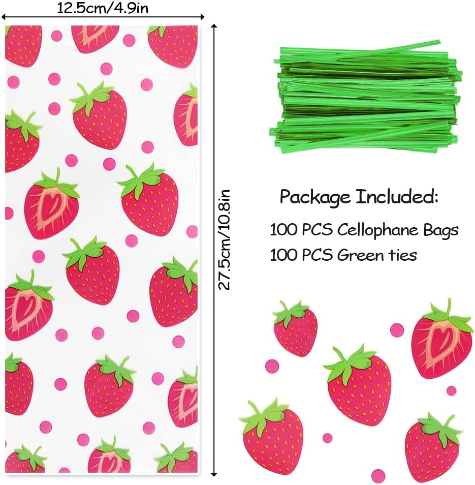 🍓 Pacchetto valore; Ogni confezione contiene 100 sacchetti per dolcetti stampati con fragole, che misurano 12,5 x 27,5 cm. Include anche 100 lacci verdi: 9,5 cm di lunghezza per chiudere i sacchetti di caramelle. Tanti sacchetti di cellophane per te durante i regali di compleanno. Design carino: questa borsa in cellophane è stampata con fragole di frutta estiva su entrambi i lati e decorata con alcuni punti. La speciale fragola rosa rossa sembra molto attraente e bella, aggiungi cravatte verdi per aggiungere più colore e gioia alla tua festa. Qualità premium; Realizzato in OPP per uso alimentare, liscio e leggero e non facile da rompere, Twist Tie è realizzato in poliestere e filo di ferro, resistente e facile da torcere. Facile da usare: i sacchetti per dolcetti ai frutti di bosco con nastri sono così leggeri, molto facili da trasportare e i nastri attorcigliati sono riutilizzabili, comodi anche per inserire o estrarre le cose di cui hai bisogno. Il design del sacchetto trasparente può vedere chiaramente il cibo nel sacchetto, il che è comodo per il funzionamento e impedisce che vengano inserite più o meno cose. Ampia applicazione: perfetta per cake pop, lecca-lecca, noci, biscotti, dolcetti, snack, premi, bomboniere fatte in casa, cioccolato, cake pop, frutti di bosco, perline, frutta secca, gelatine o qualsiasi cosa tu voglia. Gli adorabili sacchetti di caramelle sono adatti anche per feste di compleanno, baby shower, matrimoni, sacchetti per snack per bambini, addio al nubilato, matrimoni, addii al nubilato, fidanzamento.
