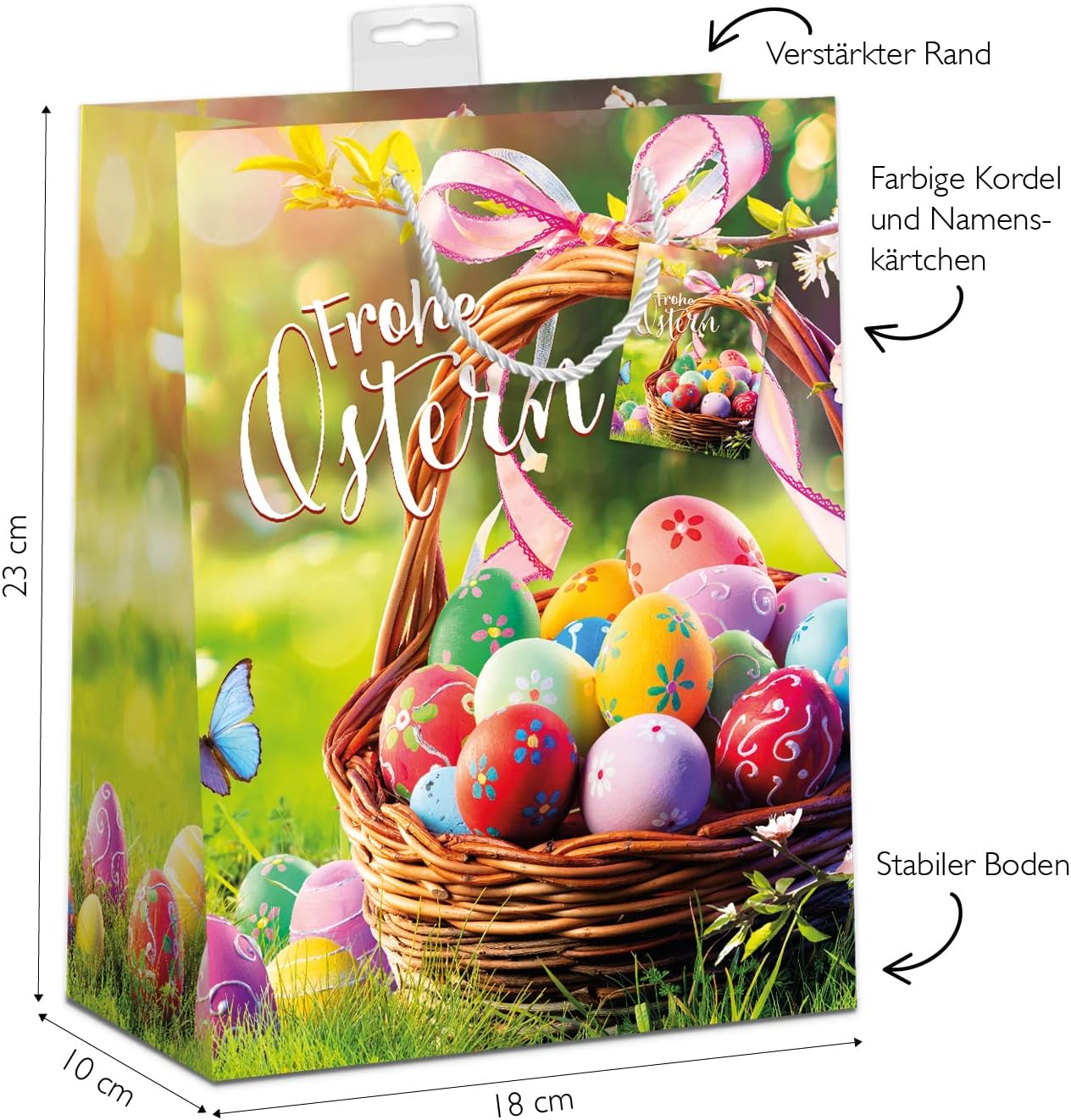 🌷 Fornitura: 10 sacchetti regalo di alta qualità (2x per motivo) 🎁 Dimensioni: media 18x23x10 cm, perfetta per un regalo fino a DIN A5 🐰 Finitura di alta qualità con vernice a dispersione e laminazione lucida 💚 Ogni sacchetto include cordoncino colorato, biglietto da visita e dispositivo Euroforo 🐇 carta robusta e resistente agli strappi, spessore della carta: 150 g/m²