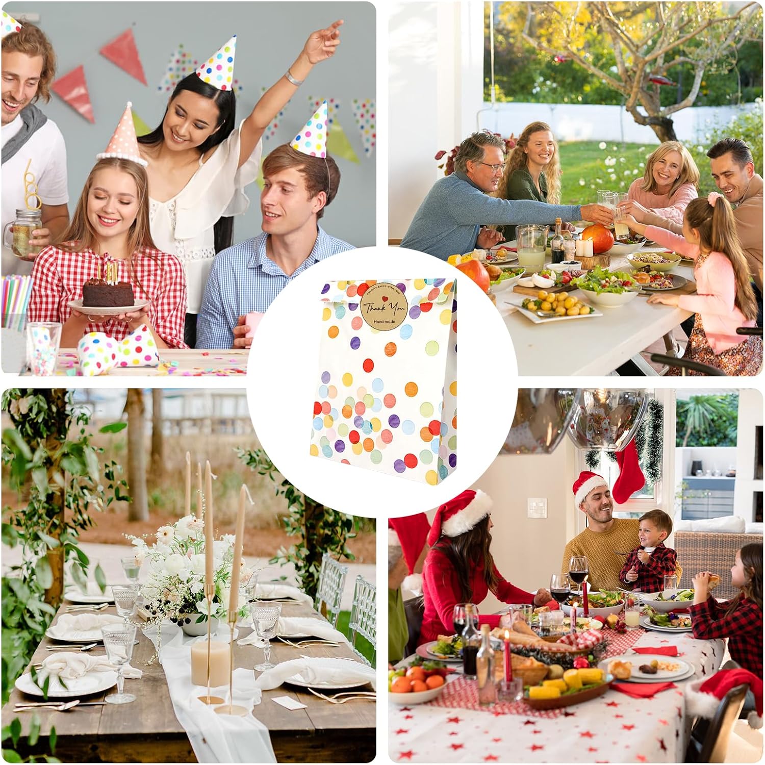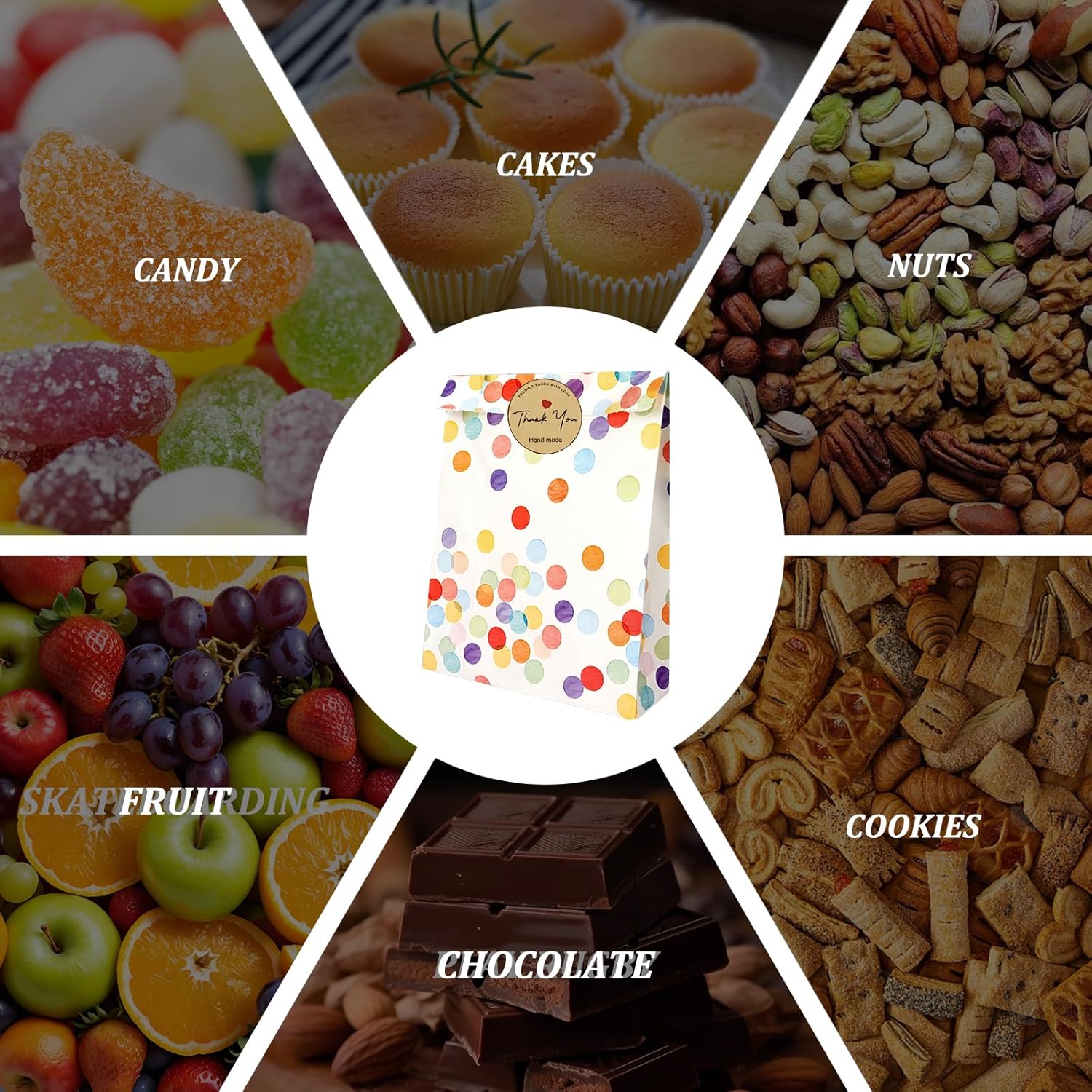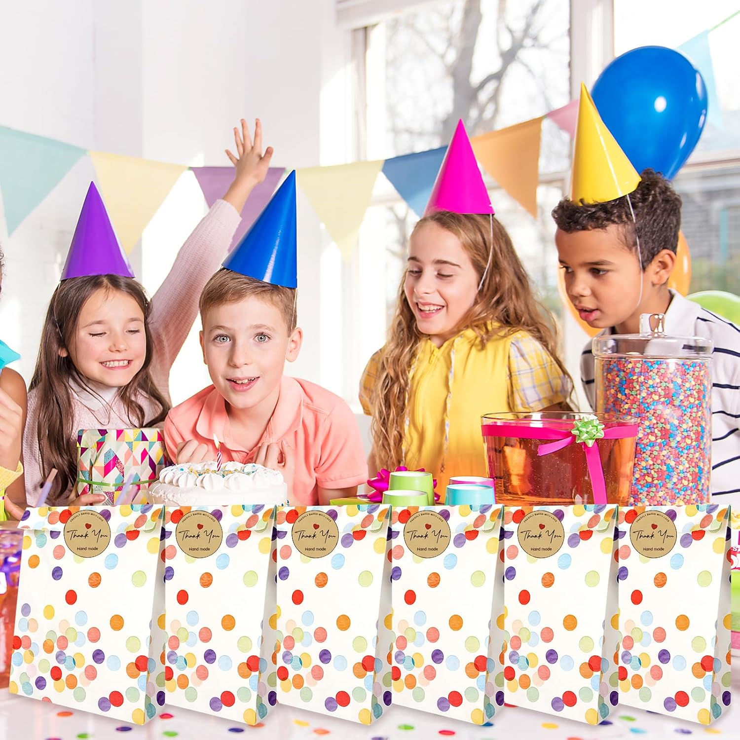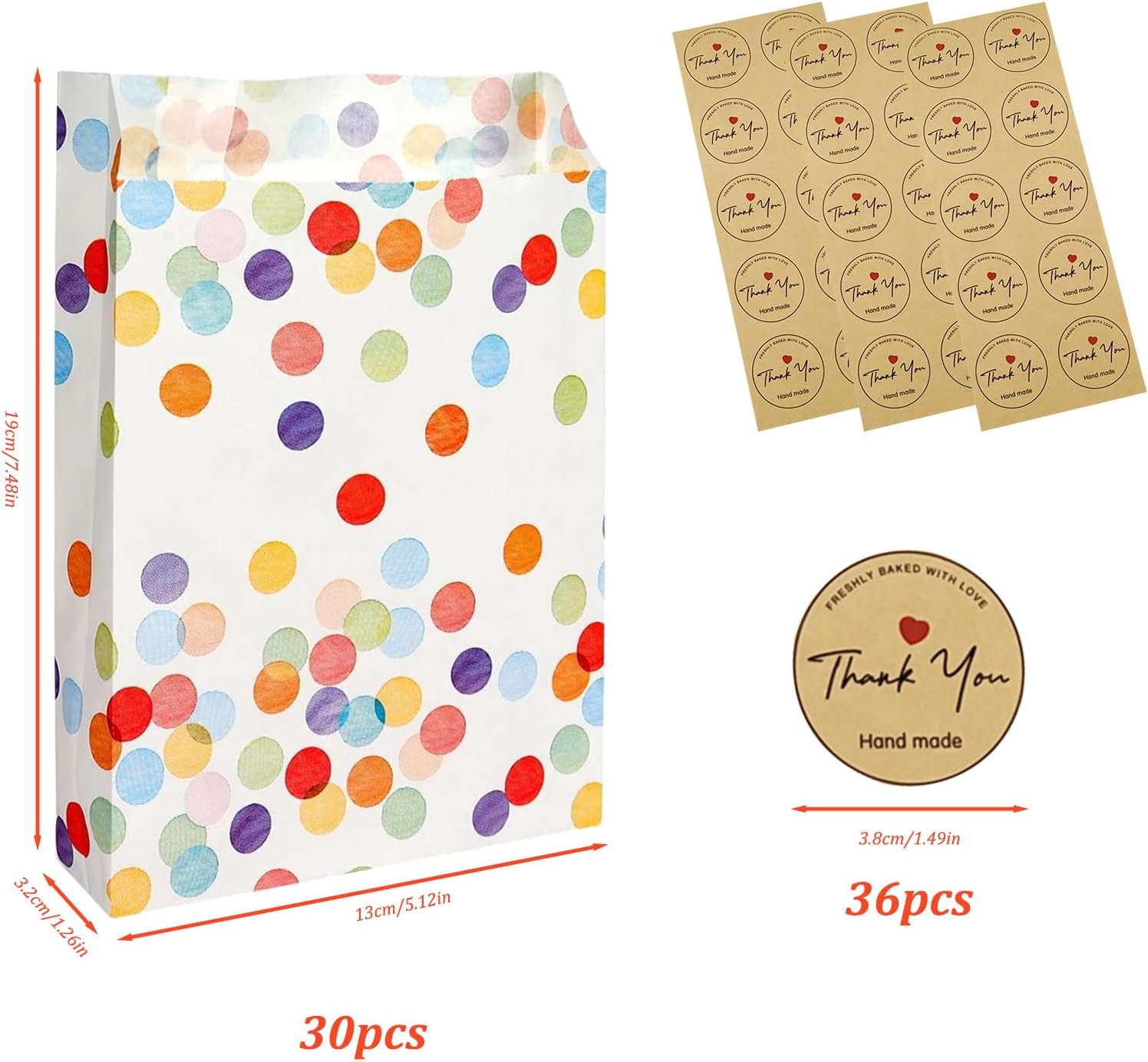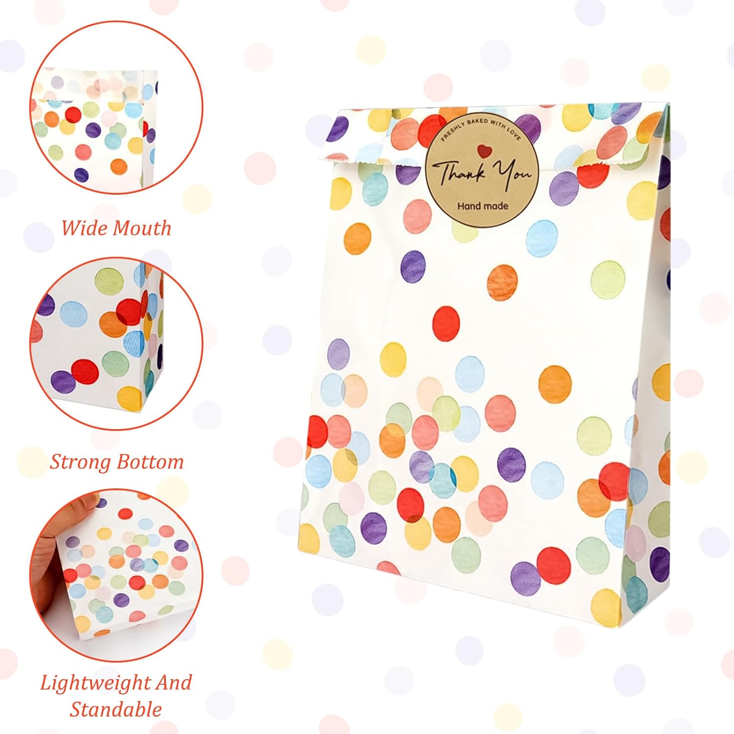 PERFETTO PER TUTTE LE OCCASIONI: questo set di sacchetti regalo è ideale per compleanni, matrimoni, feste e festività dei bambini come il Natale: una soluzione pratica per piccoli regali e sorprese. 30 sacchetti colorati e adesivi: il set contiene 30 sacchetti di carta con un allegro e colorato motivo a pois e 30 adesivi "Grazie" abbinati che aggiungono un tocco personale ai tuoi regali. Materiali di alta qualità: i sacchetti sono realizzati in carta di alta qualità, per alimenti e resistente all'olio, perfetta per caramelle, snack o piccoli regali. Dimensioni pratiche: con dimensioni di 19 x 13 x 3,5 cm, le borse sono compatte ma abbastanza spaziose per piccoli regali, regalini o snack: facili da trasportare e versatili. Design creativo: il motivo colorato a pois e gli eleganti adesivi di ringraziamento creano un'atmosfera amichevole e festosa che delizierà sicuramente i tuoi ospiti.