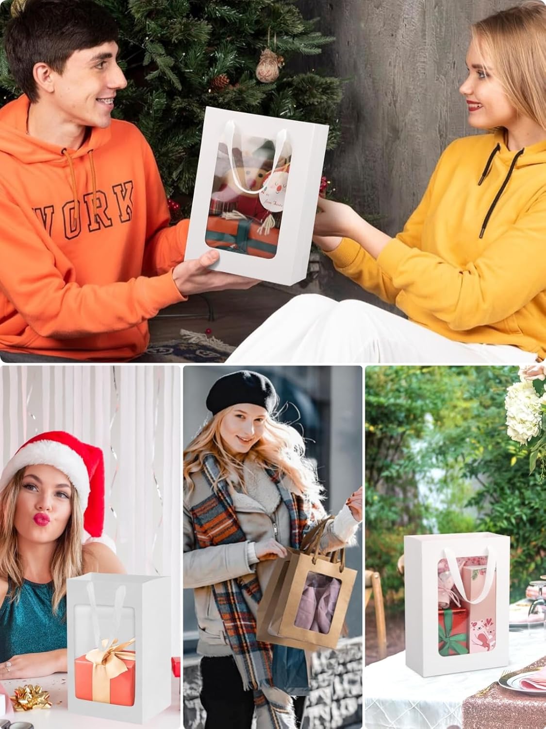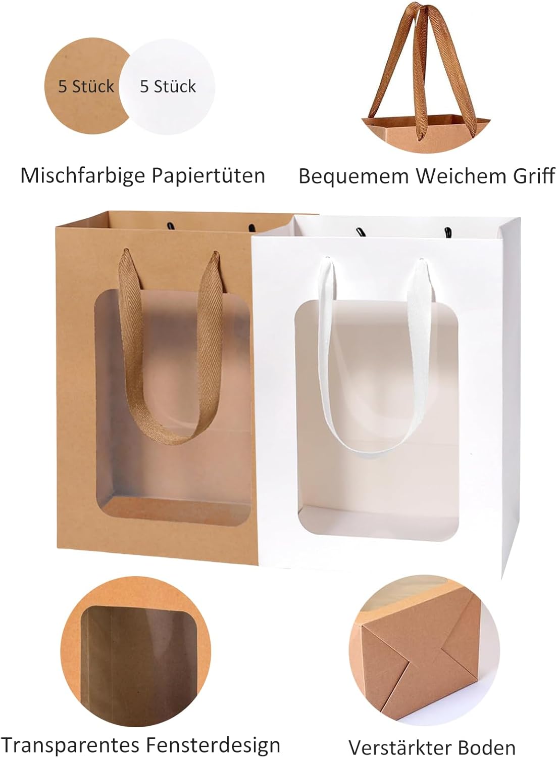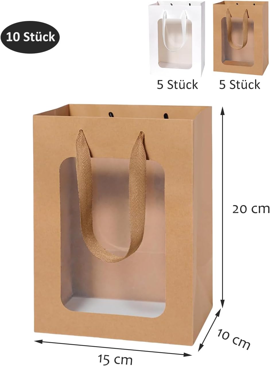 Sacchetti regalo di carta ideali con design a finestra trasparente: migliora la tua esperienza di regali con il nostro affascinante set di sacchetti di carta da 10 pezzi, composto da 5 classici sacchetti kraft e 5 eleganti sacchetti bianchi con design a finestra trasparente. Sacchetti di carta piccoli: ogni sacchetto misura circa 15X10X20 cm (lunghezza x larghezza x altezza), rendendolo la dimensione ideale per tutte le tue esigenze di confezione regalo. Sacchetti regalo in materiale premium: questi sacchetti sono realizzati in carta di alta qualità e presentano manici in cotone morbido e resistente che garantiscono un trasporto facile e comodo. I pavimenti rinforzati sono fissati saldamente e garantiscono la durata necessaria per trasportare i tuoi oggetti in sicurezza. Inoltre, sono riciclabili, quindi puoi fare regali ed essere ecologico allo stesso tempo! Decora i tuoi sacchetti regalo unici: libera la tua creatività con questi sacchetti di carta bianchi! Ti forniscono una meravigliosa tela per creare la tua confezione regalo unica e ti permettono di decorarla come desideri. Puoi aggiungere nastri o carta velina, disegnare qualcosa come preferisci. PERFETTI PER OGNI OCCASIONE: Trasforma ogni occasione in qualcosa di speciale con i nostri adorabili sacchetti di carta. Che tu ti stia preparando per Natale, Capodanno, compleanni, San Valentino, festa della mamma, matrimoni o qualsiasi altra celebrazione, questi versatili sacchetti di carta sono perfetti per bomboniere, borse della spesa, confezioni di bouquet o sacchetti di regali.