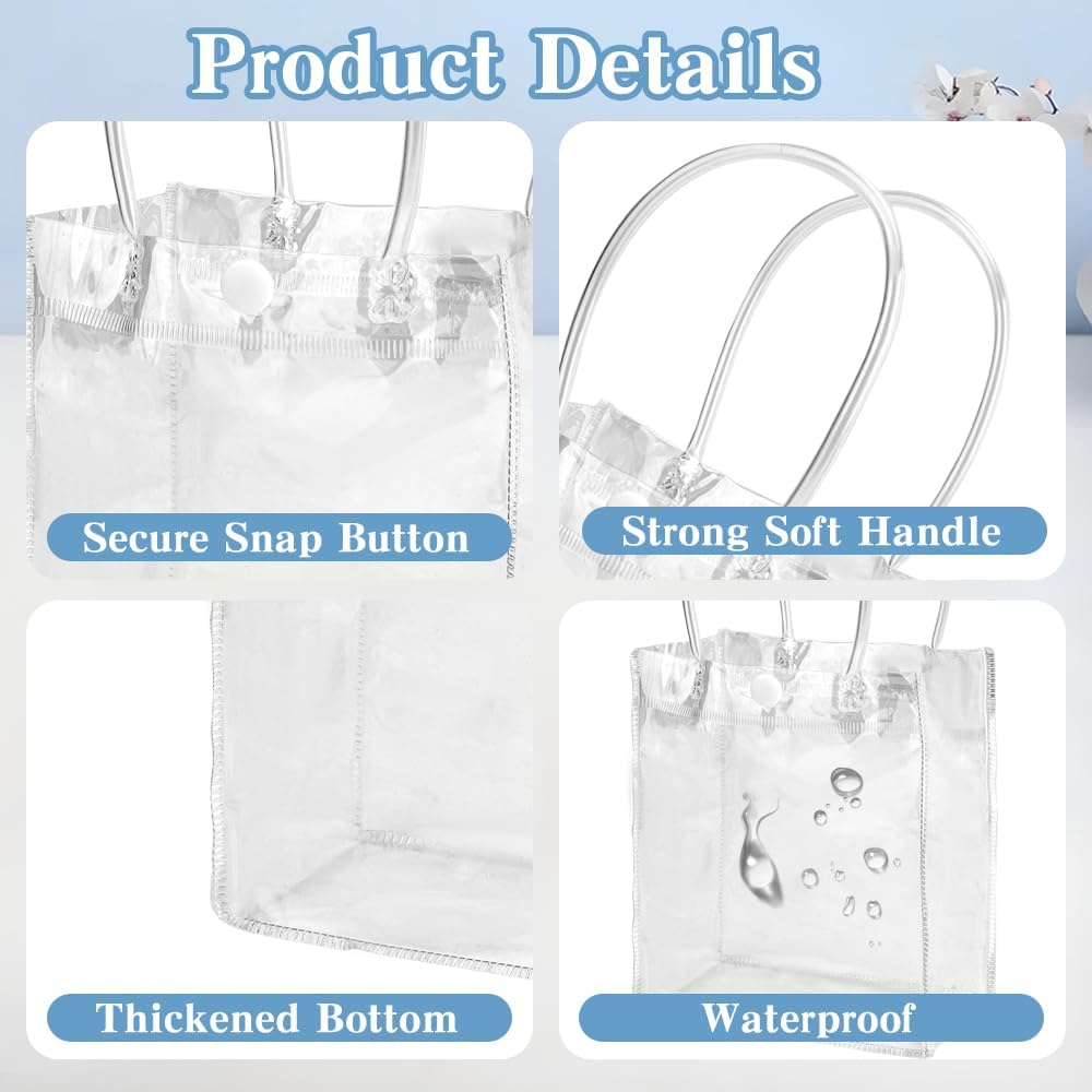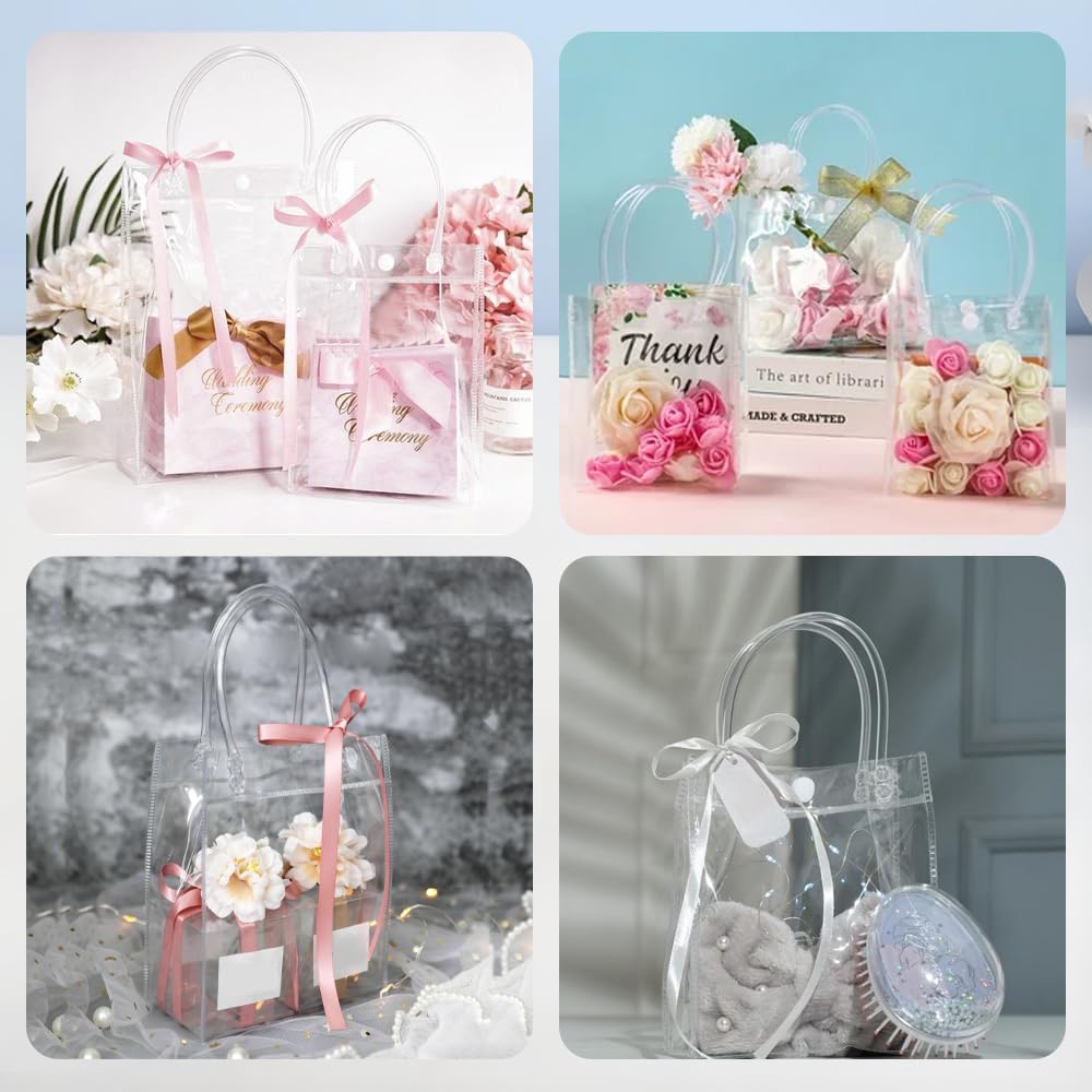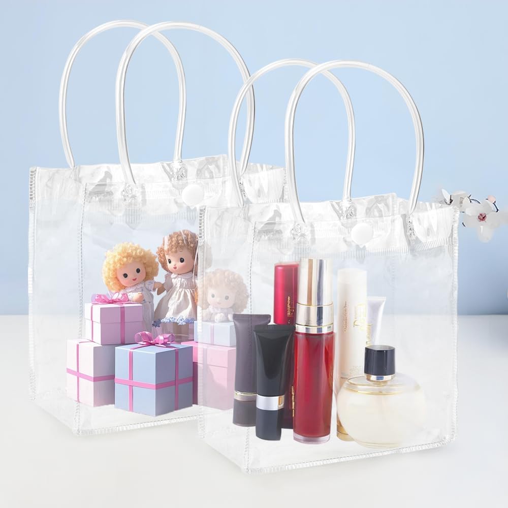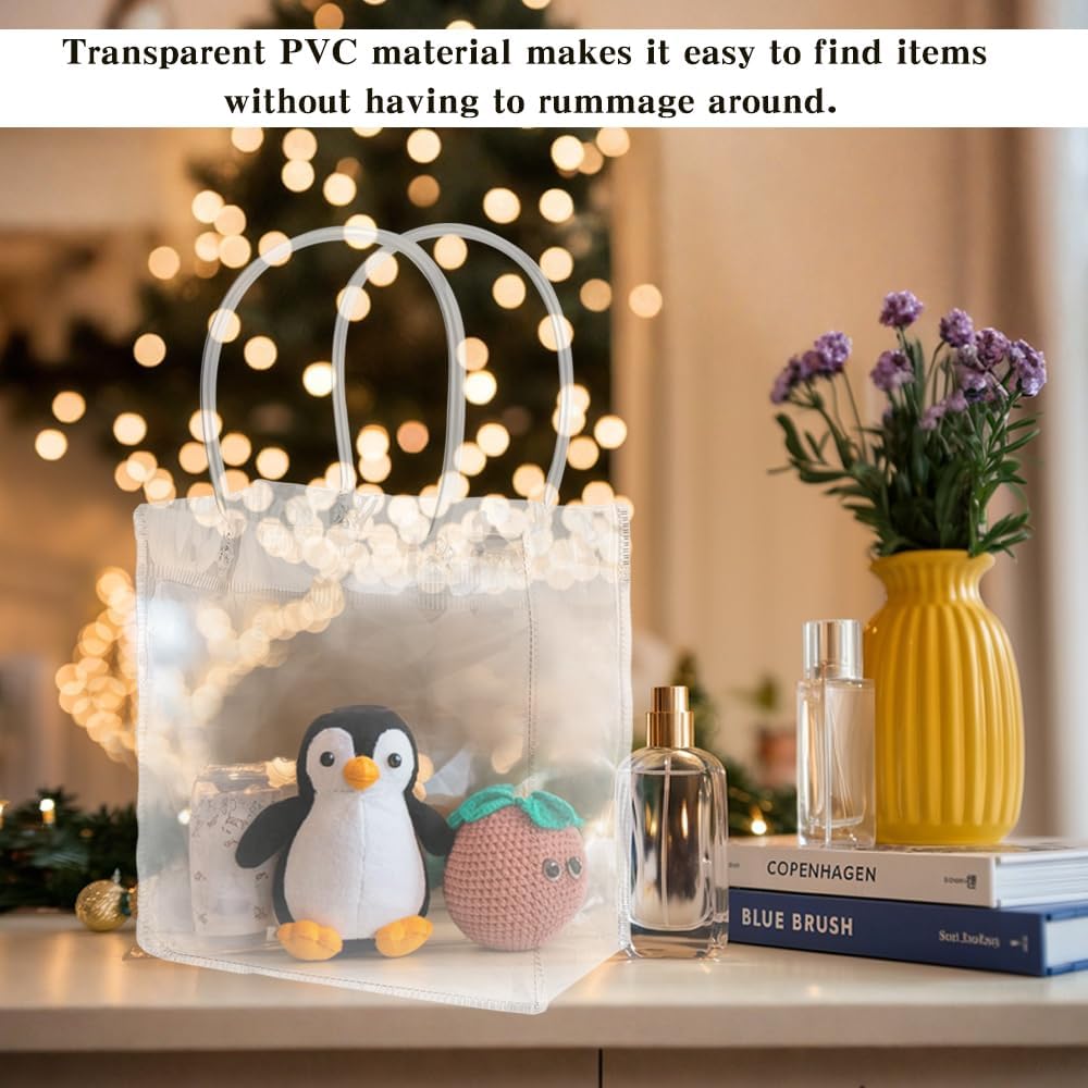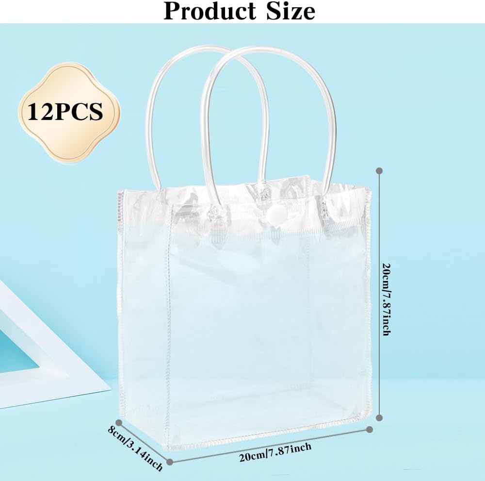 CONFEZIONE DEL PRODOTTO: Riceverai 12 sacchetti regalo trasparenti con manici, dimensioni 13X15X7 cm, sufficienti per l'uso quotidiano e come confezione regalo. IMPERMEABILI E RIUTILIZZABILI: questi sacchetti regalo riutilizzabili sono realizzati in materiale PVC, impermeabile, facile da pulire, resistente e durevole. Il materiale è morbido ma non deformabile, quindi puoi usarlo a lungo senza usura o danni. OTTIMO DESIGN TRASPARENTE: la borsa tote trasparente ha un design trasparente che ti consente di sfogliare rapidamente il contenuto della borsa e trovare facilmente ciò di cui hai bisogno. La parte superiore ha una chiusura a scatto per evitare che gli oggetti scivolino fuori. FACILE DA TRASPORTARE: il sacchetto regalo in plastica impermeabile è facile da trasportare e facile da aprire e chiudere con una chiusura a scatto. Puoi metterlo in una borsa grande o portarlo da solo, perfetto per viaggiare, fare shopping o per l'uso quotidiano. UTILIZZO VERSATILE: Il sacchetto regalo trasparente è perfetto per oggetti come bambole, calzini, guanti, sciarpe, cibo, articoli di moda, cosmetici, profumi, regali per baby shower, caramelle, biscotti, ecc. È il sacchetto regalo perfetto per compleanni, festival, feste, matrimoni, addio al nubilato, lauree, San Valentino, Halloween, Natale, Pasqua, festa della mamma, festa del papà e così via.