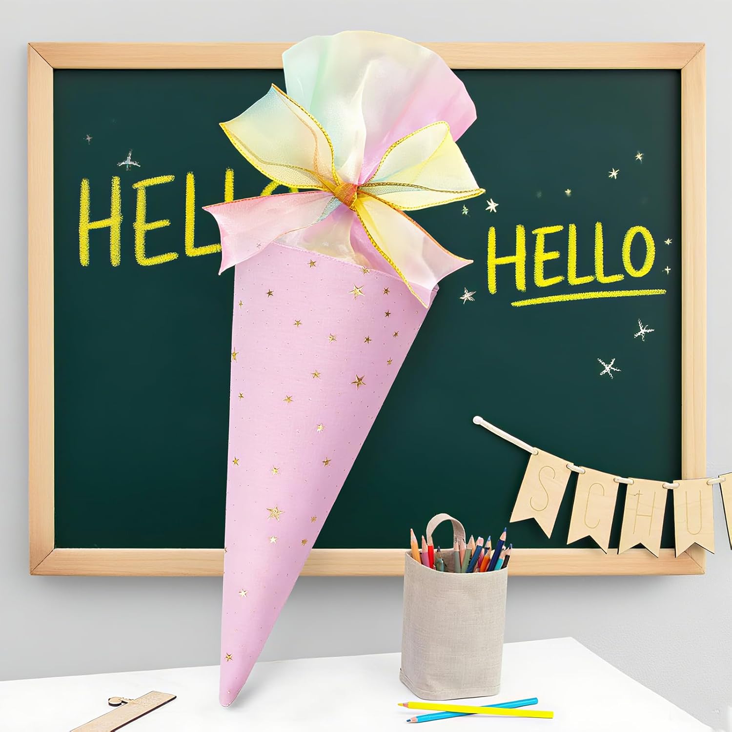 Pratica chiusura in tessuto: consente una facile apertura e chiusura, perfetta per conservare al sicuro i regali scolastici. Tubo di carta conico, circa 28 cm di altezza, legato in alto con un nastro o una corda attorcigliata per preservare la tradizionale sensazione cerimoniale del cono scolastico. Dimensioni generose: con un'altezza di 28 cm, questo cono per la scuola offre ampio spazio per caramelle, penne e altre piccole sorprese che abbelliscono l'inizio della scuola, pratica chiusura in tessuto, consente una facile apertura e chiusura, perfetto per conservare in modo sicuro i regali scolastici. Tubo di carta conico, circa 30 cm di altezza, legato in alto con un nastro o una corda attorcigliata per preservare la tradizionale sensazione cerimoniale del cono scolastico. Riutilizzabile: questo mini cono per la scuola per bambini è realizzato in cotone di alta qualità, durevole e non facile da danneggiare, con accenti luminosi a stelle e viene fornito con fiocco, lavabile e riutilizzabile, ideale come piccolo regalo per la scuola dei fratelli. Design accattivante: 2 sacchetti per la scuola in tessuto, misura 28 cm, colore rosa/turchese, realizzati in tessuto resistente, senza chiusura a nastro. L'attraente motivo rosa e con pois divertenti e stelle attirano l'attenzione e entusiasmano i bambini quando si entra a scuola. Uso versatile: questo cono per la scuola piccolo per ragazzi e ragazze, per l'inizio della scuola, la scuola 1. Accessori per feste per la scuola, regalo di addio all'asilo o piccolo regalo per gli amici della scuola, compleanni, Natale o feste per bambini, per regalarli un giorno indimenticabile, ideale come regalo unico per l'inizio della scuola, come accessorio affascinante in costume o come soluzione creativa per riporre diversi oggetti a casa.