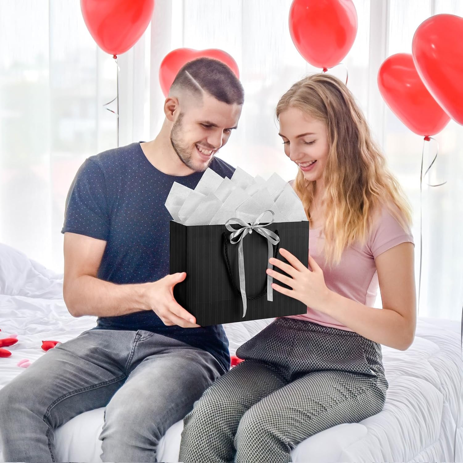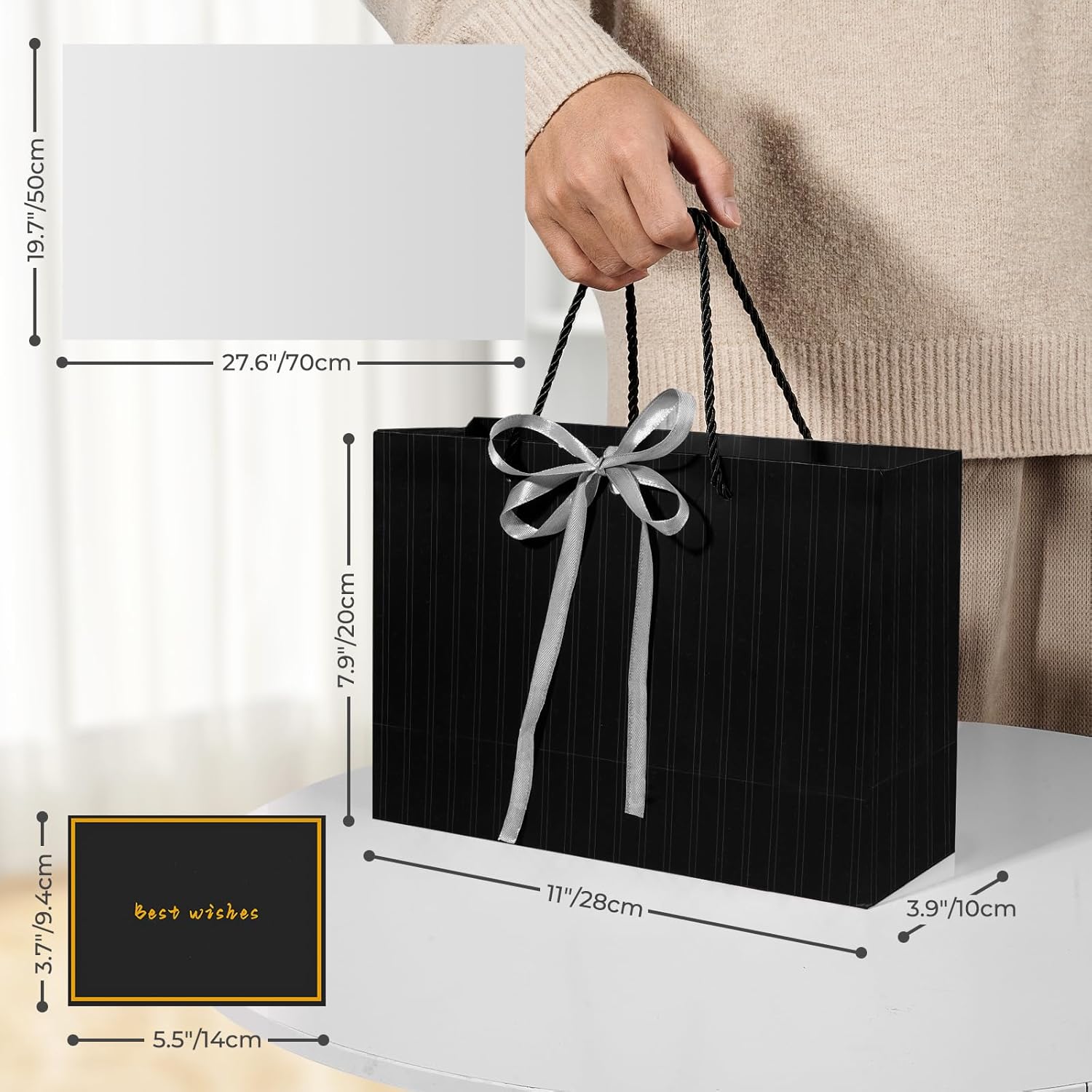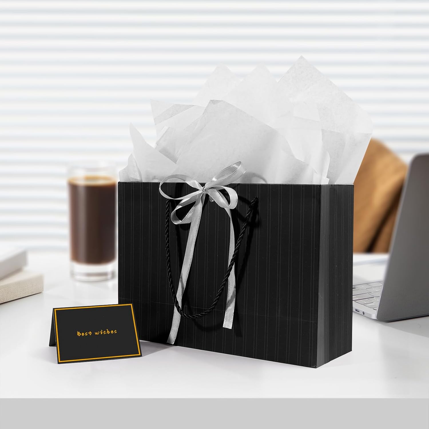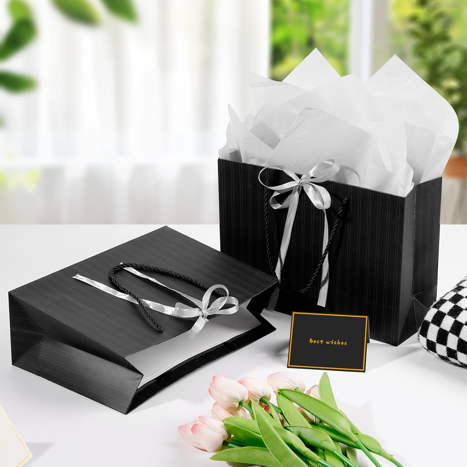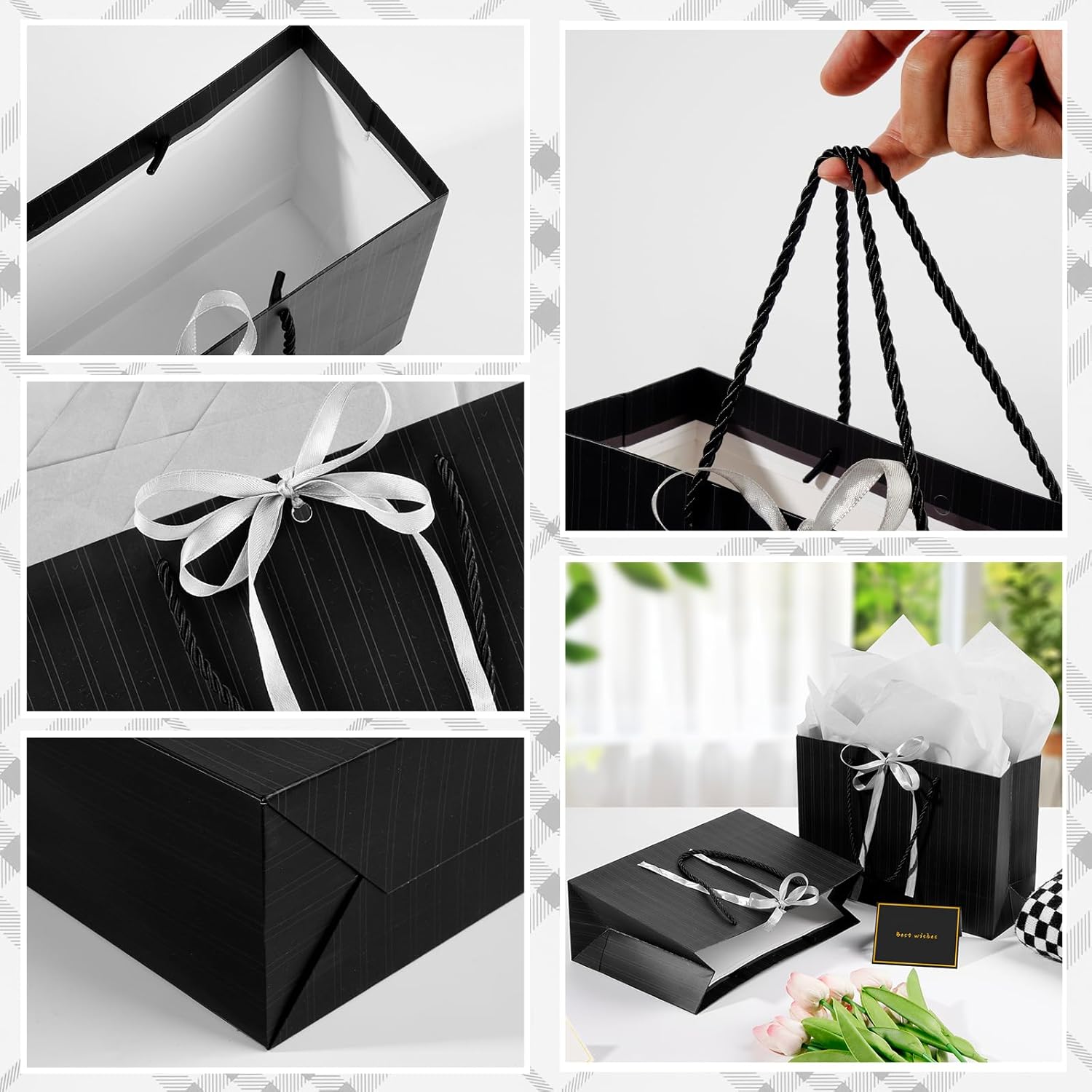 🌈 Sacchetti regalo medi per regali - Il sacchetto regalo per donna e uomo misura 28 cm (A) x 10 cm (L) x 20 cm (L), il che è perfetto per regali di medie dimensioni. Inoltre ci sono 2 veline per decorare i tuoi regali e 2 biglietti di auguri per scrivere i tuoi migliori auguri ai tuoi cari familiari o amici. DESIGN ELEGANTE: i sacchetti regalo in carta sono semplici ma in stile senior. Questa elegante borsa regalo viene fornita con un nastro per fare un nodo e dare al tuo regalo una finitura lussuosa. I sacchetti regalo compleanno in carta sono semplici ma delicati, con manici e fiocco. BUONA QUALITÀ E DUREVOLE - Questi sacchetti regalo di carta sono realizzati in cartone spesso e di alta qualità, il fondo e le maniglie hanno rinforzi aggiuntivi, durevoli e robusti, facili da trasportare e non facili da strappare. Questa è la scelta migliore per confezionare regali. Adatto a molte occasioni: con il suo design elegante, il sacchetto regalo in tinta unita può essere utilizzato per ragazzi/ragazze, bambini, donne adulte o anziani. Questi sacchetti regalo belli e resistenti forniscono un tocco di lusso in più per i tuoi regali ed eventi sociali come baby shower, matrimoni, fidanzamenti, feste di compleanno, addio al nubilato, boutique, Natale, Capodanno ecc. Il pacchetto include: Riceverai 2 sacchetti regalo con design a strisce nere, 2 buoni regalo e 2 carta velina. Ogni sacchetto regalo è accompagnato da carta velina, che aggiunge un ulteriore livello di eleganza e sorpresa quando viene scartato. È ideale per regali di medie dimensioni per anniversari, addii al nubilato, rientro a scuola, congratulazioni, damigelle d'onore, testimoni dello sposo, celebrazioni, lauree, 18°, 20°, 50° compleanno, San Valentino.