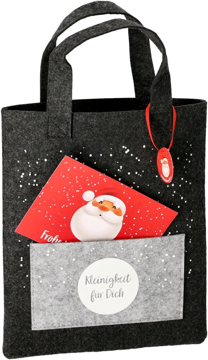 La dimensione di ogni borsa è di ca. 26 cm x 21 cm x 0,9 cm (altezza x larghezza x profondità) Materiale: feltro (poliestere) - Colore: antracite / grigio Stabile borsa regalo in robusto feltro Motivo "Qualcosa per te" con ampia tracolla in feltro incluso un biglietto di auguri di Natale