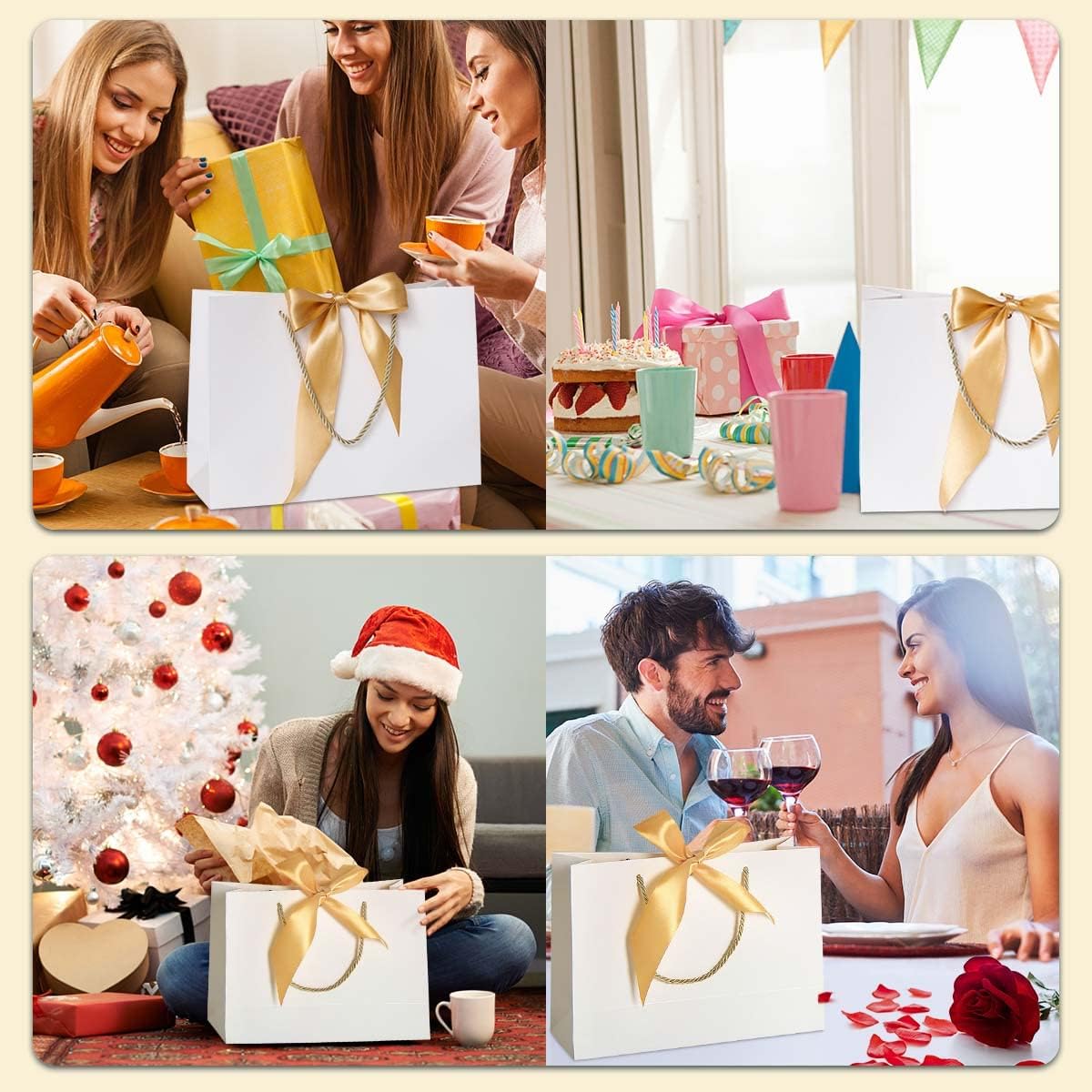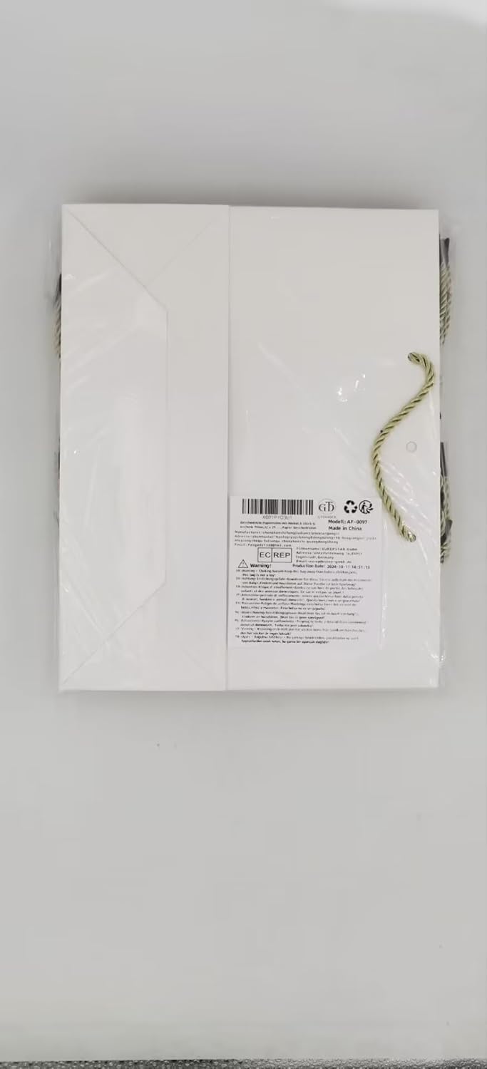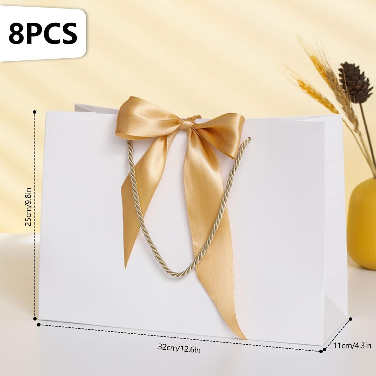 La confezione contiene: 8 sacchetti regalo bianchi (dimensioni 32 x 25 x 11 cm). Durevole: realizzato in materiale ecologico di alta qualità, realizzato con una lunga durata, riutilizzabile. Design: il fiocco non solo aggiunge un bellissimo tocco finale, ma arricchisce anche il tuo regalo e lo rende straordinario. Qualità: il sacchetto regalo è realizzato in carta spessa di alta qualità e un manico in corda intrecciata, il fondo piatto può sostenere bene, è robusto e durevole e può essere utilizzato ripetutamente. Ampiamente usato: sacchetti regalo dall'aspetto elegante, per matrimoni, baby shower, feste di compleanno, Natale, San Valentino.