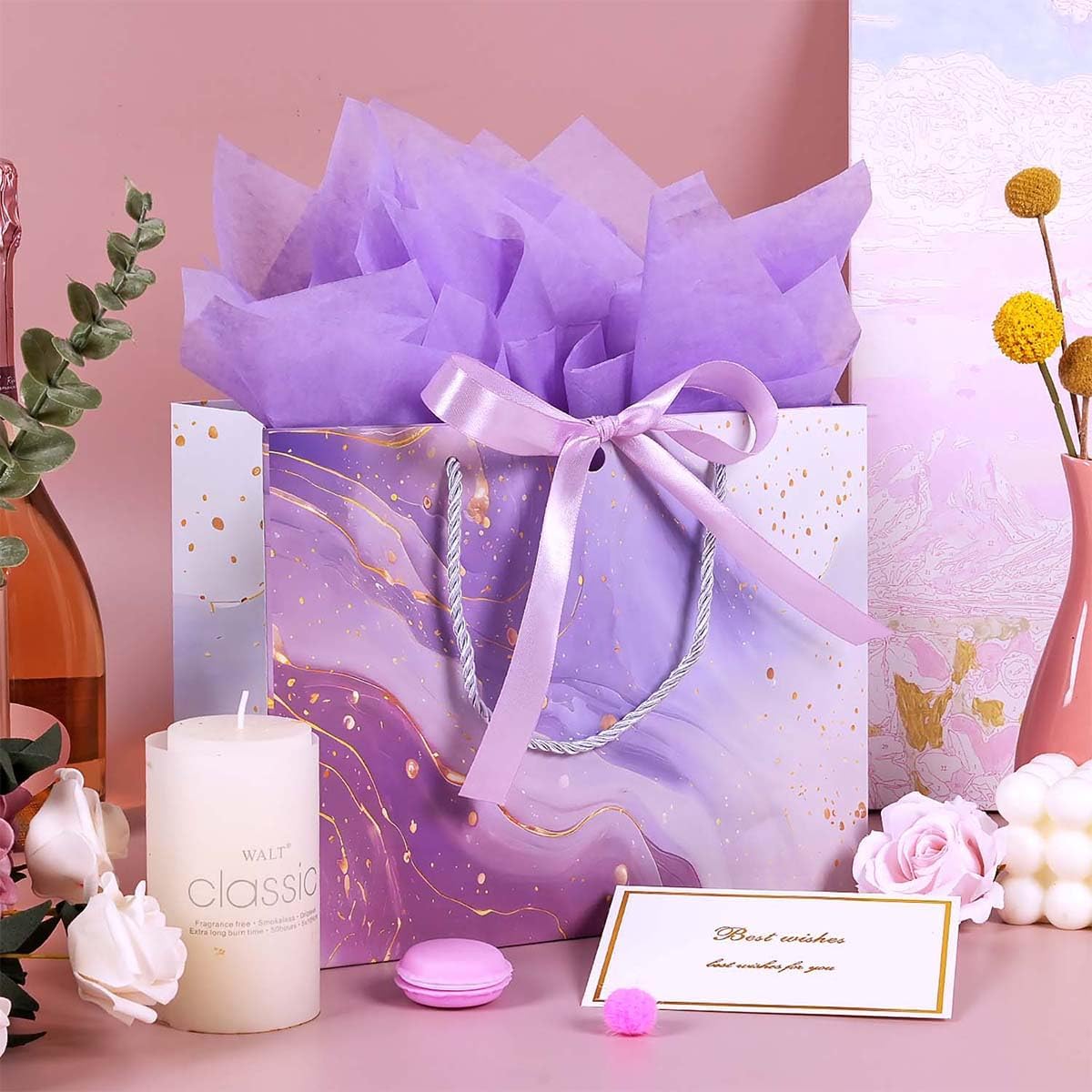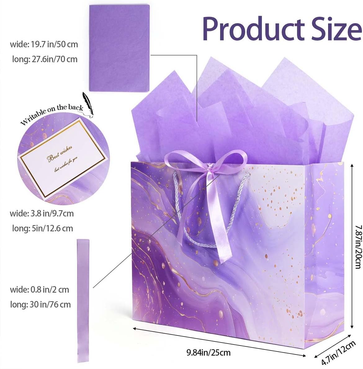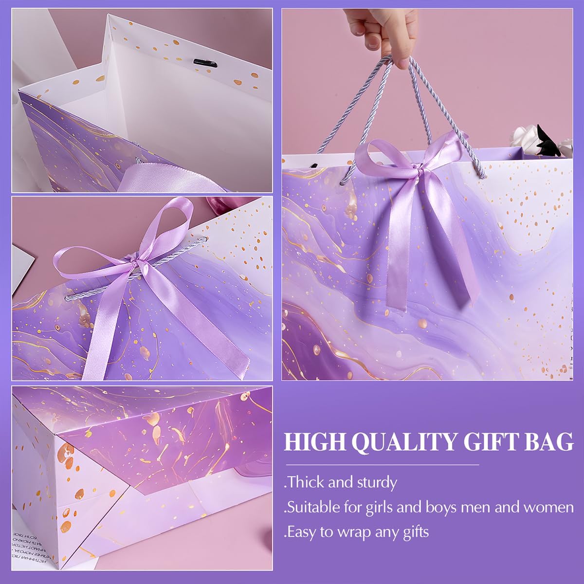 Set di sacchetti regalo viola scintillanti: il set di sacchetti regalo comprende 2 sacchetti regalo viola, 2 biglietti di auguri e 4 carta velina, completi di manici in corda bianca e nastro viola, alla moda e graziosi, ottimi per confezioni regalo di piccole e medie dimensioni o decorazioni per qualsiasi evento speciale. Busta regalo media: le buste regalo misurano 25 x 20 x 12 cm. La carta velina misura 50 x 70 cm. Il biglietto d'auguri misura 12,6 x 9,7 cm. Il bellissimo aspetto rende il tuo regalo elegante e risalta. Sacchetti regalo viola e oro: il sacchetto regalo presenta un bellissimo design in marmo con una leggera lucentezza metallica, elegante e lussuoso, adatto a bambini, ragazze e donne. Materiale di alta qualità: il sacchetto di carta è realizzato in materiale di alta qualità con superficie liscia e colori brillanti. La base è rinforzata per sopportare pesi maggiori senza doversi preoccupare che si rompano. Tutte le occasioni: i sacchetti regalo sono pratici e perfetti per compleanni, matrimoni, baby shower, San Valentino, festa della mamma, anniversari, Capodanno, Natale e altre occasioni speciali.