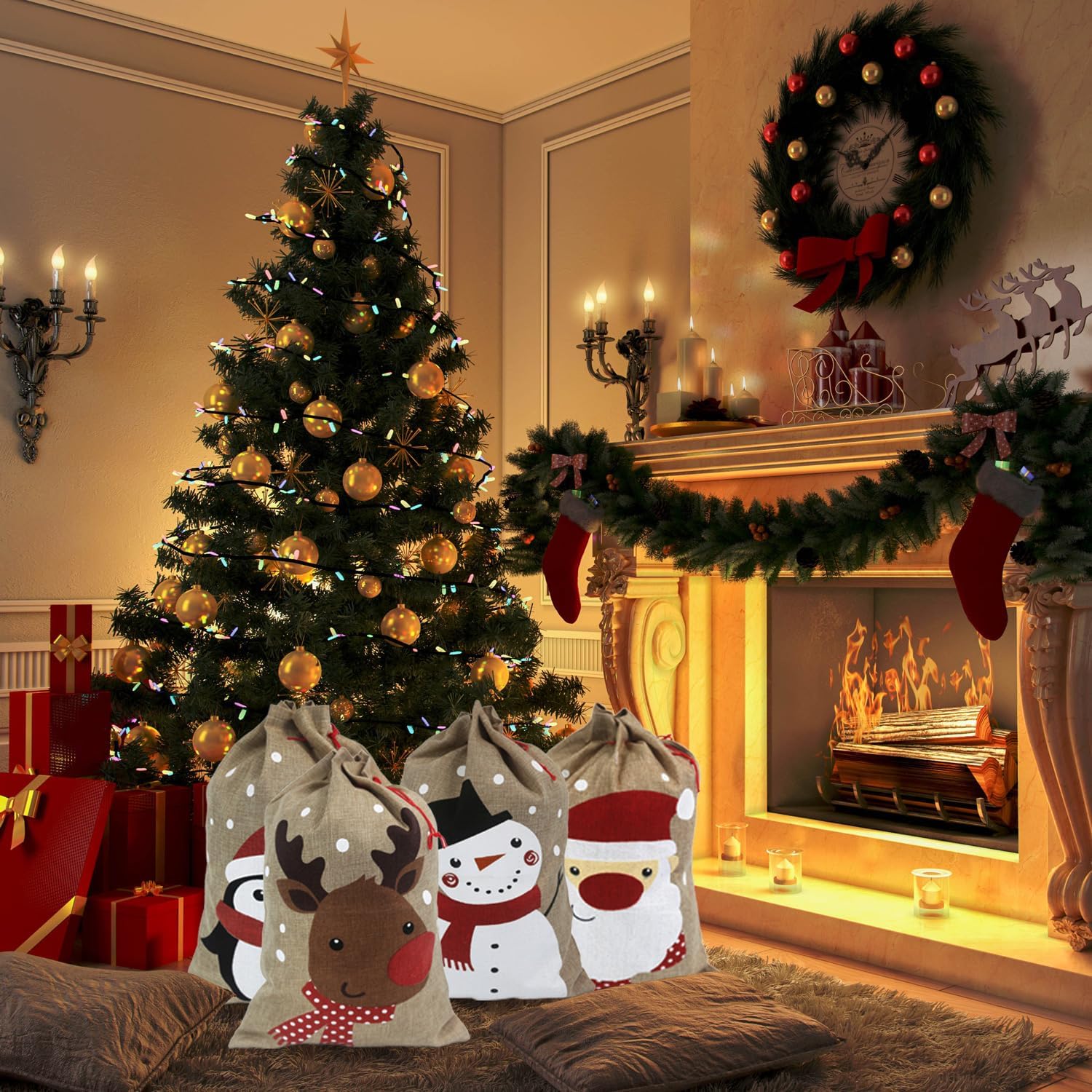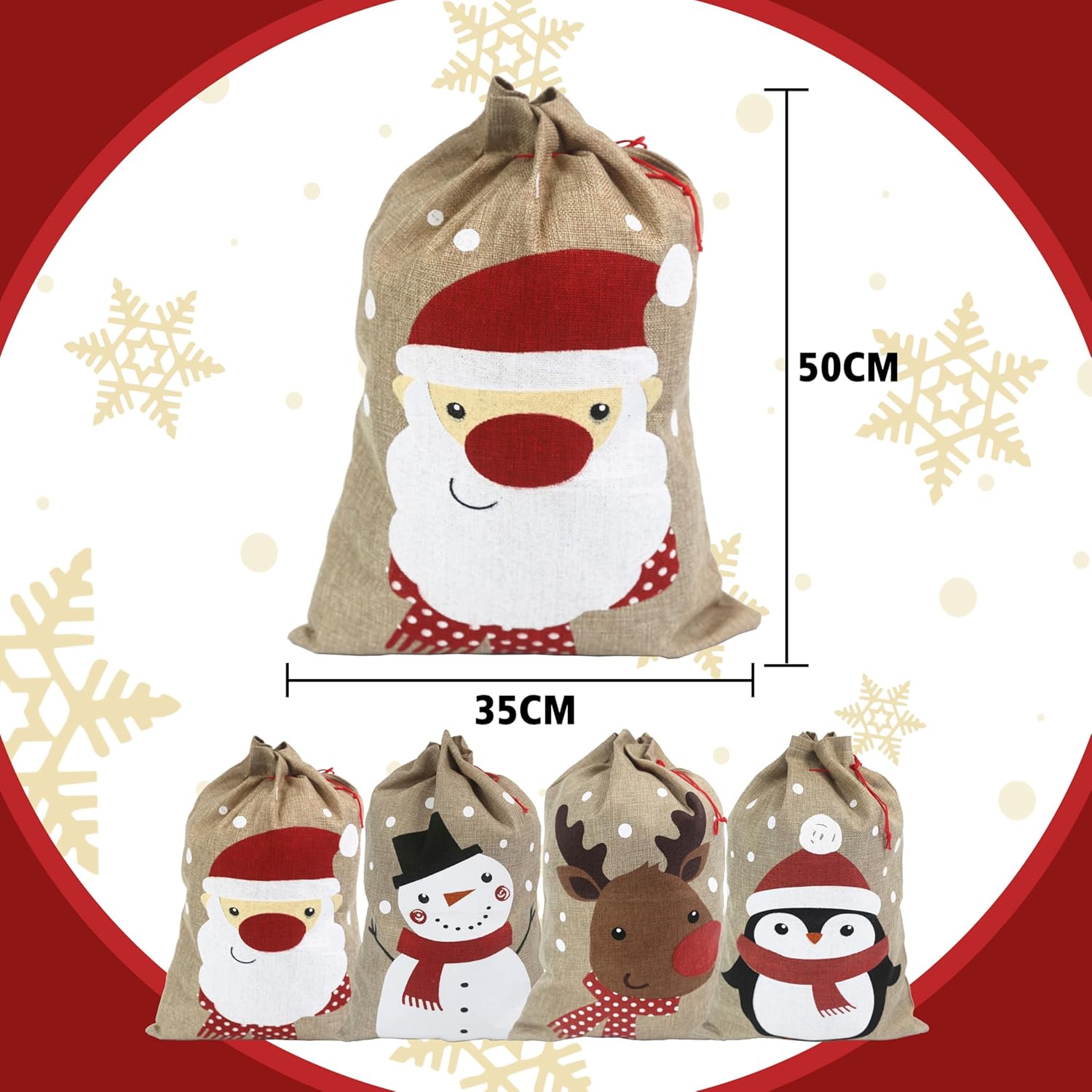 CONFEZIONE DA 4 - La confezione contiene 4 sacchetti di iuta con cordoncino realizzati in finta iuta. Ogni borsa ha un design natalizio diverso con Babbo Natale, pupazzo di neve, renna e pinguino. Lasciati contagiare dallo spirito natalizio e diffondi la gioia del Natale con questi simpatici sacchetti regalo in iuta. MASSIMA QUALITÀ – Le borse sono realizzate in poliestere di alta qualità con eccellente durata e traspirabilità. Il materiale sostenibile è ecologico e riciclabile, il che lo rende un'ottima alternativa alla carta da imballaggio usa e getta e ai sacchetti di plastica. DIMENSIONE MEDIA - Le nostre borse con coulisse misurano 35 x 50 cm. Sono adatti ai bambini e ogni sacchetto ha spazio sufficiente per una varietà di regali come vestiti, libri, dispositivi elettronici, ecc. Riempili con dolci e regali per far risaltare il tuo regalo sotto l'albero di Natale. DESIGN NATALIZIO - Ogni borsa ha un design natalizio diverso, che la rende ideale per le festività natalizie. Questi possono essere i migliori sacchetti regalo con coulisse di Natale. Non devi perdere tempo a imballare singoli articoli. Metti semplicemente i tuoi regali nella borsa e usa i lacci per chiudere l'apertura. Ciò mantiene gli oggetti al sicuro e facilmente accessibili. RIUTILIZZABILI – A differenza della carta da regalo, i sacchetti regalo con cordoncino sono riutilizzabili e abbastanza resistenti per un uso a lungo termine. Puoi usarli anche dopo il periodo natalizio. Se necessario, basta pulire i sacchetti.