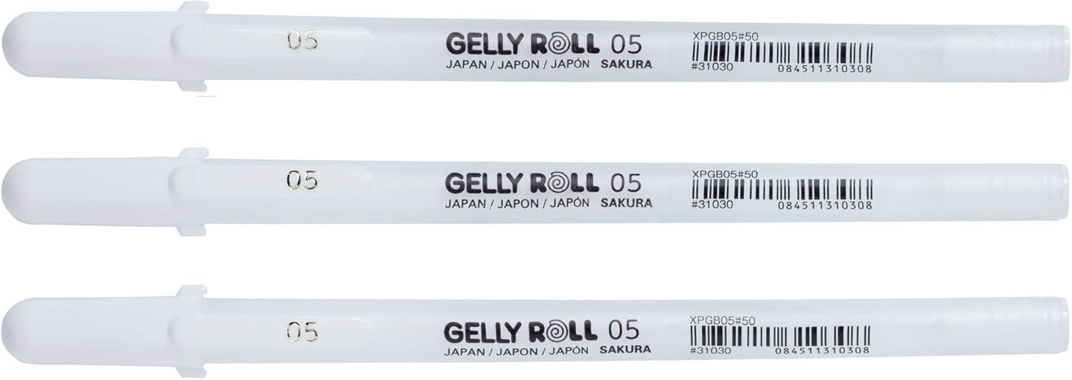 Gelly Roll Basic White: set di 3 penne numero 05 nella tonalità di colore bianco brillante. Gelly Roll Bright White: 3 penne roller a inchiostro gel, colore bianco brillante. Vera tecnica gel originale con pigmenti a base d'acqua. L'inchiostro gel pigmentato con flusso costante di inchiostro, non sbiadisce. Qualità elevata di Sakura Japan.