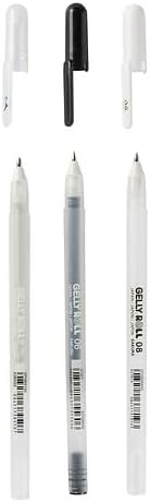 Flusso costante dell’inchiostro fino all’ultimo tratto, il che le rende adatte per la scrittura a mano. L’inchiostro speciale Gelly Roll è progettato per non lasciare sbavature, macchie, trapassare documenti, e per essere resistente allo sbiadimento e impermeabile. Queste penne sono perfette per disegnare e colorare e sono adatte per la maggior parte dei tipi di carta, tra cui carta chiara e scura, finitura opaca o lucida, carta per foto e la maggior parte delle carte patinate. Le penne Gelly Roll soddisfano gli standard ACMI, sono atossiche e non sono raccomandate per l’uso su tessuti destinati a essere lavati. Inoltre non sono raccomandate per l’uso cosmetico sulla pelle. Questo set contiene tre penne: una di colore bianco (tratto da 0,8 mm), una di colore nero (0,6 mm) e una trasparente.