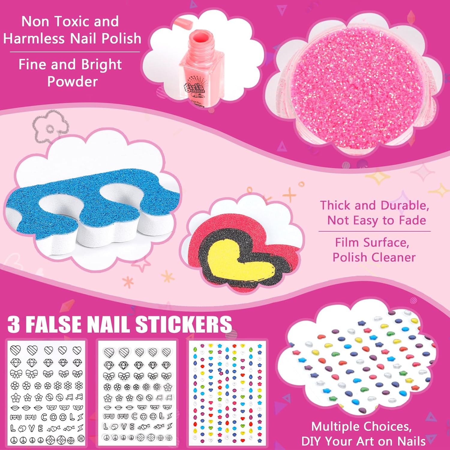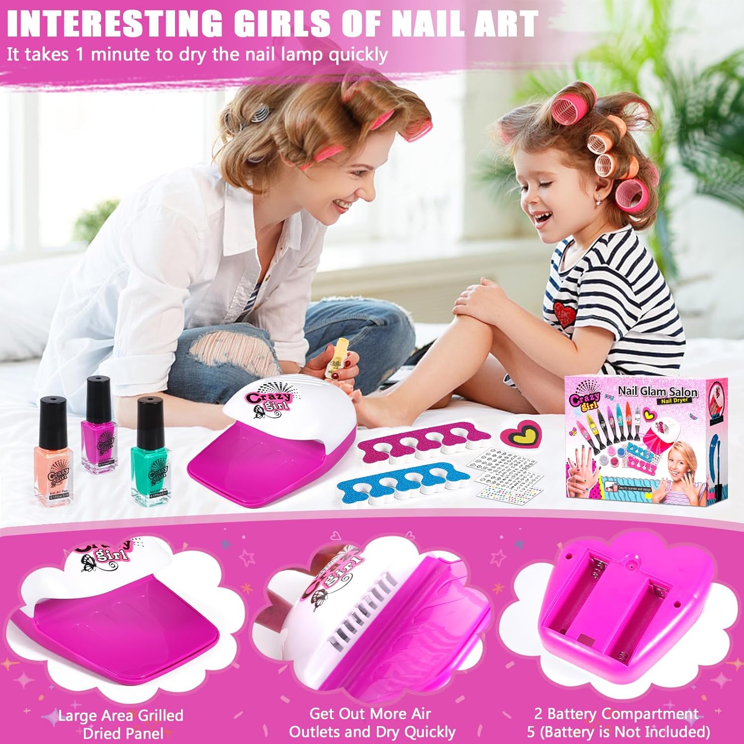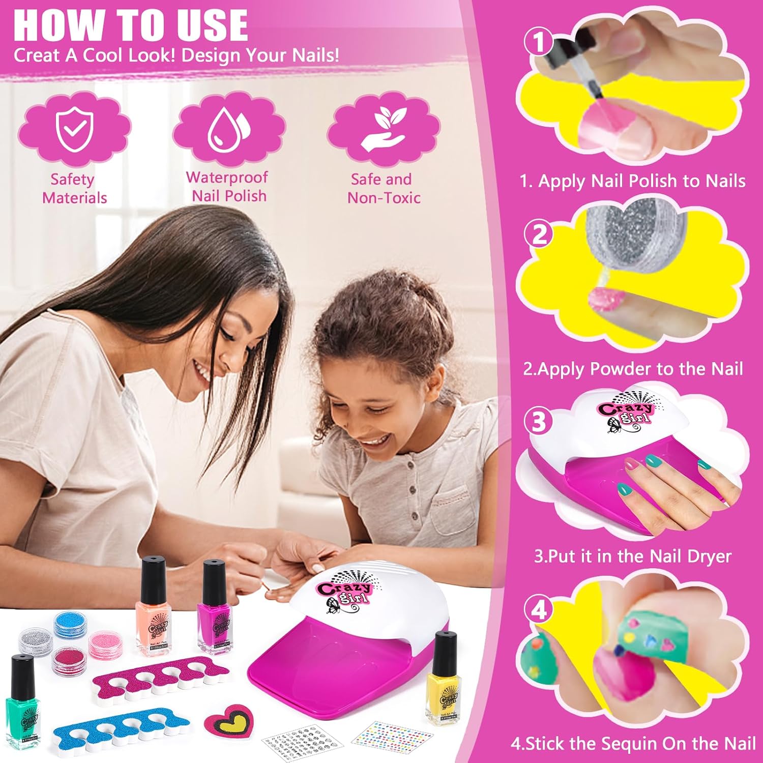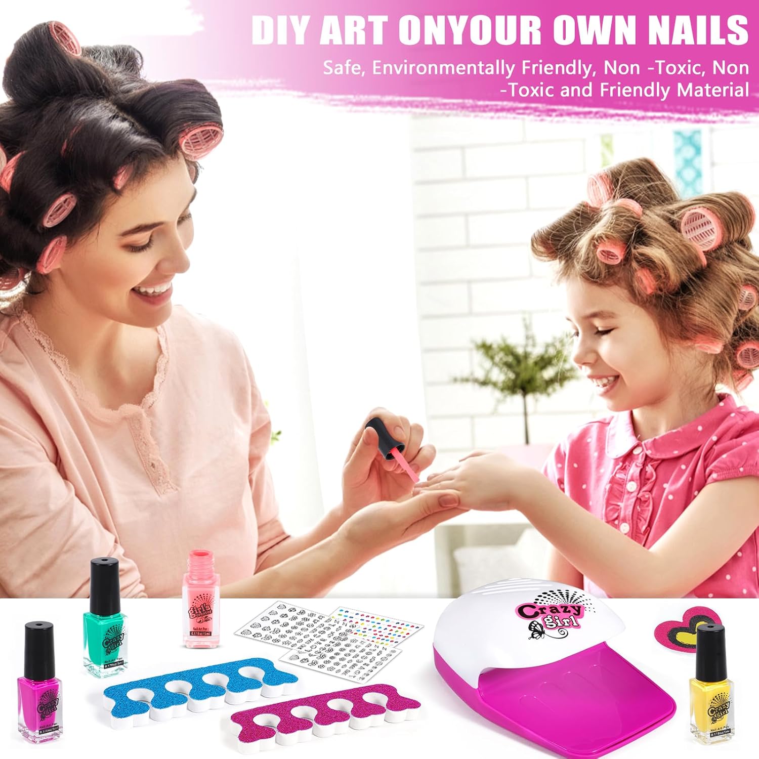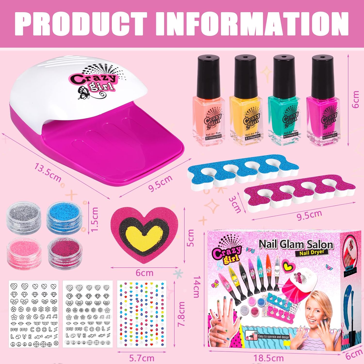 【Set Nail Art】 Ogni ragazza vuole essere bella, anche le unghie semplici. Questo set manicure è appositamente progettato per le ragazze dai 6 ai 12 anni. I bambini possono divertirsi ad essere belli come la mamma. Il nostro ricco set di nail art per ragazze con smalto colorato, adesivi e asciugacapelli consente alle bambine di progettare da sole bellissime manicure, migliorando le loro capacità motorie e l'estetica visiva. 【Smalto per unghie sicuro e colorato】 Smalto per unghie a base d'acqua in 4 colori da 50 ml, non tossico, facile da staccare dalle unghie e dalla pelle, più comodo da usare per i bambini rispetto allo smalto tradizionale. La tua bambina o bambino potrà facilmente colorare e cancellare gli errori. Non sono necessari prodotti chimici per rimuovere la nail art e i tuoi bambini potranno divertirsi durante il fine settimana. 【Asciugatore rapido per unghie】 Facile da usare, il mini asciuga unghie è facile da usare, non solo può asciugare rapidamente le unghie, ma aggiunge anche divertimento per decorare la nail art quando amici e familiari sono in vacanza. Le tue unghie saranno modellate dal vento entro 15 secondi, prevenendo danni alla nail art prima della decorazione o del gioco. 【Set Nail Art per Ragazze】 Smalto per bambini in 4 colori + 4 polveri glitter + 1 asciugacapelli per unghie (batteria non inclusa) + 2 separatori per dita + 1 lima per unghie a forma di cuore + 2 adesivi + 1 adesivo con diamante. Le ragazze possono liberare la loro immaginazione e creatività e progettare più di 200 manicure alla moda. Rendi i set per manicure più divertenti e più facili. 【Regali creativi per ragazze dai 6 ai 12 anni】 Set manicure perfetto come regalo per ragazze di 6, 7, 8, 9, 10, 11 e 12 anni. I bambini saranno impegnati a farsi manicure e pedicure per sé e per i loro amici. Ottima idea regalo per compleanni di ragazze, vacanze, vacanze estive, regali per feste, premi scolastici e qualsiasi altra occasione di regali.