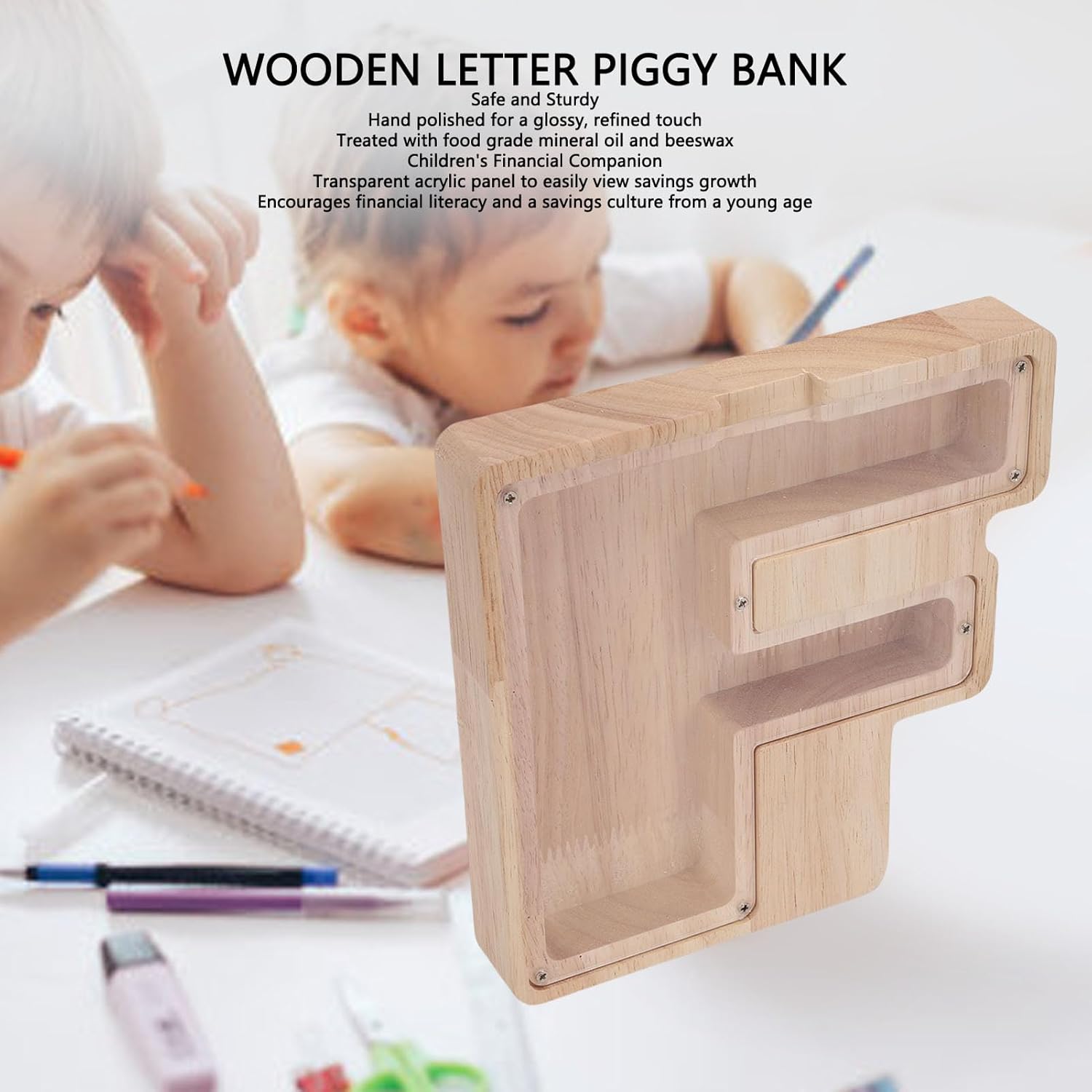 Sicurezza e durata: questa banca di lettere in legno è realizzata in legno di gomma utilizzando la tecnologia CNC per una costruzione senza soluzione di continuità e robusta. Plaimato a mano e trattati con olio minerale di grado alimentare e Beewax, garantisce una finitura lucida senza vernice, rendendo questo scatola di risparmio per bambini sicuro per l'uso quotidiano. Strumento di apprendimento finanziario: il pannello acrilico trasparente della scatola di denaro Alphabet consente ai bambini di monitorare visivamente la crescita del risparmio, promuovendo le prime capacità di gestione del denaro. Il suo design riutilizzabile incoraggia un'abitudine di risparmio costante mentre funge da giocattolo educativo coinvolgente. Pronto interattivo e a sorpresa: personalizza la scheda acrilica di questa banca per bambini con marcatori a base d'acqua per l'espressione. Ideale come ricordo per compleanni, vacanze o eventi scolastici, attraente sia per ragazzi che per le ragazze. Design multiuso: con ampio stoccaggio e una base ponderata, questo salvadanaio in legno rimane stabile su qualsiasi parte superiore. La sua costruzione robusta raddoppia come supporto per carta decorativa o contenitore di snack, mescolando funzionalità con l'estetica. Riutilizzabile e decorativo: progettato per la longevità, questo barattolo di risparmio alfabetico presenta viti rimovibili per un facile accesso al denaro senza danni. La sua finitura in legno completa gli scaffali della scuola materna o gli spazi abitativi come un pezzo di arredamento affascinante.
